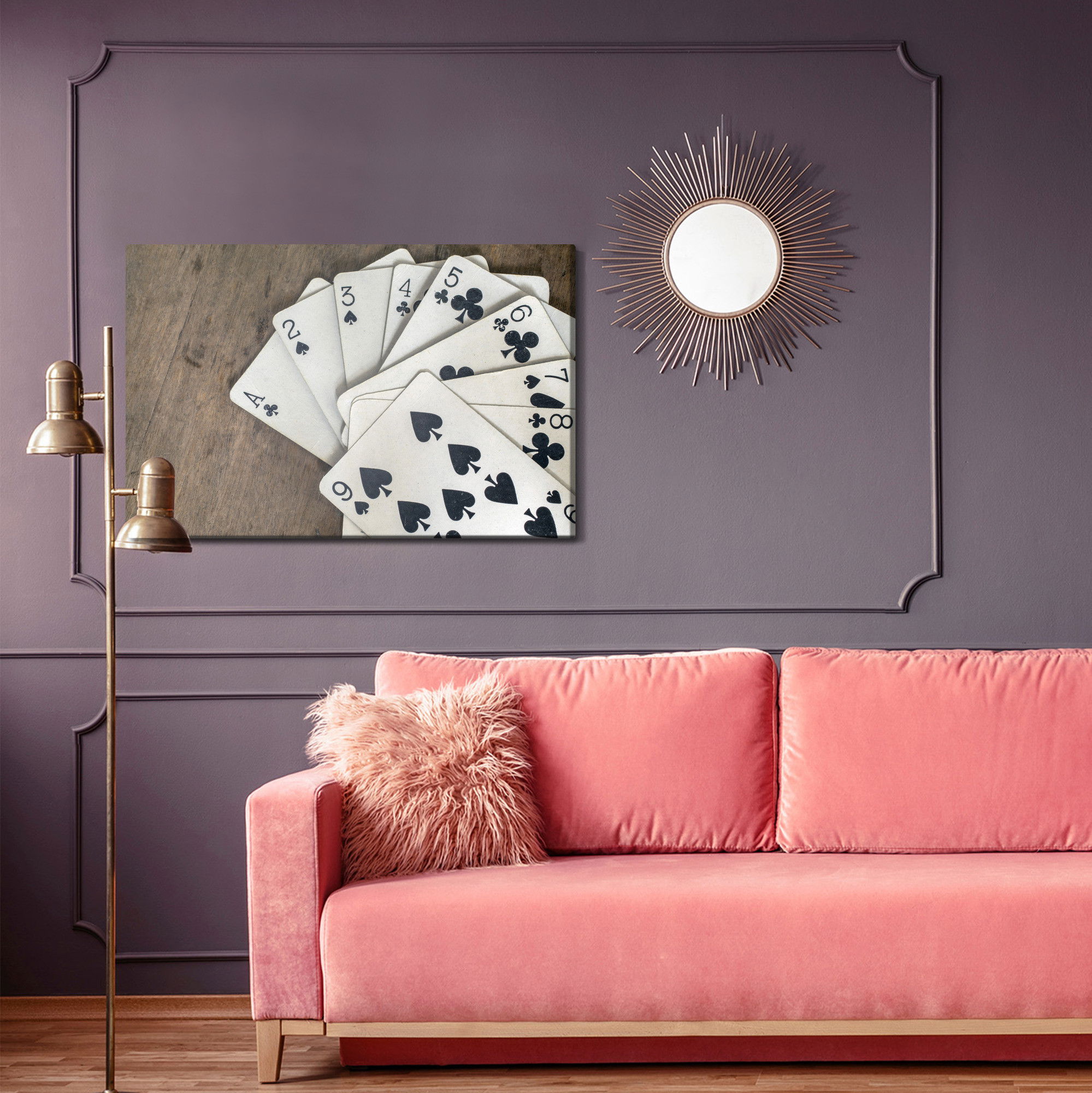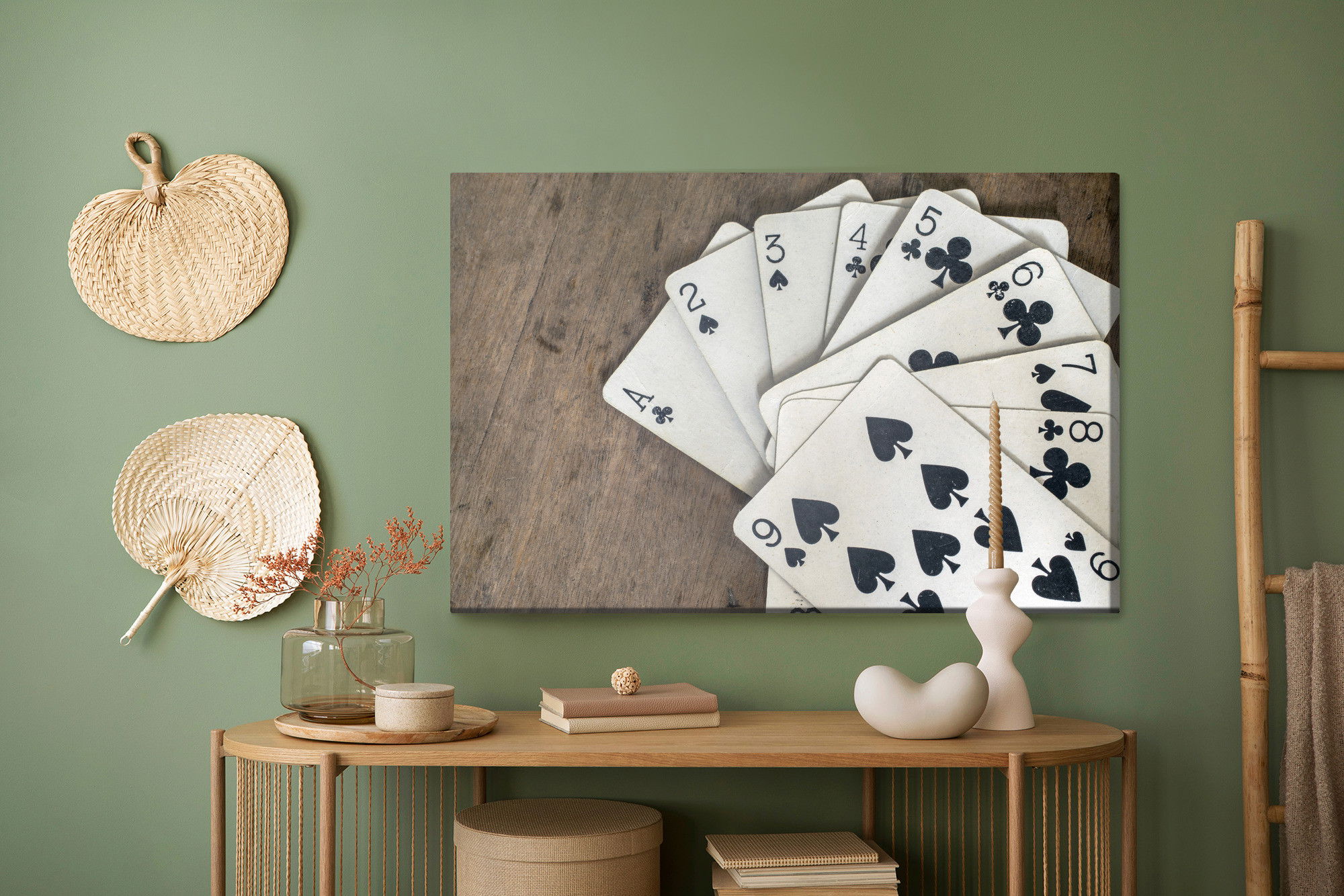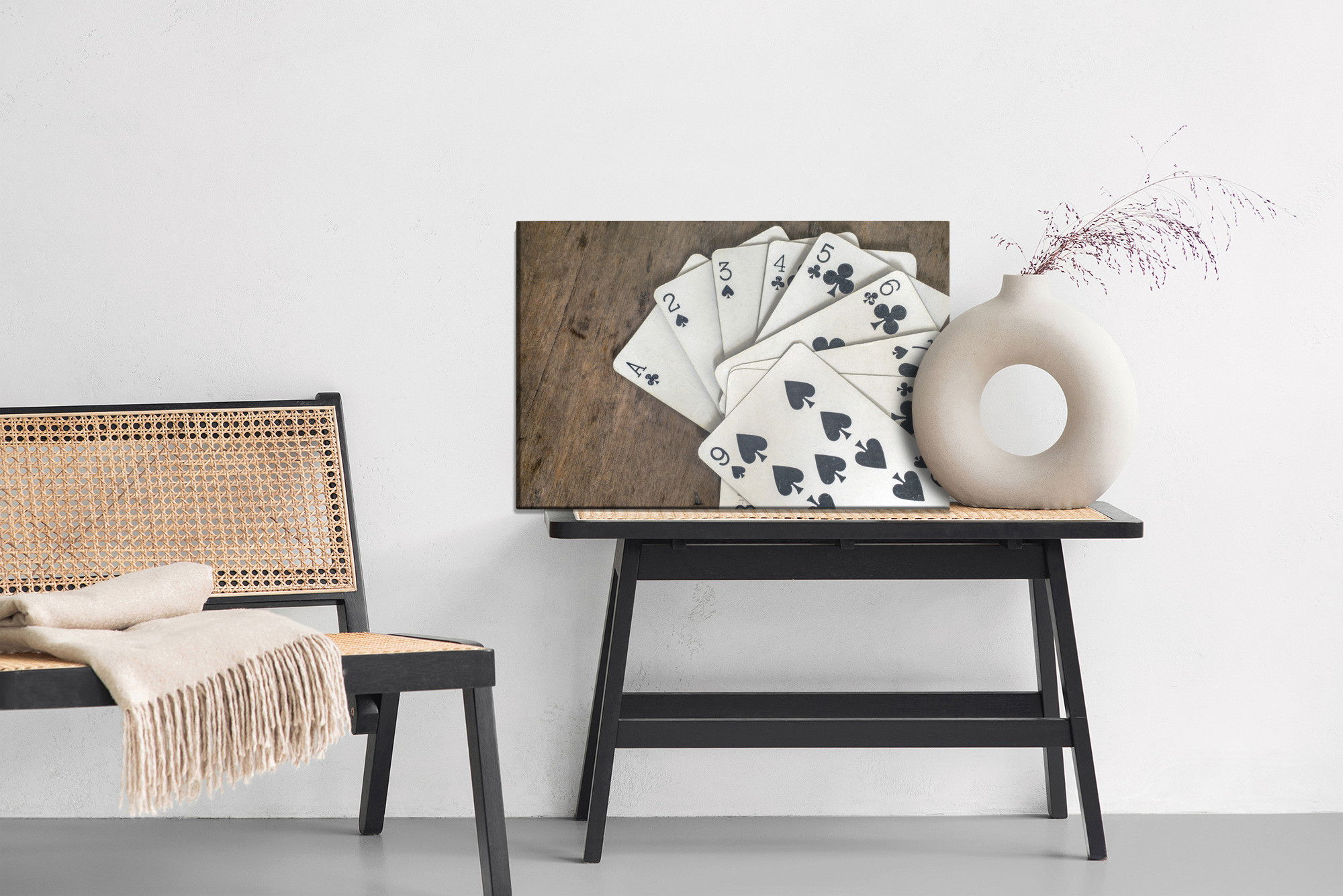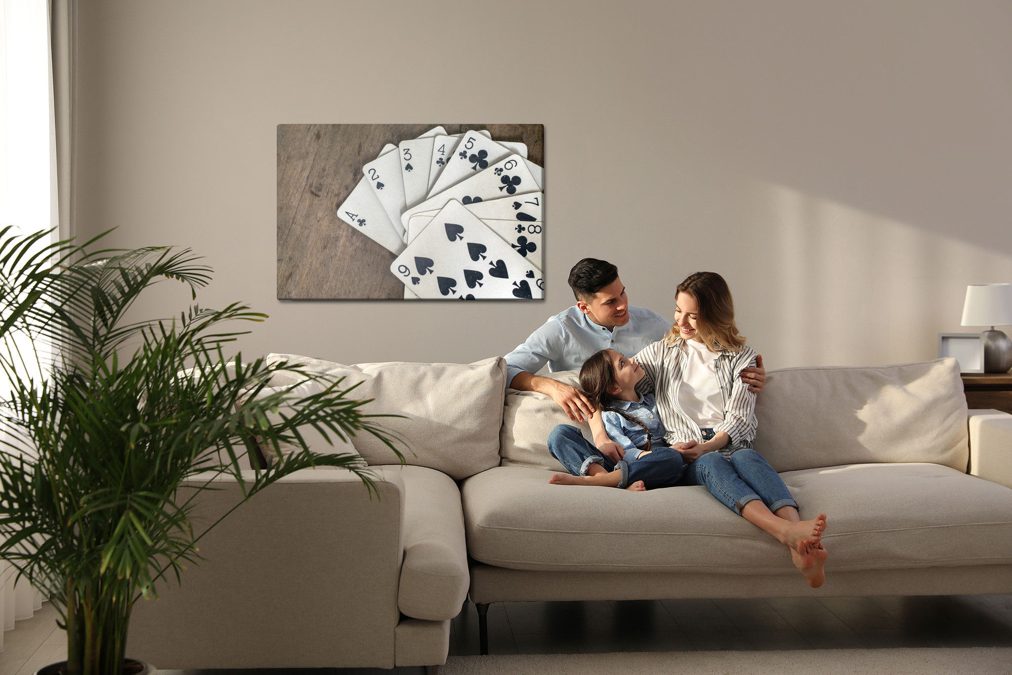 Varje tavla monteras på en massiv fururam. Format upp till 70×50 cm har en ram på 15 mm, medan format från 90×60 cm och uppåt har en ram på 20 mm. Den exakta dukspänningen gör att tavlan håller sin form över tid. Motivet Cards with black symbols trycks runt hela ramen vilket ger ett stilrent galleriuttryck där tavlan är lika vacker från sidan som framifrån. Kombinationen av rak dukspänning, rena linjer och korrekt tryck ger en professionell finish.