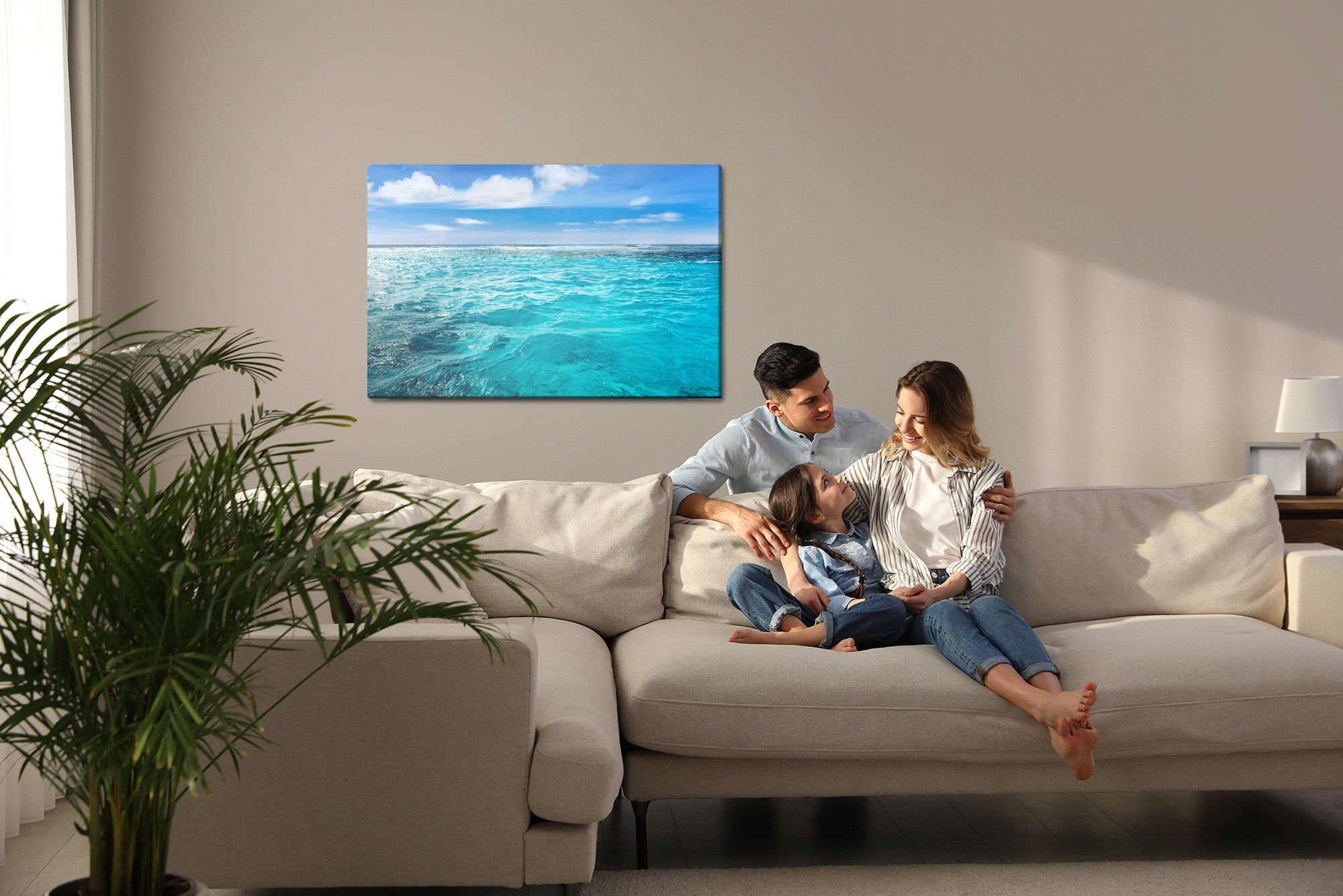 Motivet Caribbean sea and sky återges med hög färgprecision och detaljrikedom tack vare HP Latex-teknologi. Trycket sker med vattenbaserade, luktfria och GREENGUARD Gold-certifierade bläck som ger en upplösning på upp till 300 DPI. Färgerna är UV-beständiga och behåller sin styrka även i ljusa rum, vilket gör tavlan lämplig för både hem- och offentliga miljöer.