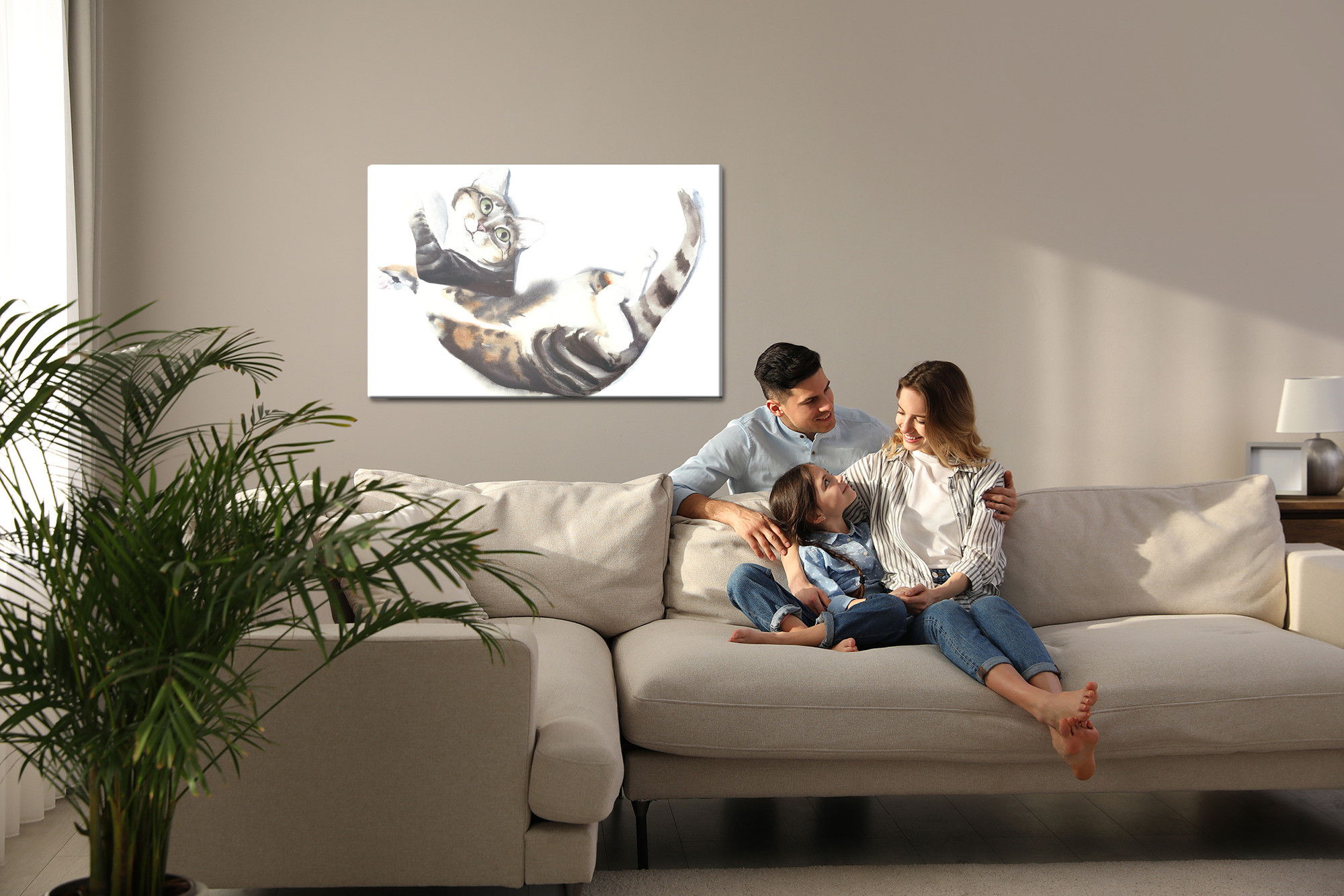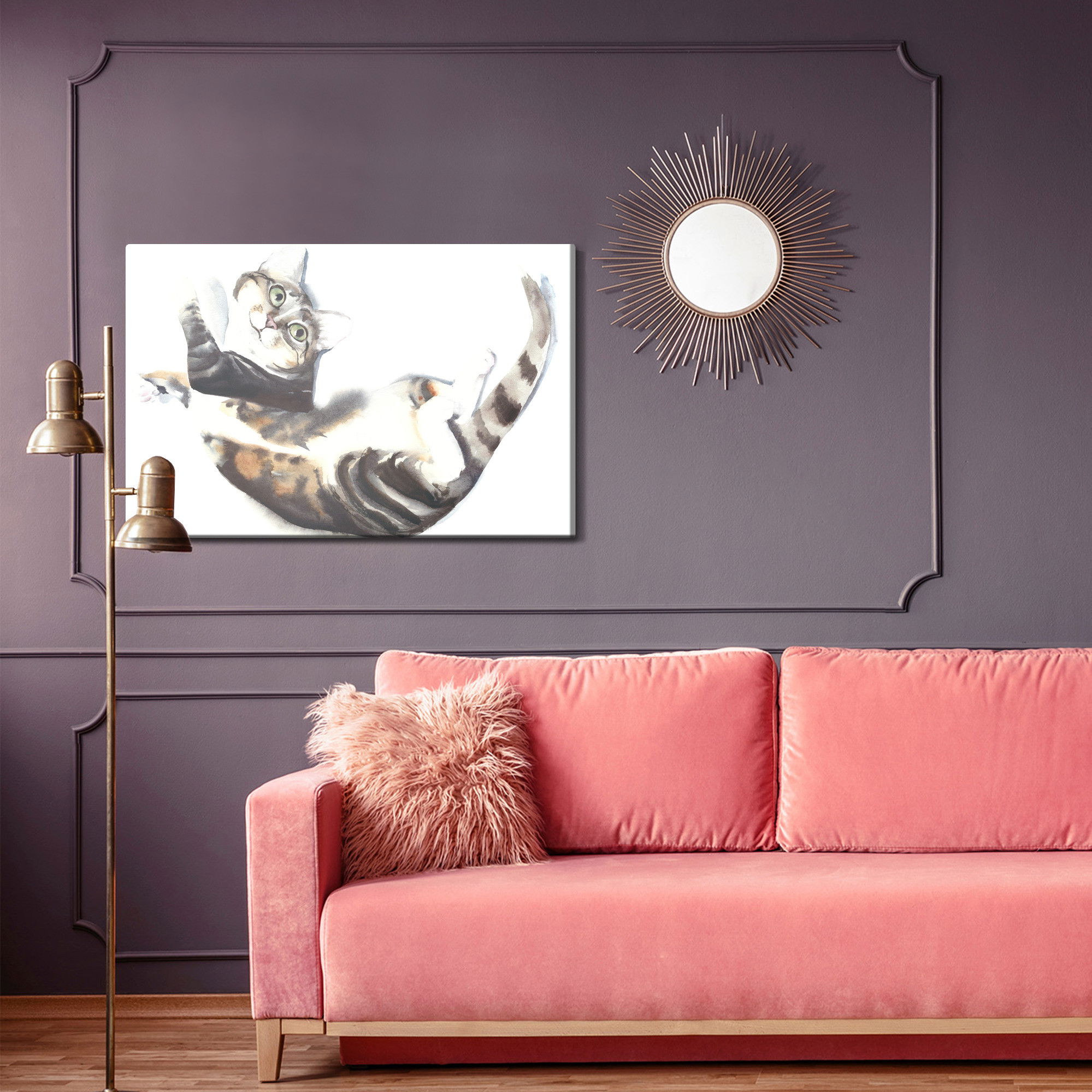 Varje tavla monteras på en massiv fururam. Format upp till 70×50 cm har en ram på 15 mm, medan format från 90×60 cm och uppåt har en ram på 20 mm. Den exakta dukspänningen gör att tavlan håller sin form över tid. Motivet Cat painted with watercolor trycks runt hela ramen vilket ger ett stilrent galleriuttryck där tavlan är lika vacker från sidan som framifrån. Kombinationen av rak dukspänning, rena linjer och korrekt tryck ger en professionell finish.