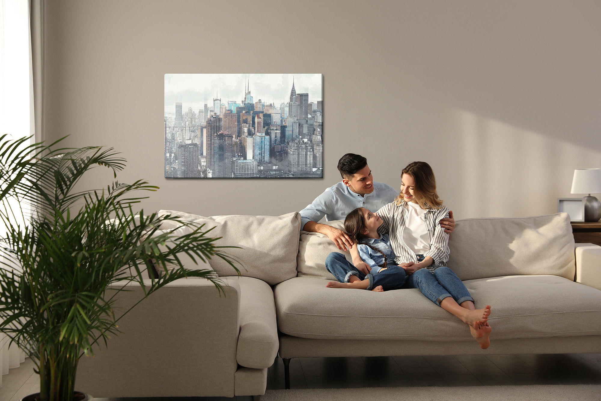 Varje tavla monteras på en massiv fururam. Format upp till 70×50 cm har en ram på 15 mm, medan format från 90×60 cm och uppåt har en ram på 20 mm. Den exakta dukspänningen gör att tavlan håller sin form över tid. Motivet City panorama of New York trycks runt hela ramen vilket ger ett stilrent galleriuttryck där tavlan är lika vacker från sidan som framifrån. Kombinationen av rak dukspänning, rena linjer och korrekt tryck ger en professionell finish.