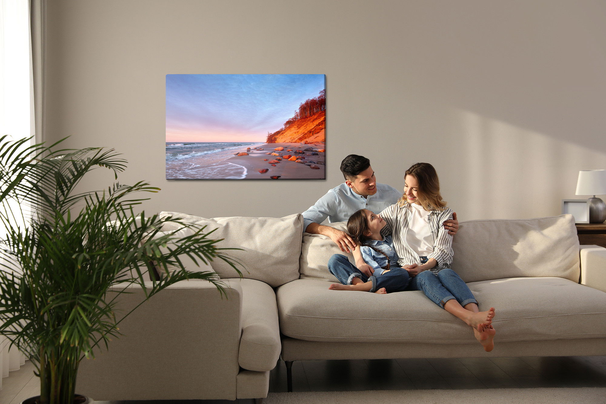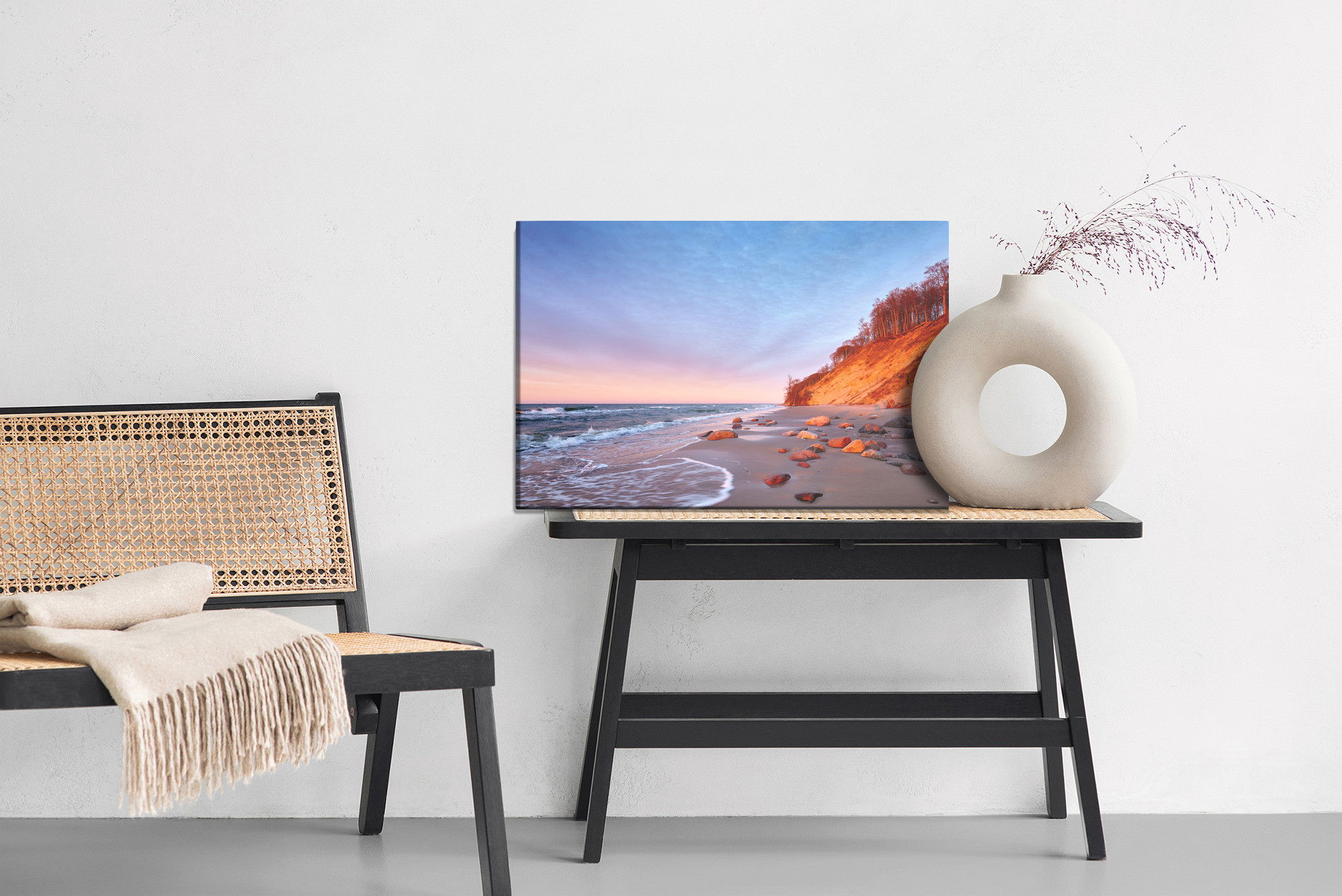 Varje tavla monteras på en massiv fururam. Format upp till 70×50 cm har en ram på 15 mm, medan format från 90×60 cm och uppåt har en ram på 20 mm. Den exakta dukspänningen gör att tavlan håller sin form över tid. Motivet Cliffs on the polish beach trycks runt hela ramen vilket ger ett stilrent galleriuttryck där tavlan är lika vacker från sidan som framifrån. Kombinationen av rak dukspänning, rena linjer och korrekt tryck ger en professionell finish.