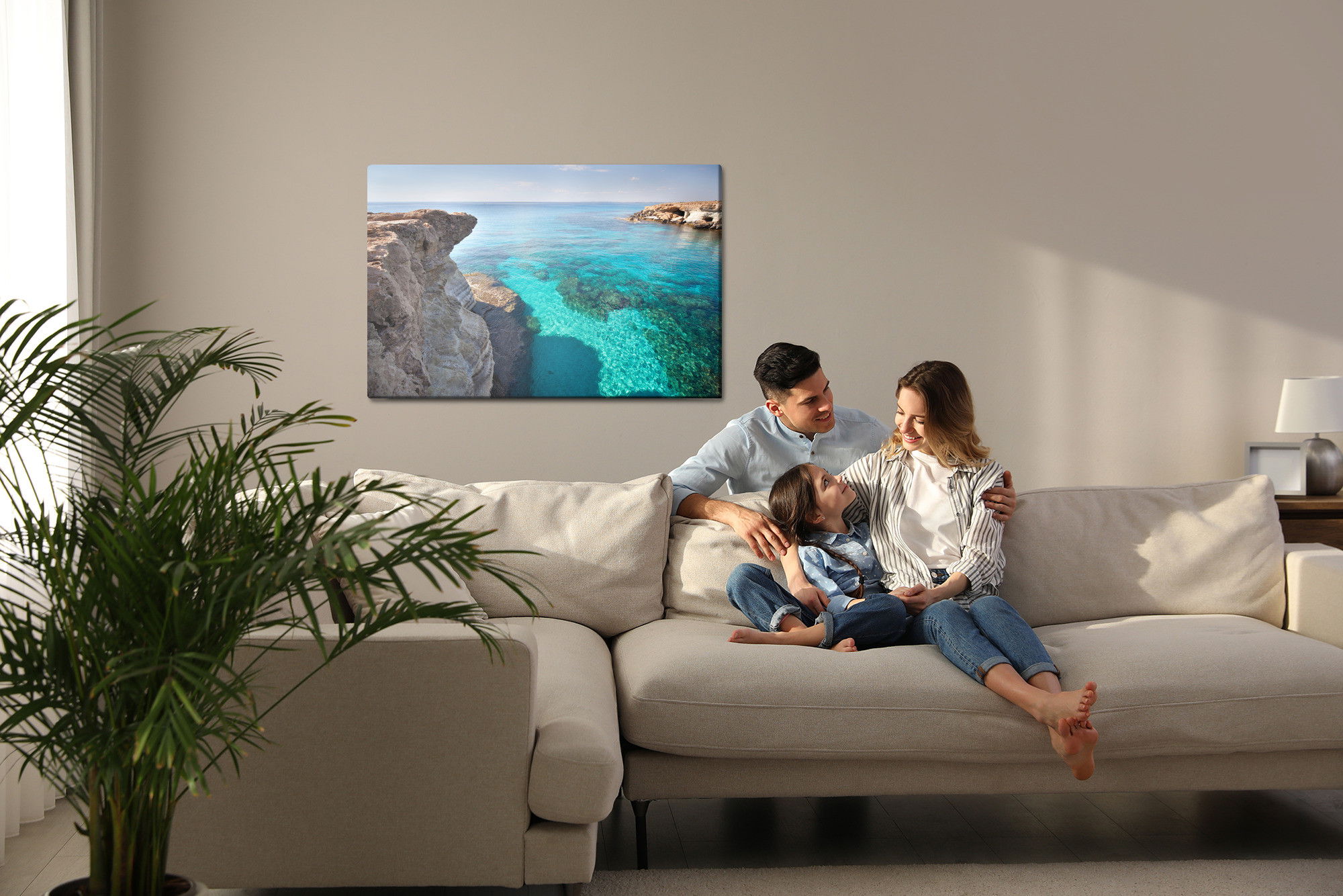 Varje tavla monteras på en massiv fururam. Format upp till 70×50 cm har en ram på 15 mm, medan format från 90×60 cm och uppåt har en ram på 20 mm. Den exakta dukspänningen gör att tavlan håller sin form över tid. Motivet Cliffs with clear water trycks runt hela ramen vilket ger ett stilrent galleriuttryck där tavlan är lika vacker från sidan som framifrån. Kombinationen av rak dukspänning, rena linjer och korrekt tryck ger en professionell finish.