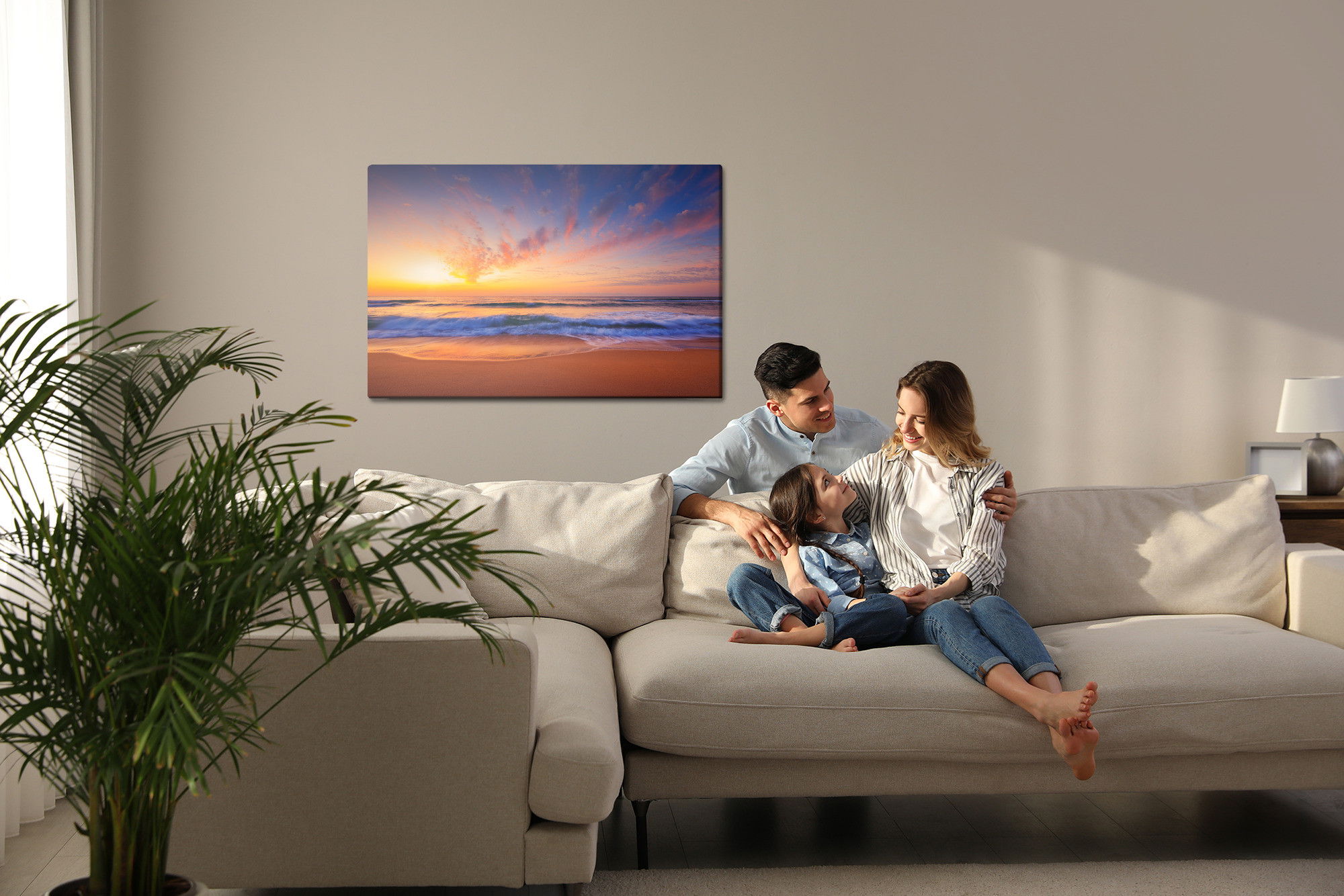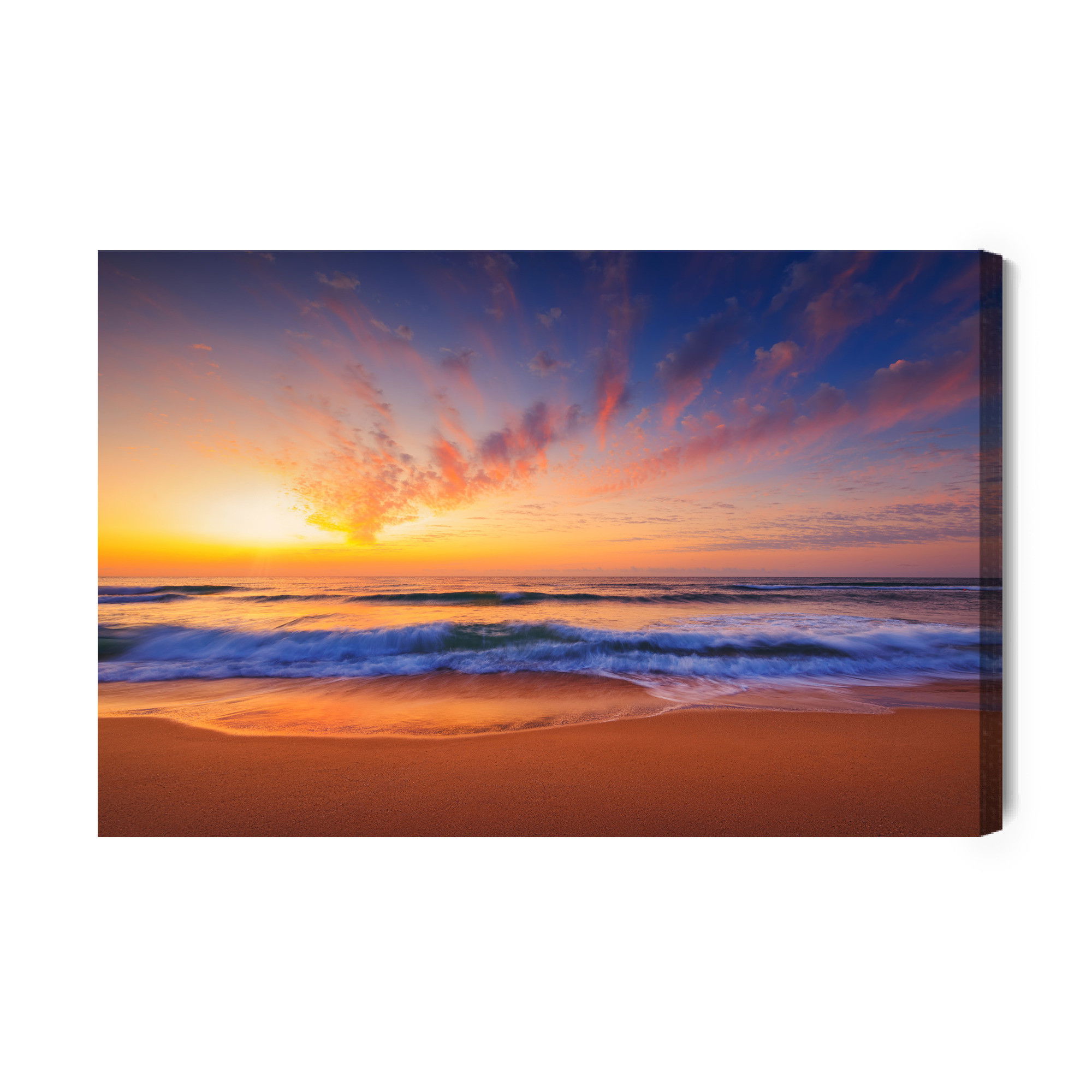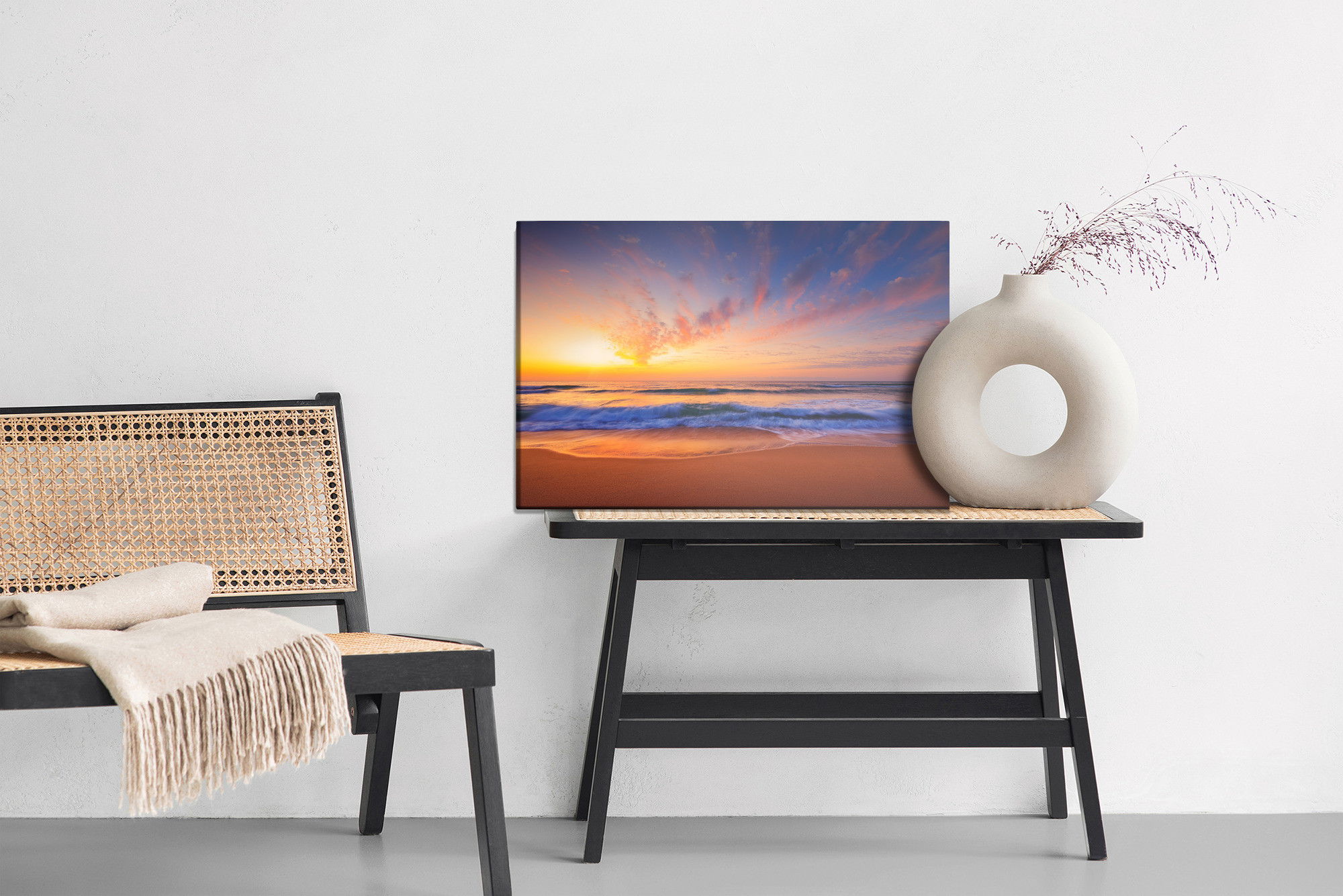 Varje tavla monteras på en massiv fururam. Format upp till 70×50 cm har en ram på 15 mm, medan format från 90×60 cm och uppåt har en ram på 20 mm. Den exakta dukspänningen gör att tavlan håller sin form över tid. Motivet Clouds by the sea trycks runt hela ramen vilket ger ett stilrent galleriuttryck där tavlan är lika vacker från sidan som framifrån. Kombinationen av rak dukspänning, rena linjer och korrekt tryck ger en professionell finish.