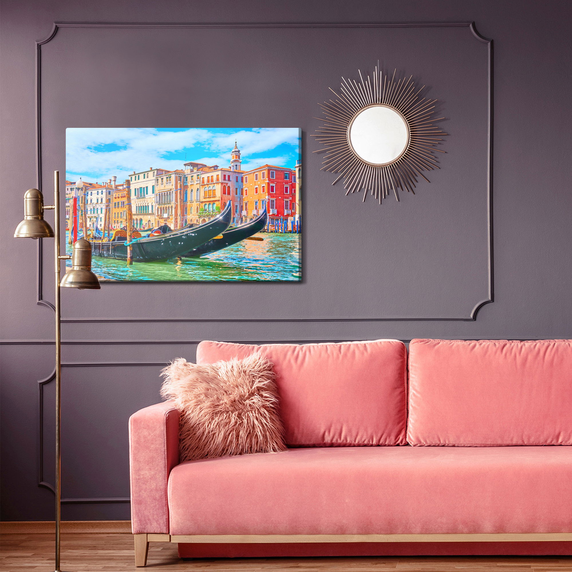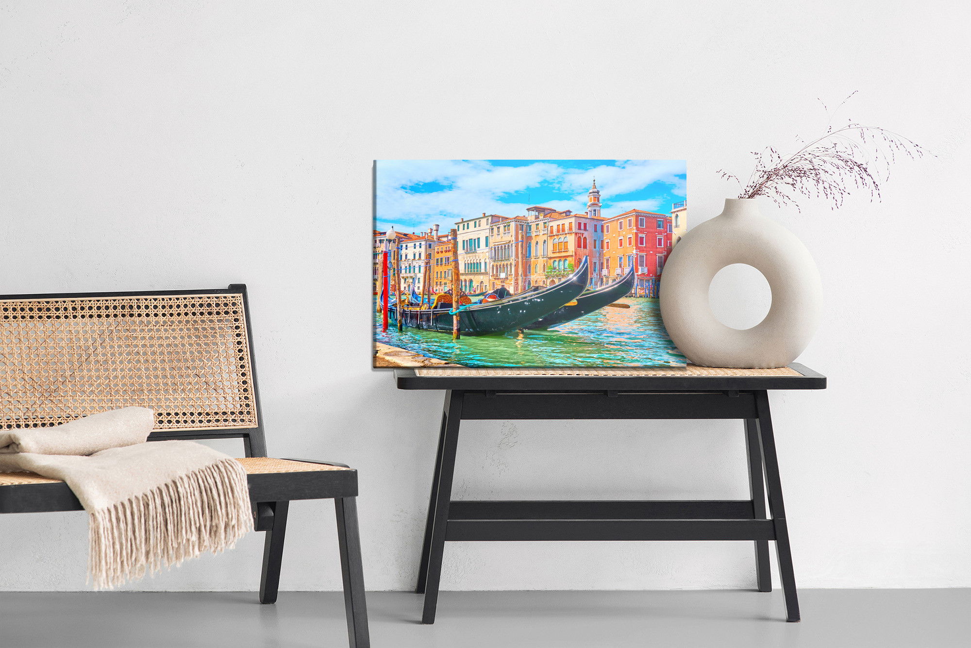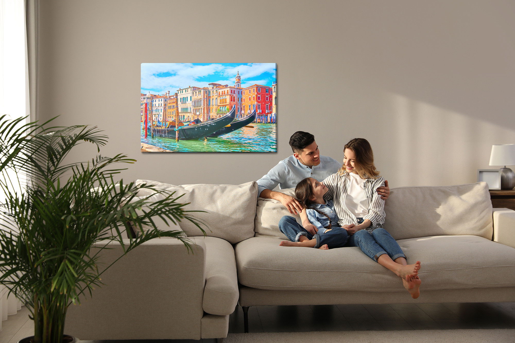 Varje tavla monteras på en massiv fururam. Format upp till 70×50 cm har en ram på 15 mm, medan format från 90×60 cm och uppåt har en ram på 20 mm. Den exakta dukspänningen gör att tavlan håller sin form över tid. Motivet Colorful buildings in venice trycks runt hela ramen vilket ger ett stilrent galleriuttryck där tavlan är lika vacker från sidan som framifrån. Kombinationen av rak dukspänning, rena linjer och korrekt tryck ger en professionell finish.