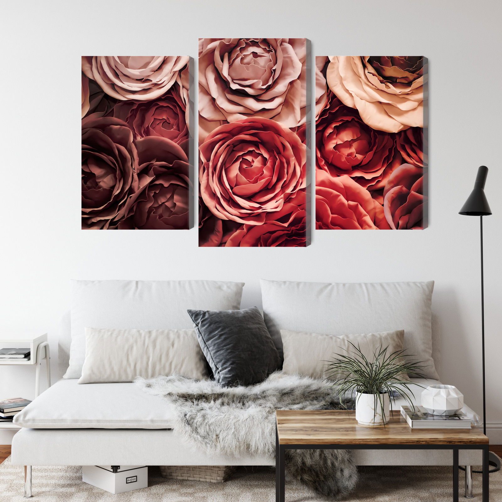 Varje tavla monteras på en massiv fururam. Format upp till 70×50 cm har en ram på 15 mm, medan format från 90×60 cm och uppåt har en ram på 20 mm. Den exakta dukspänningen gör att tavlan håller sin form över tid. Motivet Colorful flowers close up 3d trycks runt hela ramen vilket ger ett stilrent galleriuttryck där tavlan är lika vacker från sidan som framifrån. Kombinationen av rak dukspänning, rena linjer och korrekt tryck ger en professionell finish.