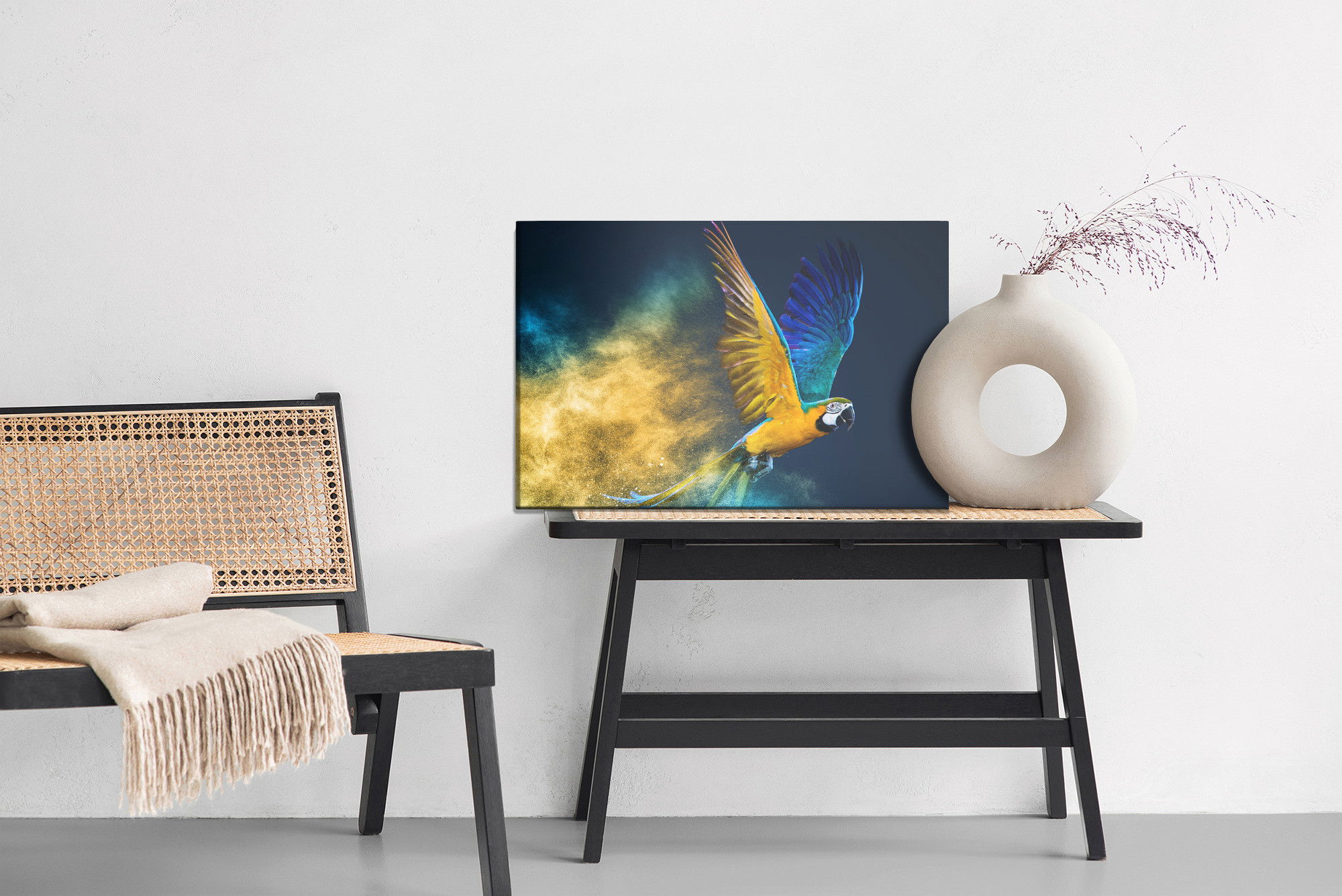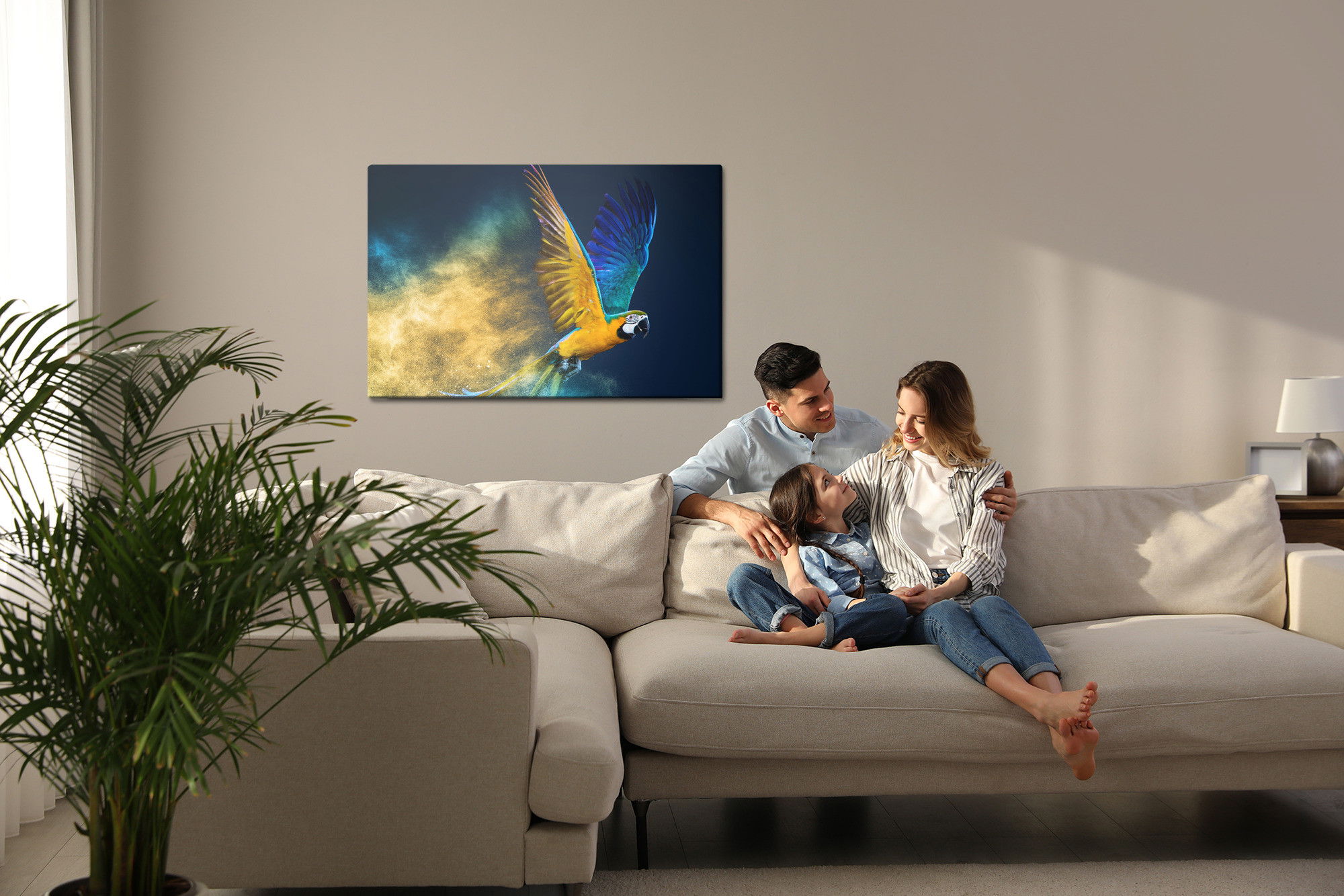 Varje tavla monteras på en massiv fururam. Format upp till 70×50 cm har en ram på 15 mm, medan format från 90×60 cm och uppåt har en ram på 20 mm. Den exakta dukspänningen gör att tavlan håller sin form över tid. Motivet Colorful macaw parrot trycks runt hela ramen vilket ger ett stilrent galleriuttryck där tavlan är lika vacker från sidan som framifrån. Kombinationen av rak dukspänning, rena linjer och korrekt tryck ger en professionell finish.