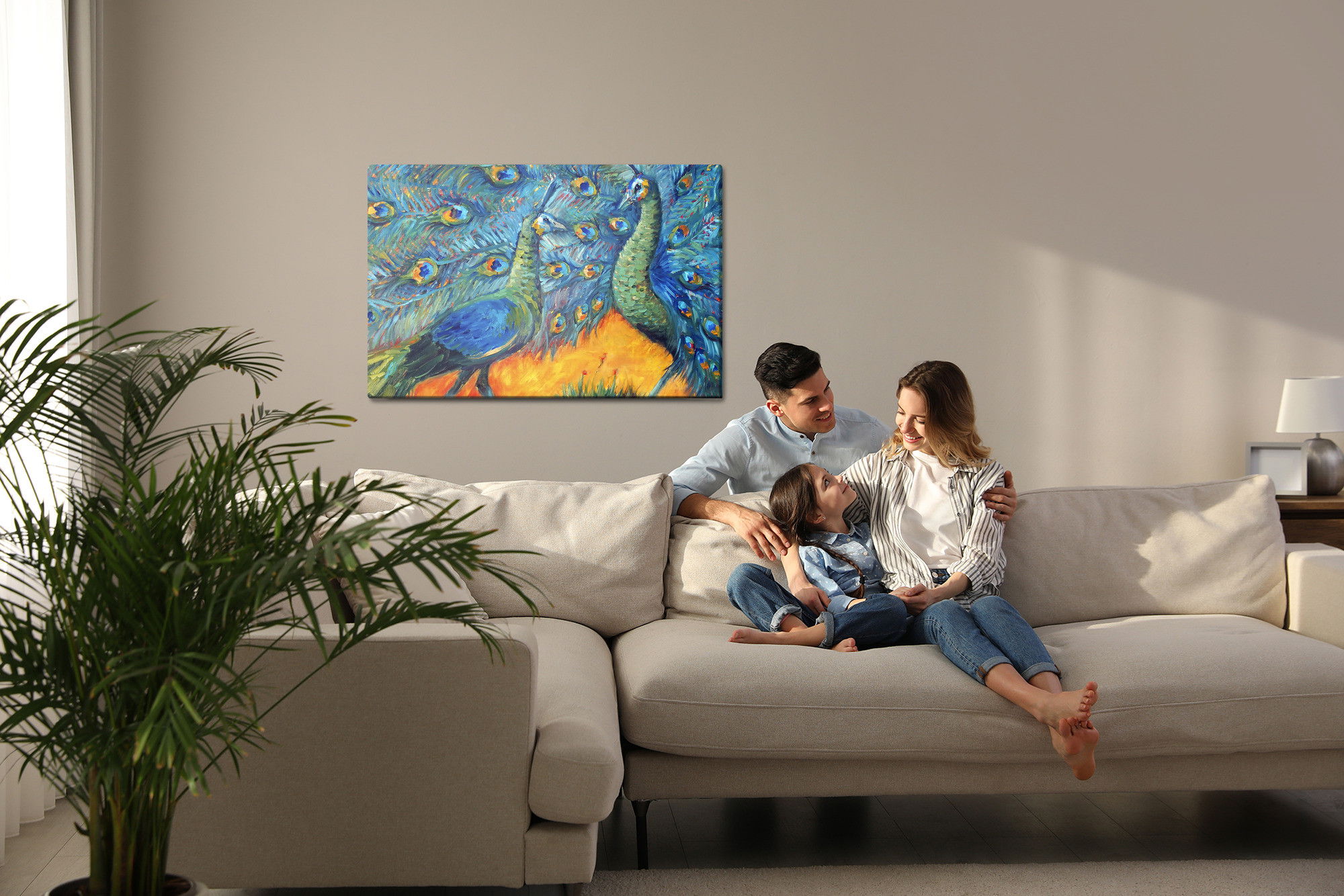 Varje tavla monteras på en massiv fururam. Format upp till 70×50 cm har en ram på 15 mm, medan format från 90×60 cm och uppåt har en ram på 20 mm. Den exakta dukspänningen gör att tavlan håller sin form över tid. Motivet Colorful peacocks trycks runt hela ramen vilket ger ett stilrent galleriuttryck där tavlan är lika vacker från sidan som framifrån. Kombinationen av rak dukspänning, rena linjer och korrekt tryck ger en professionell finish.