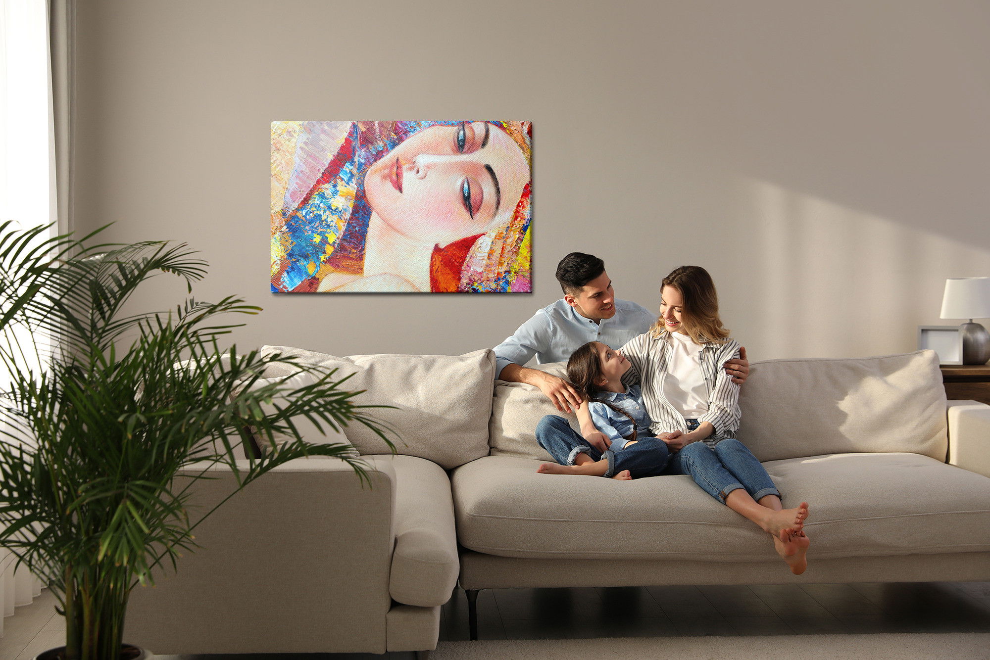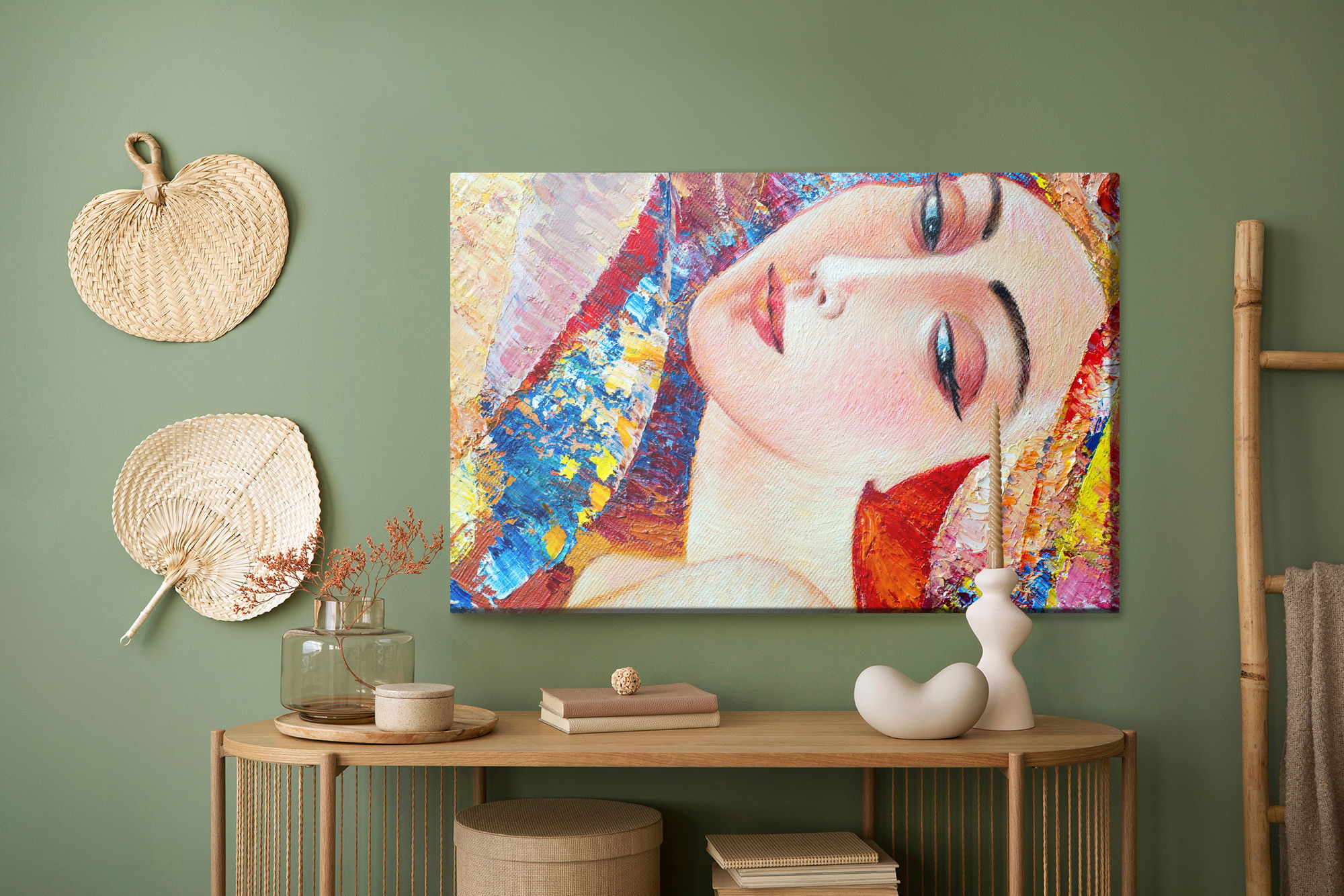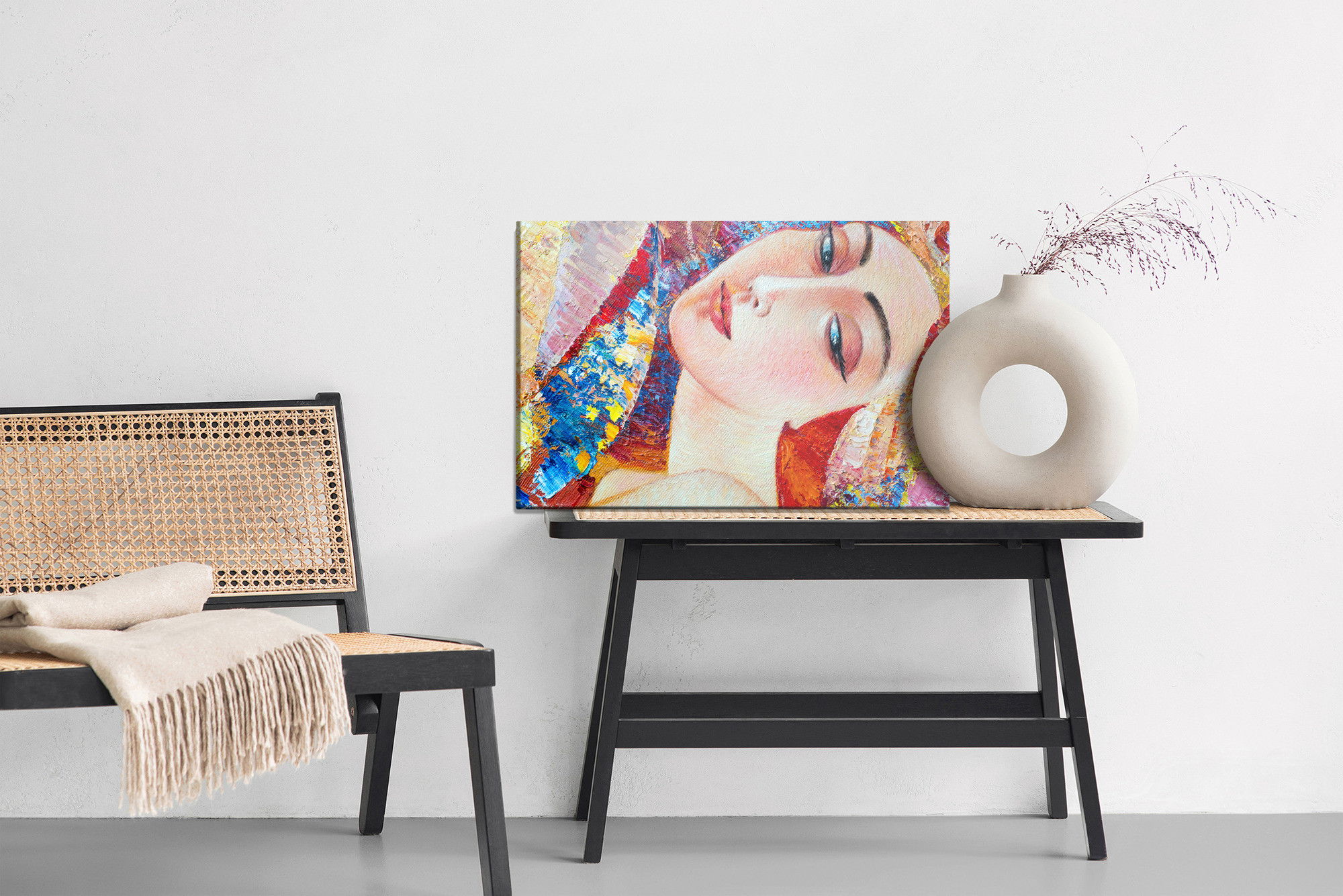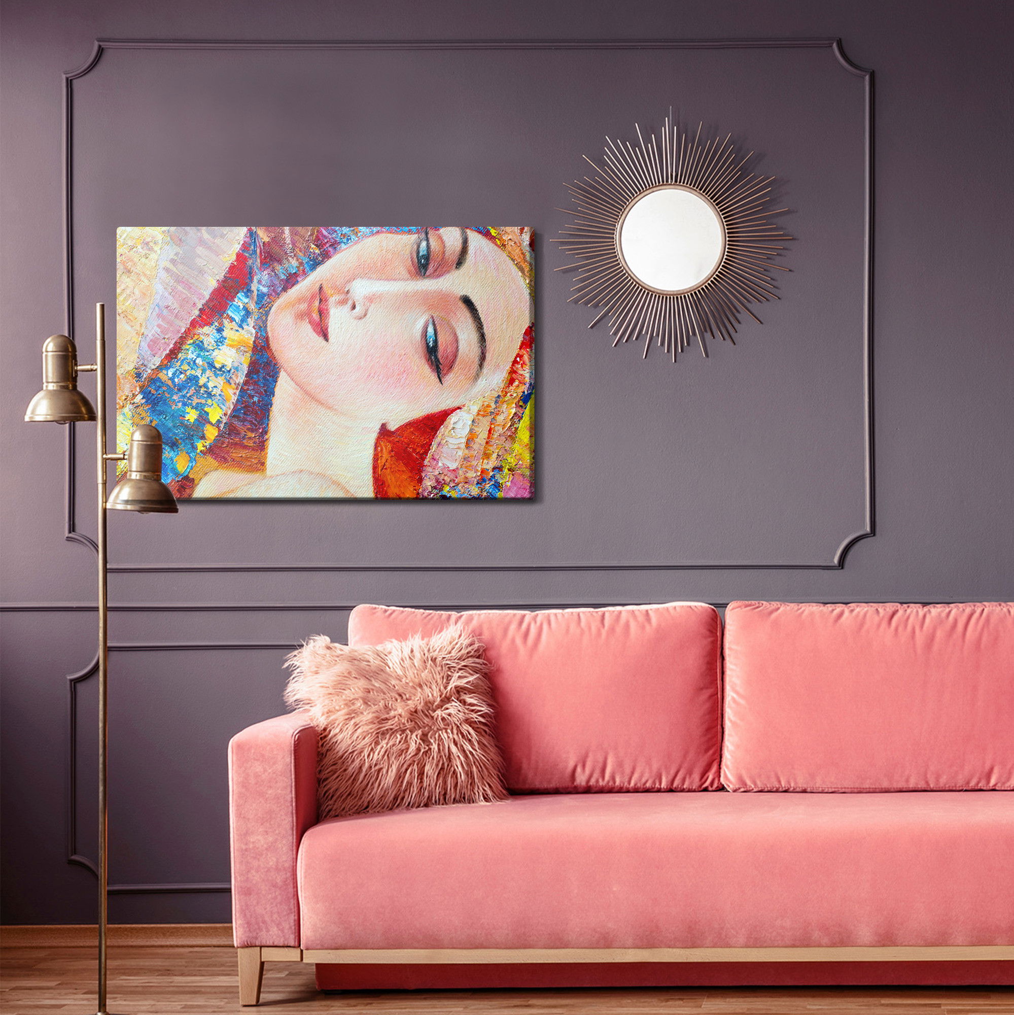 Varje tavla monteras på en massiv fururam. Format upp till 70×50 cm har en ram på 15 mm, medan format från 90×60 cm och uppåt har en ram på 20 mm. Den exakta dukspänningen gör att tavlan håller sin form över tid. Motivet Colorful portrait of a young trycks runt hela ramen vilket ger ett stilrent galleriuttryck där tavlan är lika vacker från sidan som framifrån. Kombinationen av rak dukspänning, rena linjer och korrekt tryck ger en professionell finish.