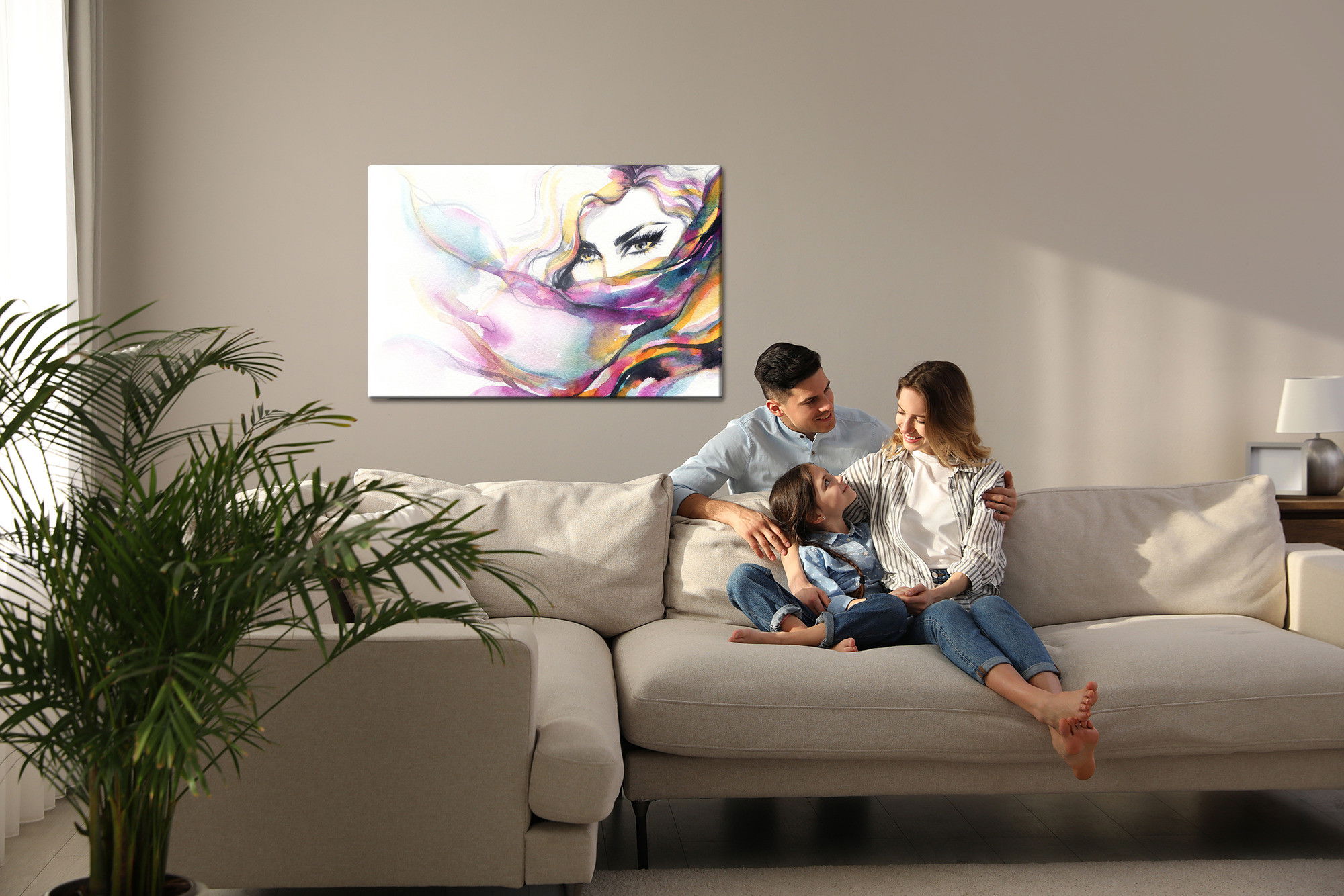 Varje tavla monteras på en massiv fururam. Format upp till 70×50 cm har en ram på 15 mm, medan format från 90×60 cm och uppåt har en ram på 20 mm. Den exakta dukspänningen gör att tavlan håller sin form över tid. Motivet Colorful watercolor portrait trycks runt hela ramen vilket ger ett stilrent galleriuttryck där tavlan är lika vacker från sidan som framifrån. Kombinationen av rak dukspänning, rena linjer och korrekt tryck ger en professionell finish.