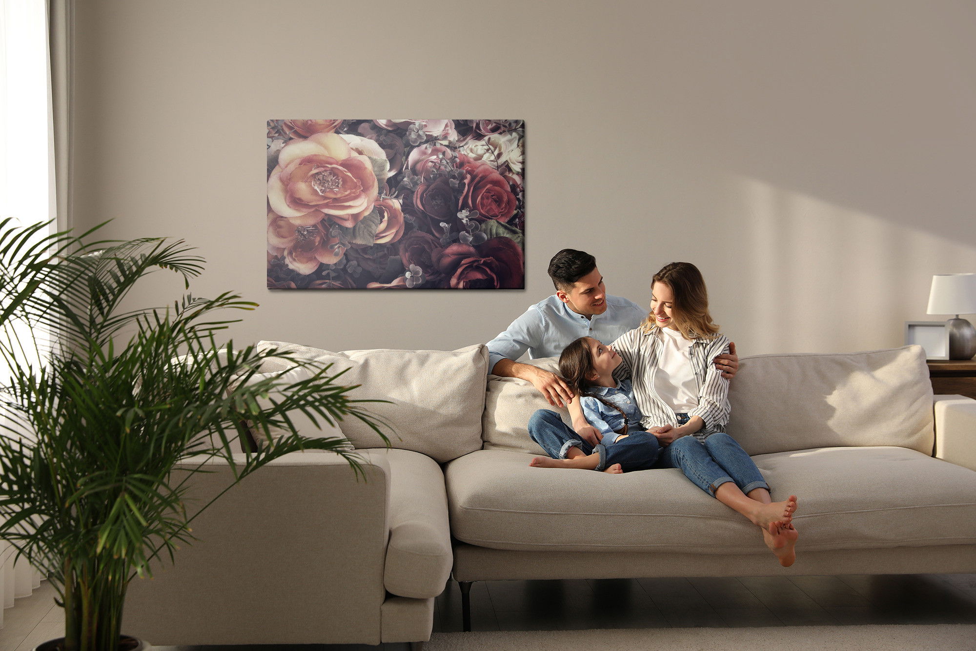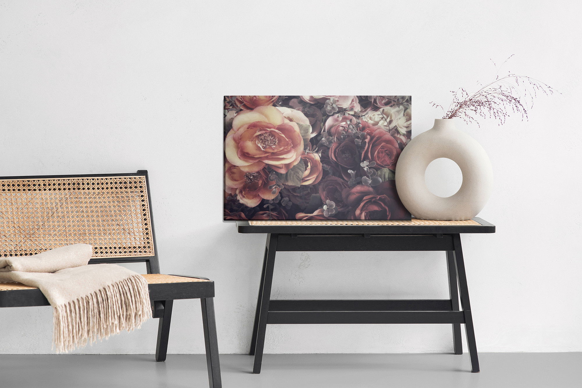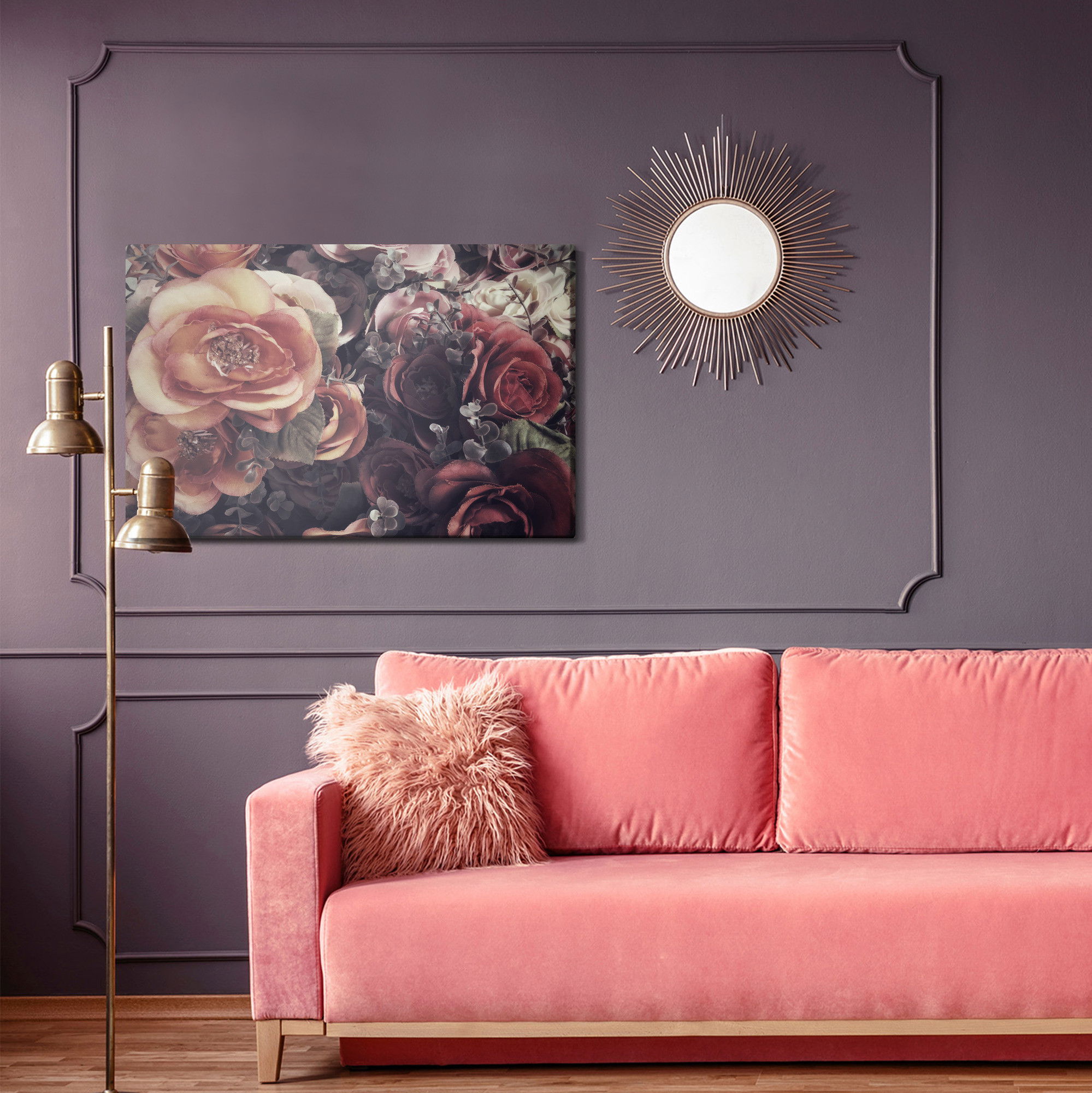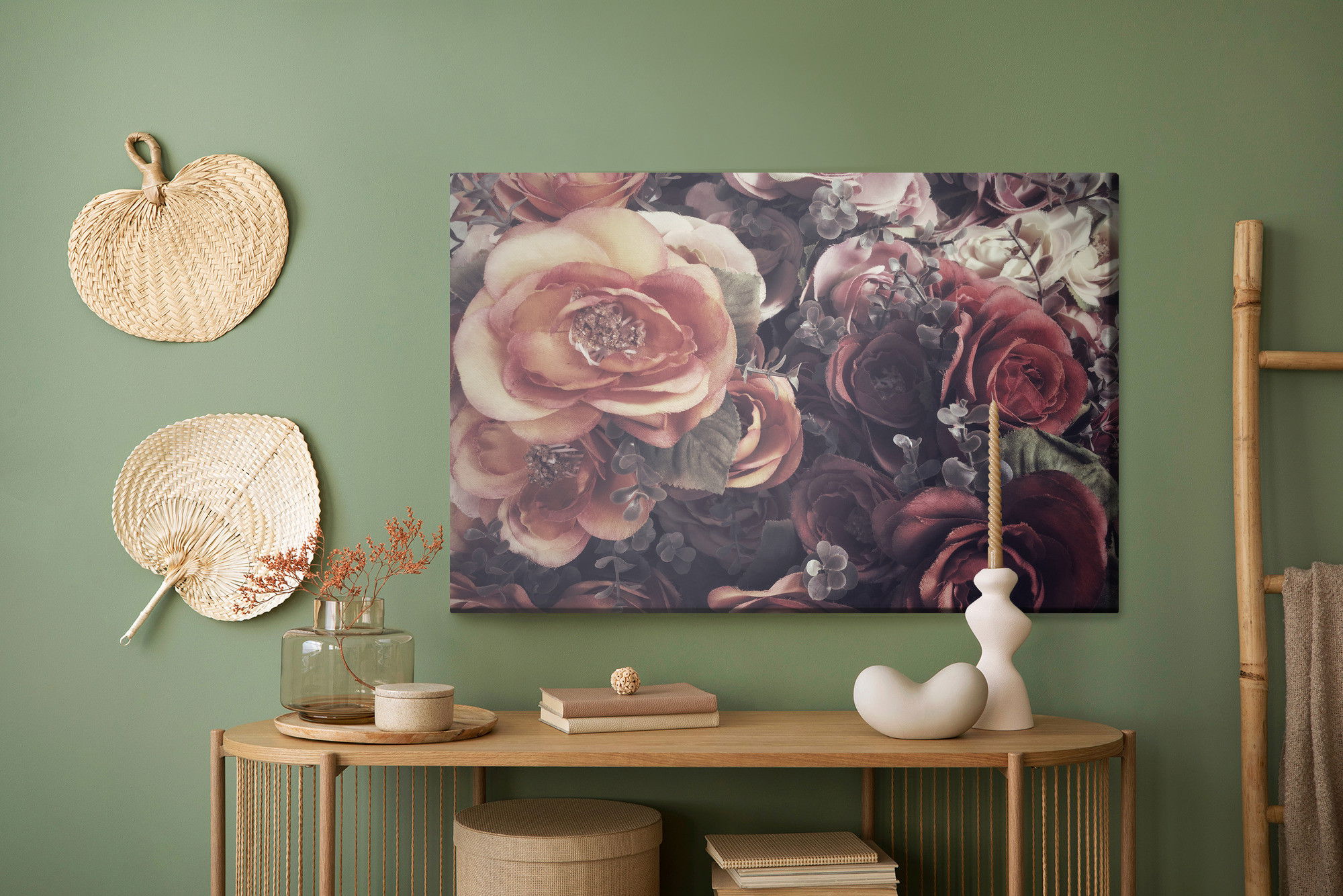 Varje tavla monteras på en massiv fururam. Format upp till 70×50 cm har en ram på 15 mm, medan format från 90×60 cm och uppåt har en ram på 20 mm. Den exakta dukspänningen gör att tavlan håller sin form över tid. Motivet Colourful roses and leaves trycks runt hela ramen vilket ger ett stilrent galleriuttryck där tavlan är lika vacker från sidan som framifrån. Kombinationen av rak dukspänning, rena linjer och korrekt tryck ger en professionell finish.