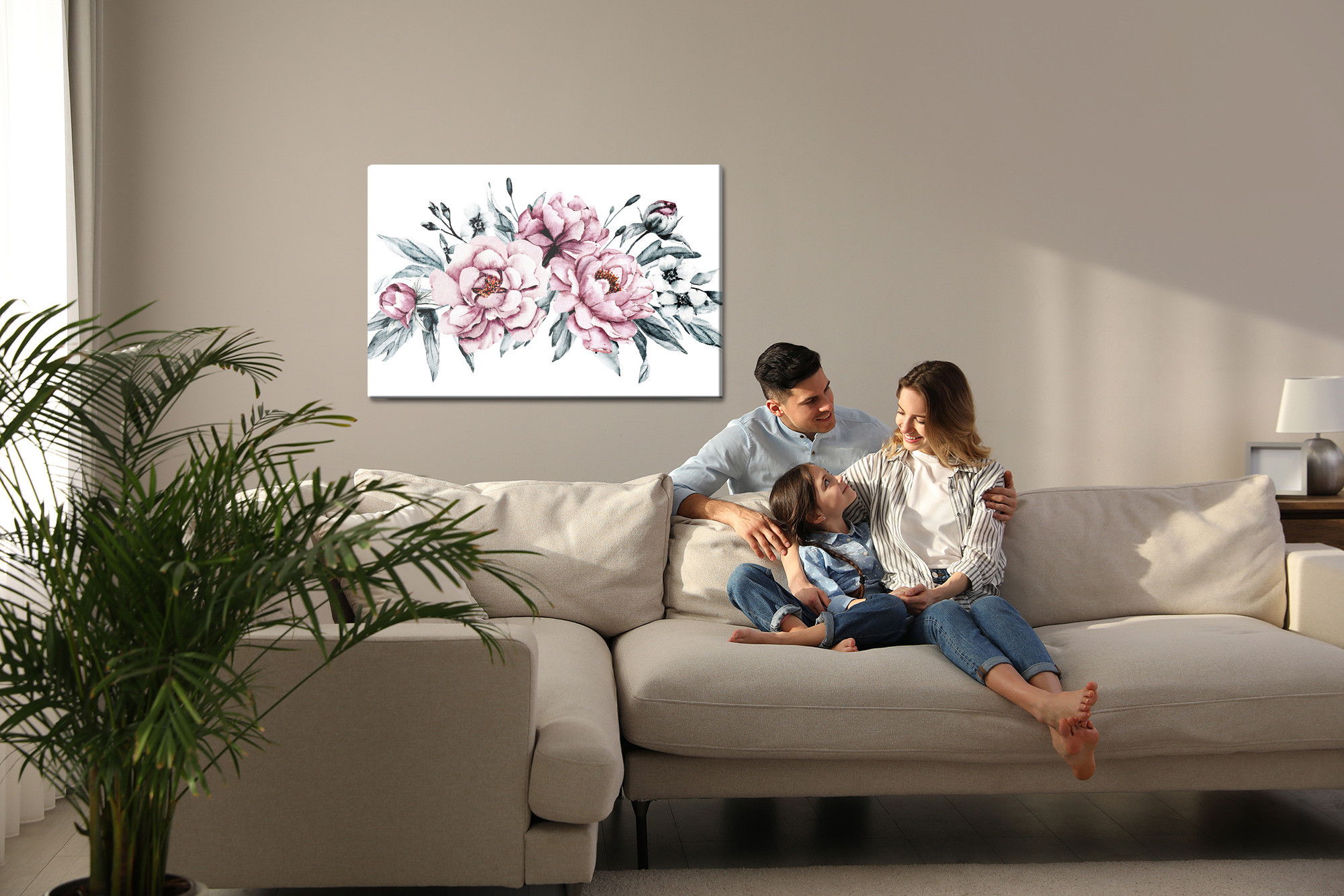 Varje tavla monteras på en massiv fururam. Format upp till 70×50 cm har en ram på 15 mm, medan format från 90×60 cm och uppåt har en ram på 20 mm. Den exakta dukspänningen gör att tavlan håller sin form över tid. Motivet Composition of peony flowers trycks runt hela ramen vilket ger ett stilrent galleriuttryck där tavlan är lika vacker från sidan som framifrån. Kombinationen av rak dukspänning, rena linjer och korrekt tryck ger en professionell finish.