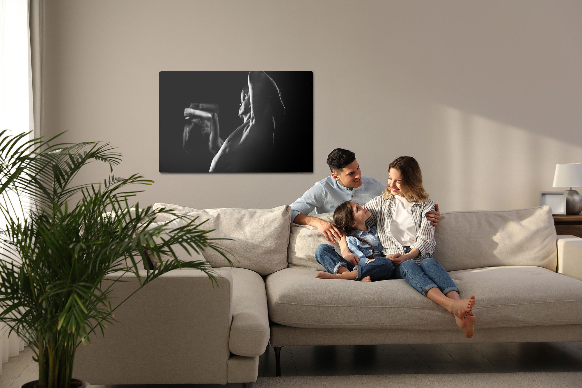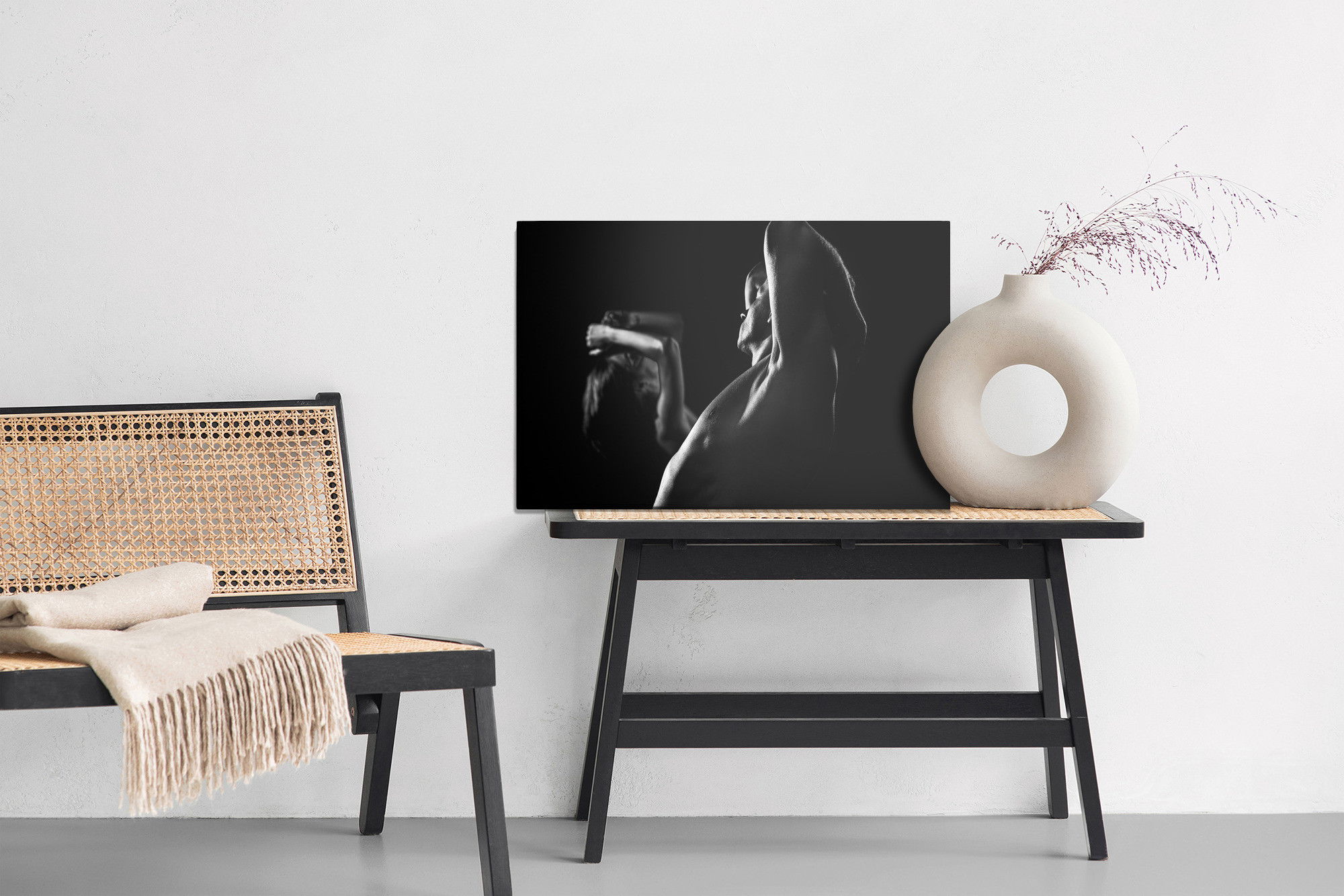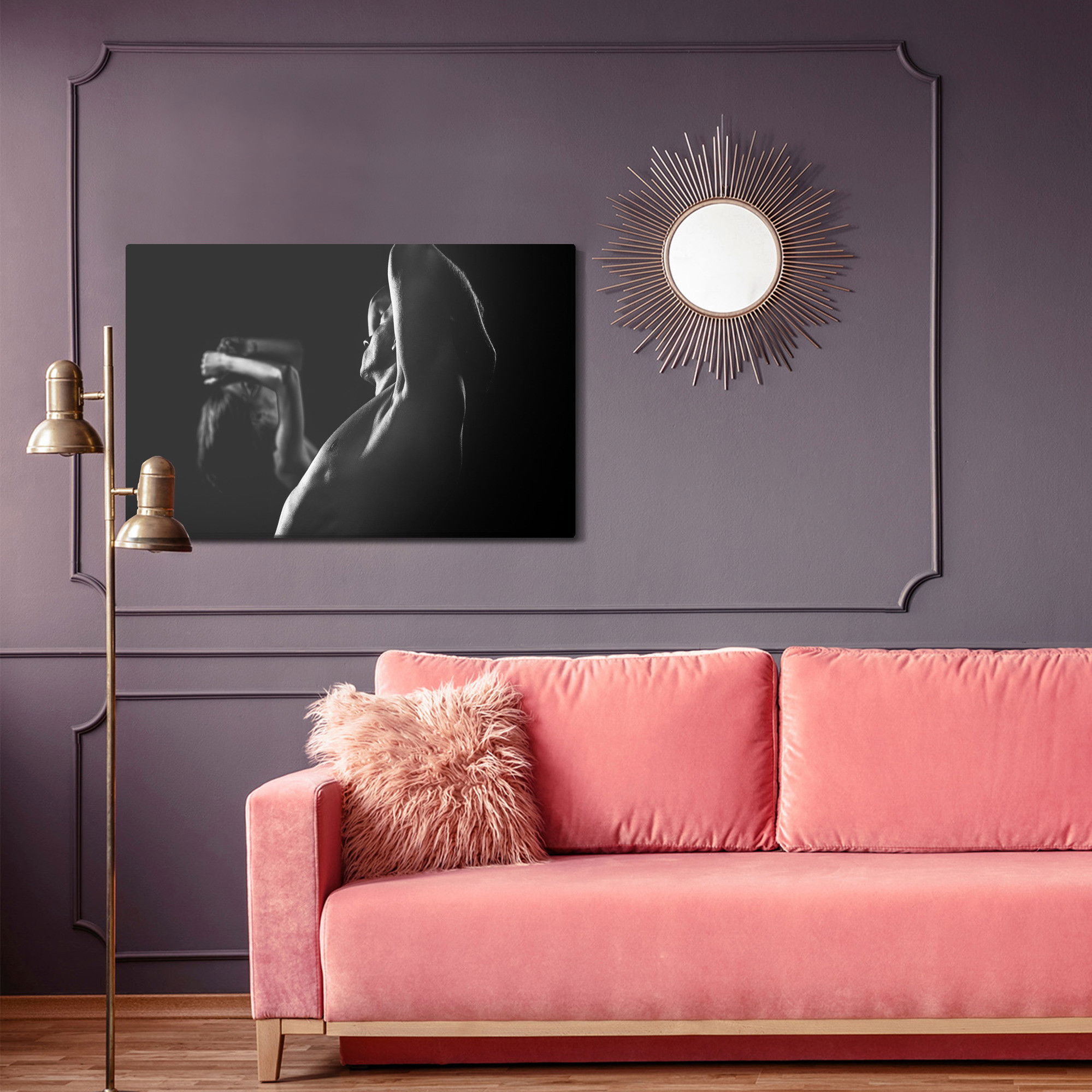 Med SilentDirects ljuddämpande tavla Couple working out får du både ett stilrent motiv och en akustisk lösning i samma produkt. Tavlan byggs i Sverige och utgår från en canvastavla med fururam som fylls med en återvunnen polyestercell för effektiv ljudabsorption.