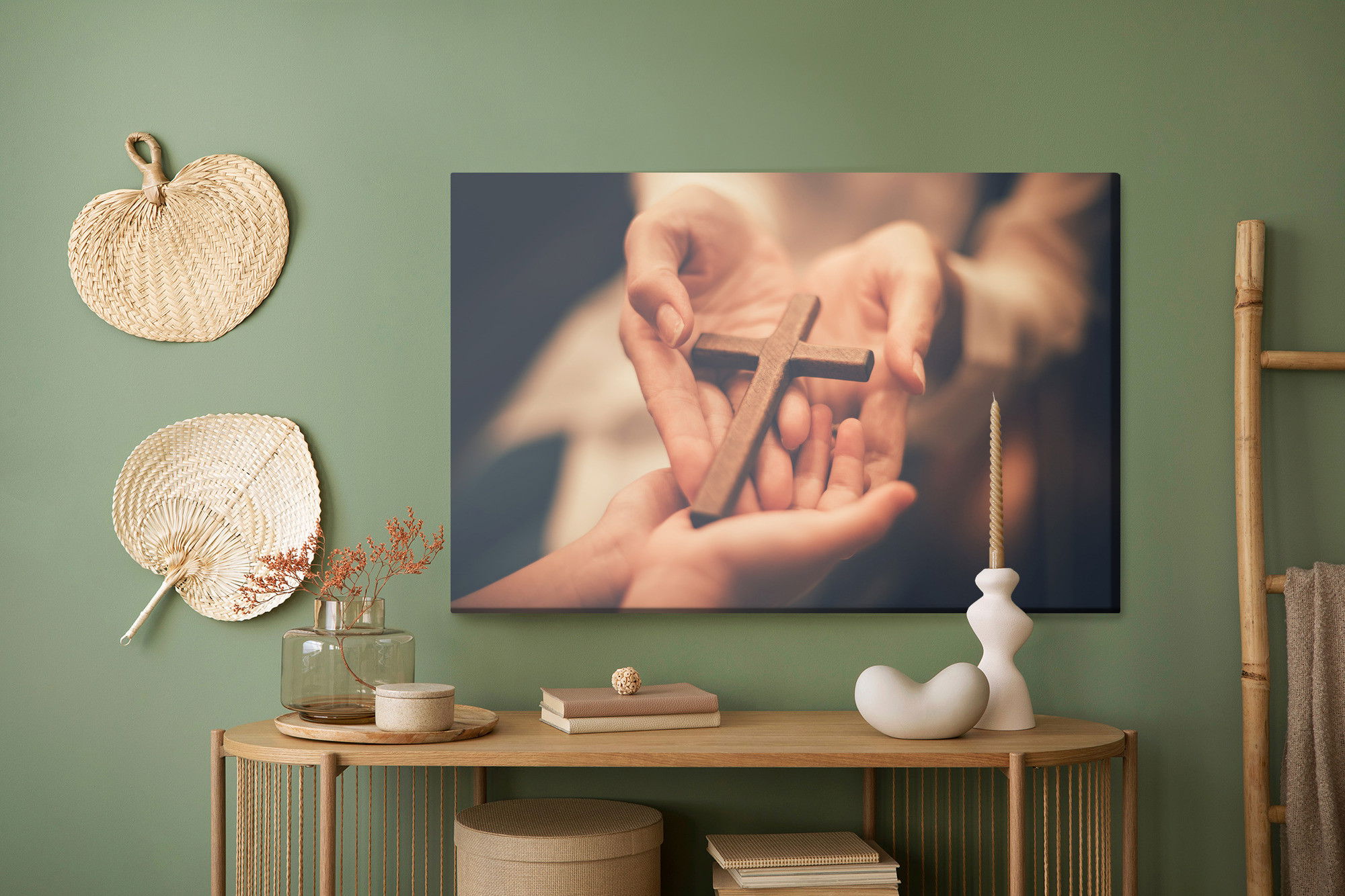 Motivet Cross on the hands återges med hög färgprecision och detaljrikedom tack vare HP Latex-teknologi. Trycket sker med vattenbaserade, luktfria och GREENGUARD Gold-certifierade bläck som ger en upplösning på upp till 300 DPI. Färgerna är UV-beständiga och behåller sin styrka även i ljusa rum, vilket gör tavlan lämplig för både hem- och offentliga miljöer.