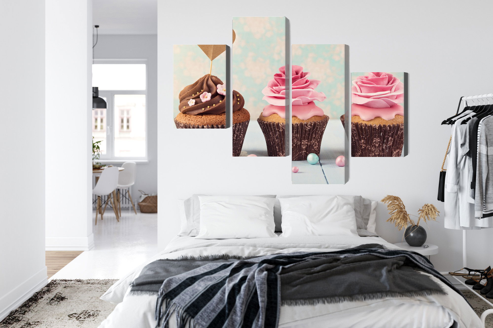 SilentDirects ljuddämpande tavla Cupcakes with cream kombinerar ett högupplöst motiv med avancerad akustikteknik. Varje tavla monteras i Sverige och bygger på en stabil canvastavla med fururam, där insidan av ramen fylls med en ljudabsorberande kärna av återvunnen polyester. Konstruktionen gör tavlan till ett både estetiskt och funktionellt inslag i rummet.
