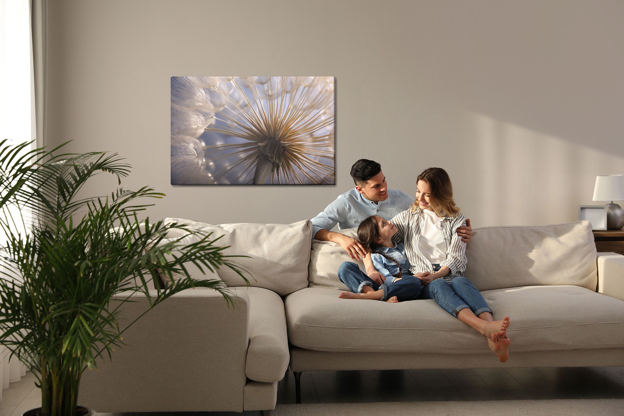 Varje tavla monteras på en massiv fururam. Format upp till 70×50 cm har en ram på 15 mm, medan format från 90×60 cm och uppåt har en ram på 20 mm. Den exakta dukspänningen gör att tavlan håller sin form över tid. Motivet Dandelion close up trycks runt hela ramen vilket ger ett stilrent galleriuttryck där tavlan är lika vacker från sidan som framifrån. Kombinationen av rak dukspänning, rena linjer och korrekt tryck ger en professionell finish.