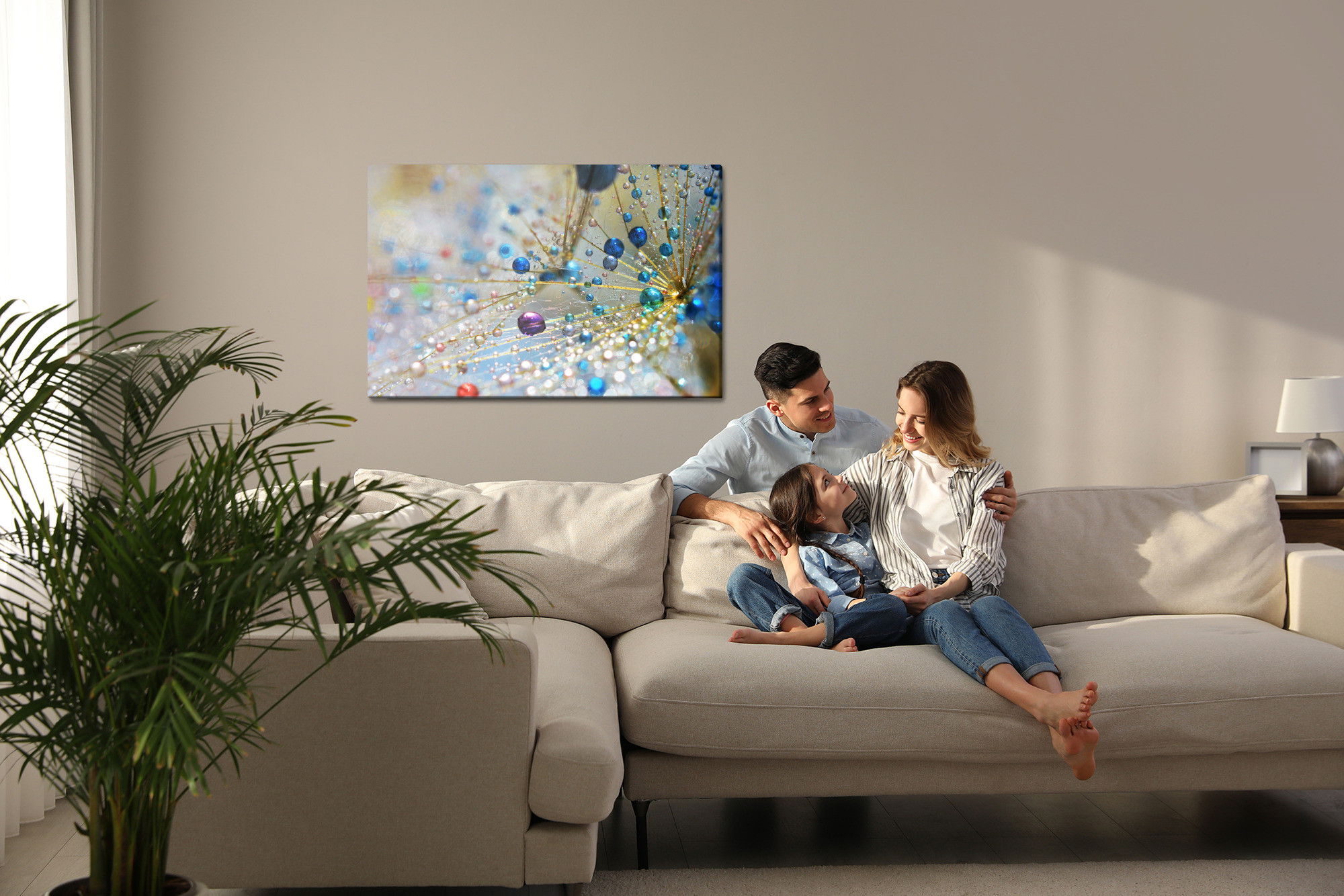 Varje tavla monteras på en massiv fururam. Format upp till 70×50 cm har en ram på 15 mm, medan format från 90×60 cm och uppåt har en ram på 20 mm. Den exakta dukspänningen gör att tavlan håller sin form över tid. Motivet Dandelion, colorful drops trycks runt hela ramen vilket ger ett stilrent galleriuttryck där tavlan är lika vacker från sidan som framifrån. Kombinationen av rak dukspänning, rena linjer och korrekt tryck ger en professionell finish.
