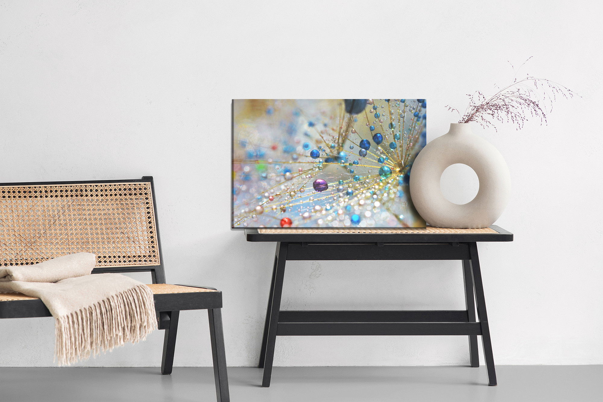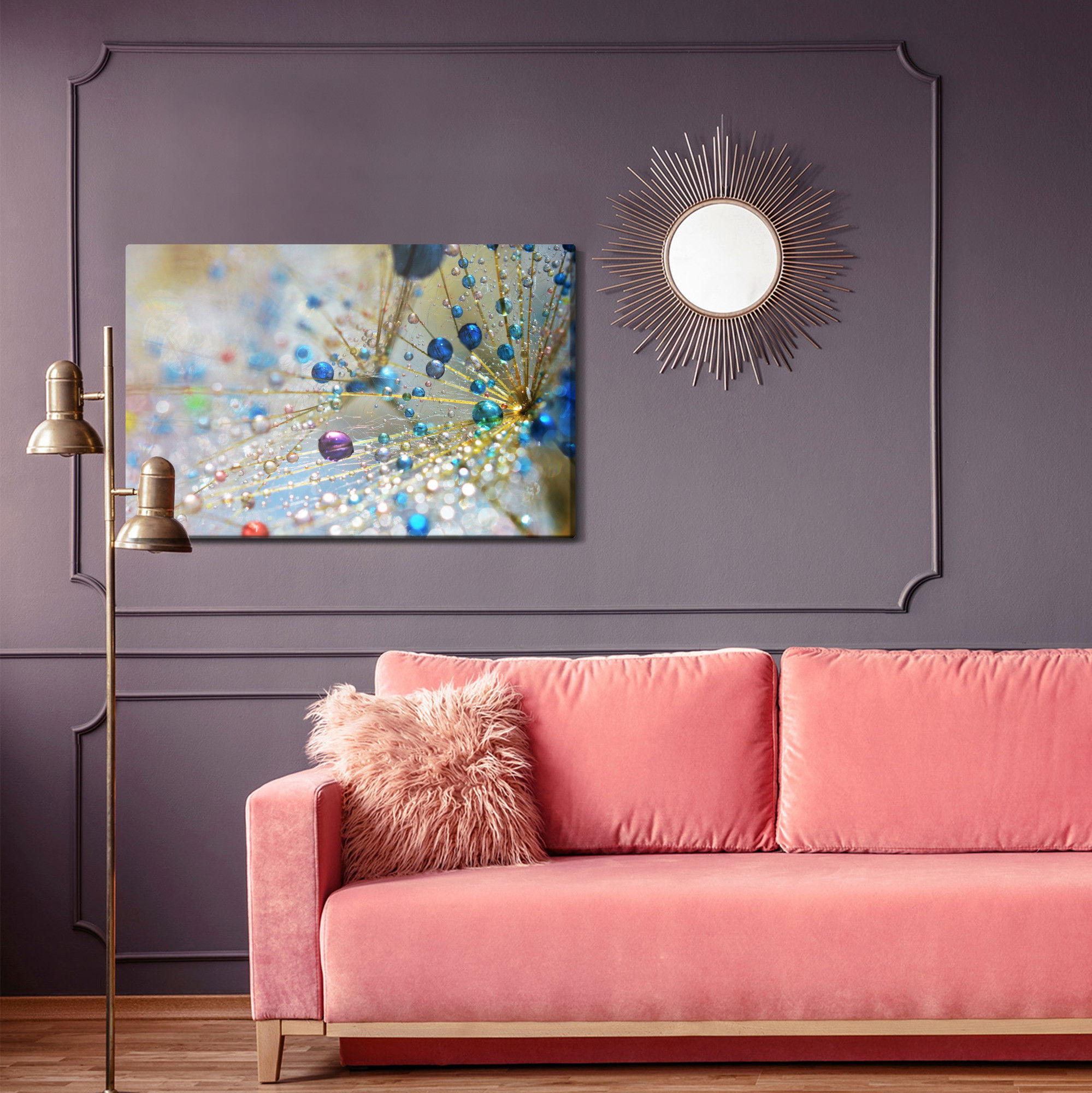 SilentDirects ljuddämpande tavla Dandelion, colorful drops kombinerar ett högupplöst motiv med avancerad akustikteknik. Varje tavla monteras i Sverige och bygger på en stabil canvastavla med fururam, där insidan av ramen fylls med en ljudabsorberande kärna av återvunnen polyester. Konstruktionen gör tavlan till ett både estetiskt och funktionellt inslag i rummet.