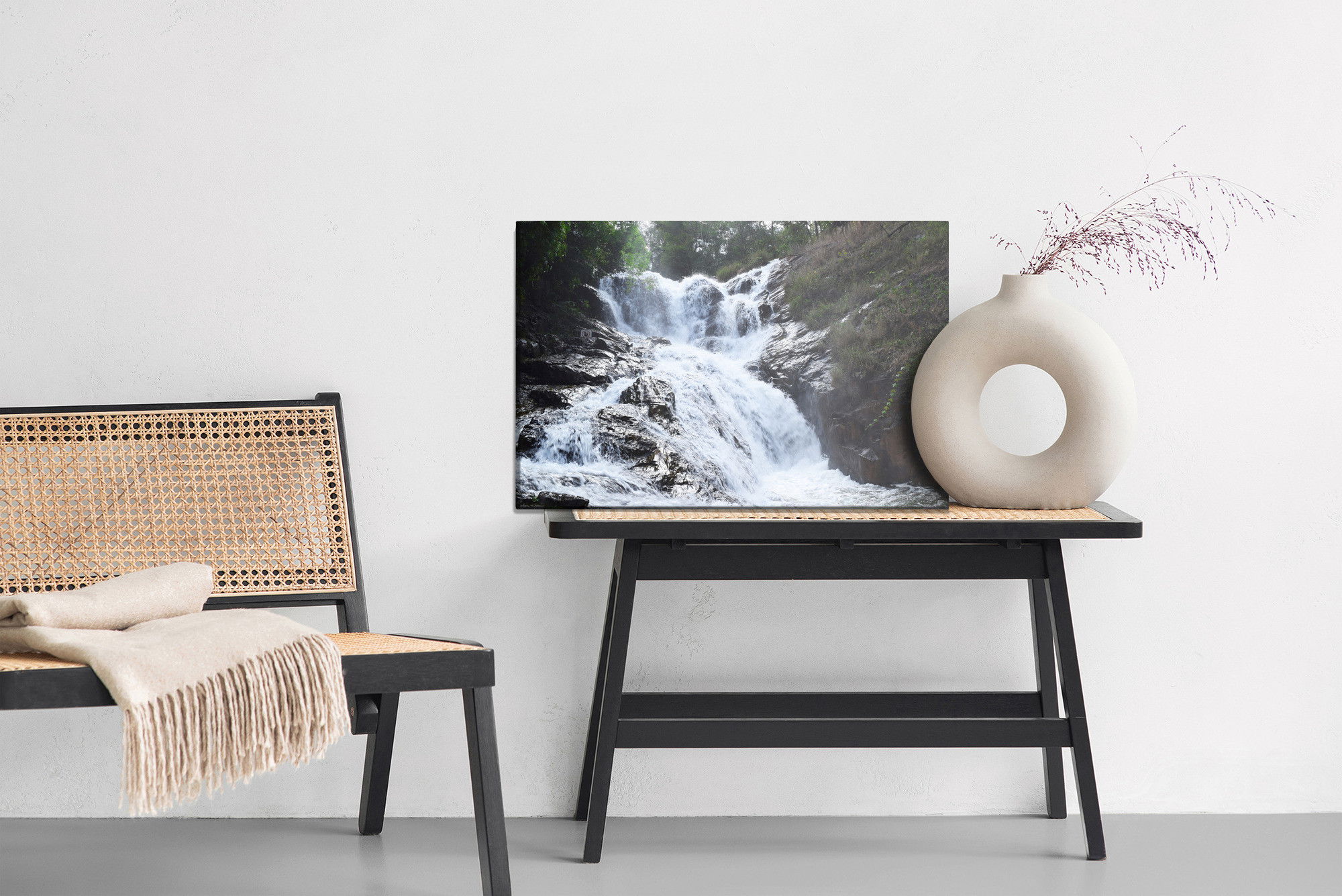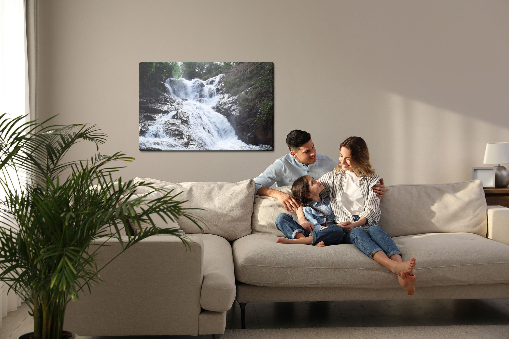 Varje tavla monteras på en massiv fururam. Format upp till 70×50 cm har en ram på 15 mm, medan format från 90×60 cm och uppåt har en ram på 20 mm. Den exakta dukspänningen gör att tavlan håller sin form över tid. Motivet Datanla waterfall in vietnam trycks runt hela ramen vilket ger ett stilrent galleriuttryck där tavlan är lika vacker från sidan som framifrån. Kombinationen av rak dukspänning, rena linjer och korrekt tryck ger en professionell finish.