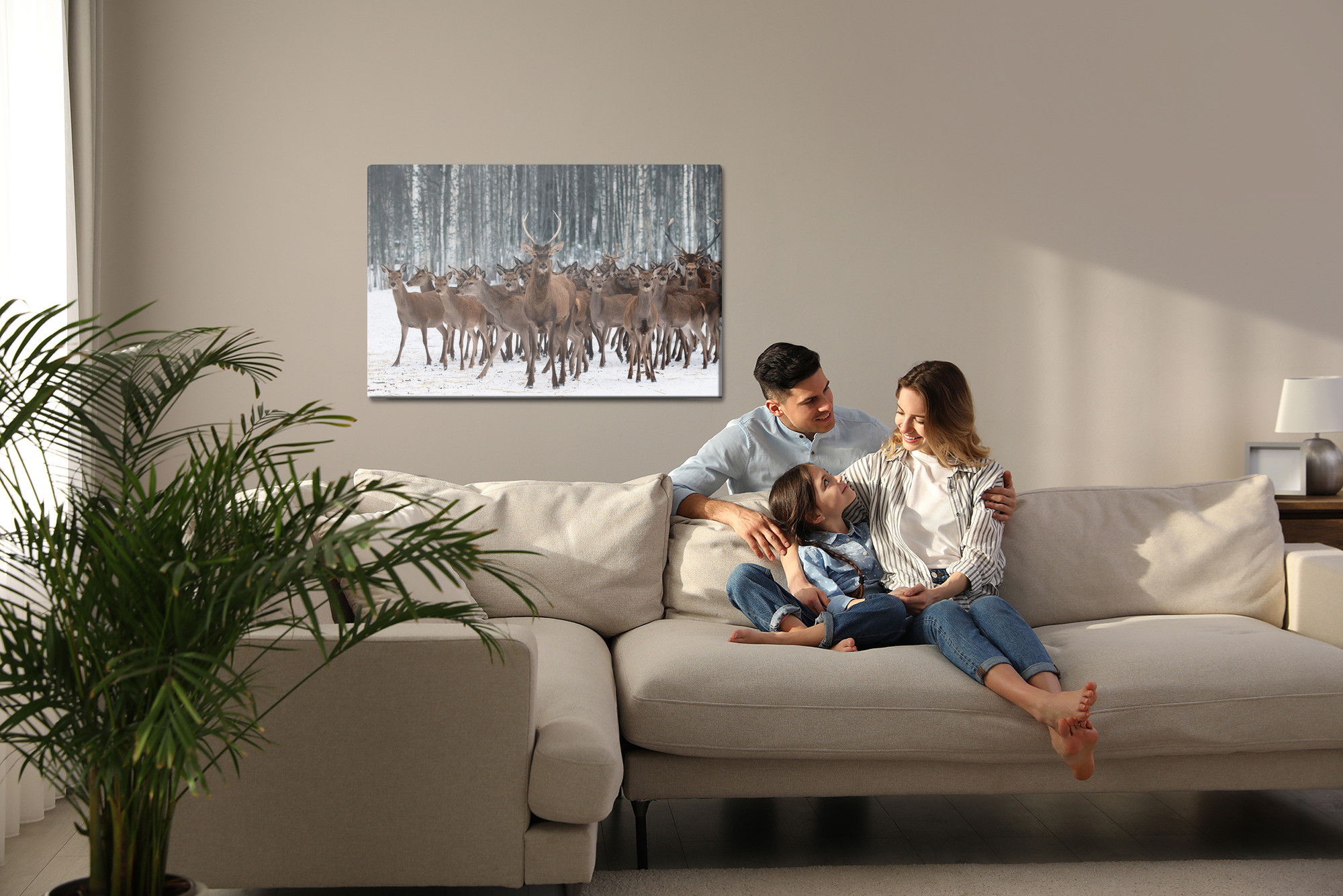 Varje tavla monteras på en massiv fururam. Format upp till 70×50 cm har en ram på 15 mm, medan format från 90×60 cm och uppåt har en ram på 20 mm. Den exakta dukspänningen gör att tavlan håller sin form över tid. Motivet Deer among the hinds trycks runt hela ramen vilket ger ett stilrent galleriuttryck där tavlan är lika vacker från sidan som framifrån. Kombinationen av rak dukspänning, rena linjer och korrekt tryck ger en professionell finish.