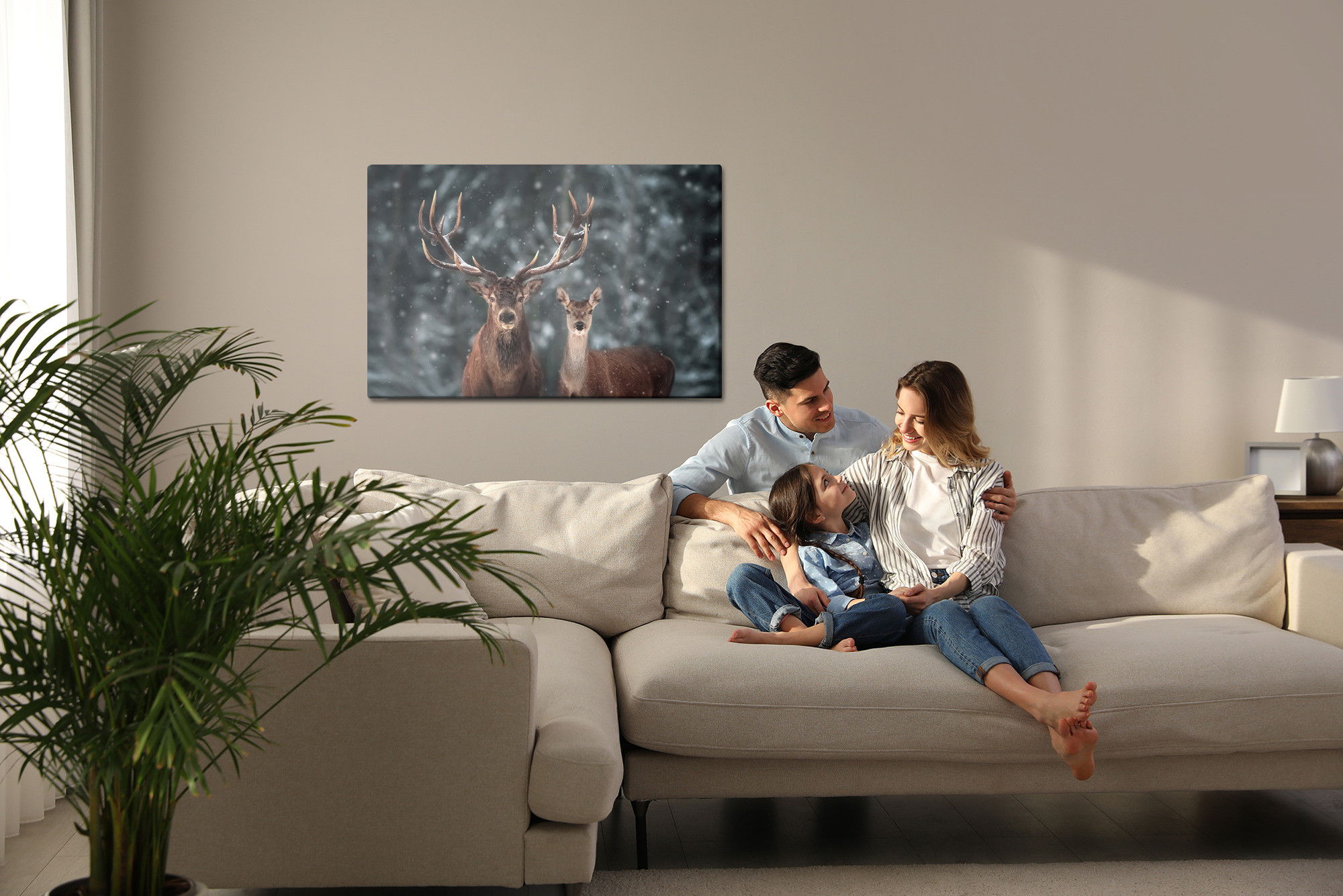 Varje tavla monteras på en massiv fururam. Format upp till 70×50 cm har en ram på 15 mm, medan format från 90×60 cm och uppåt har en ram på 20 mm. Den exakta dukspänningen gör att tavlan håller sin form över tid. Motivet Deer and deer in winter trycks runt hela ramen vilket ger ett stilrent galleriuttryck där tavlan är lika vacker från sidan som framifrån. Kombinationen av rak dukspänning, rena linjer och korrekt tryck ger en professionell finish.