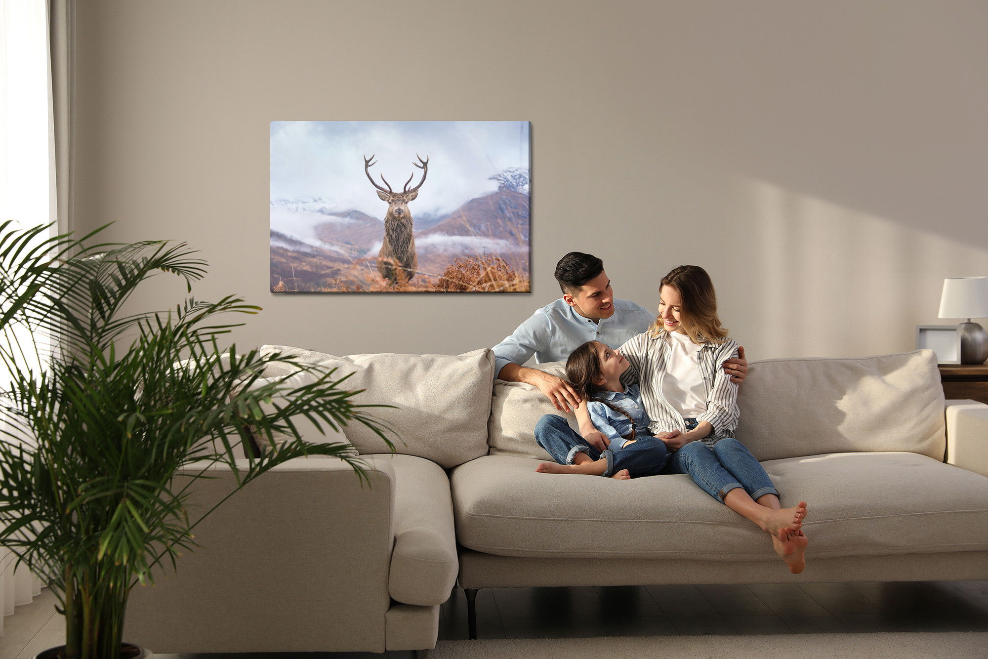 Varje tavla monteras på en massiv fururam. Format upp till 70×50 cm har en ram på 15 mm, medan format från 90×60 cm och uppåt har en ram på 20 mm. Den exakta dukspänningen gör att tavlan håller sin form över tid. Motivet Deer and winter mountains trycks runt hela ramen vilket ger ett stilrent galleriuttryck där tavlan är lika vacker från sidan som framifrån. Kombinationen av rak dukspänning, rena linjer och korrekt tryck ger en professionell finish.