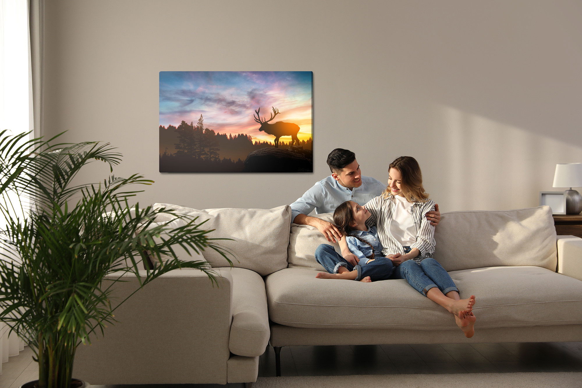 Motivet Deer at sunset återges med hög färgprecision och detaljrikedom tack vare HP Latex-teknologi. Trycket sker med vattenbaserade, luktfria och GREENGUARD Gold-certifierade bläck som ger en upplösning på upp till 300 DPI. Färgerna är UV-beständiga och behåller sin styrka även i ljusa rum, vilket gör tavlan lämplig för både hem- och offentliga miljöer.