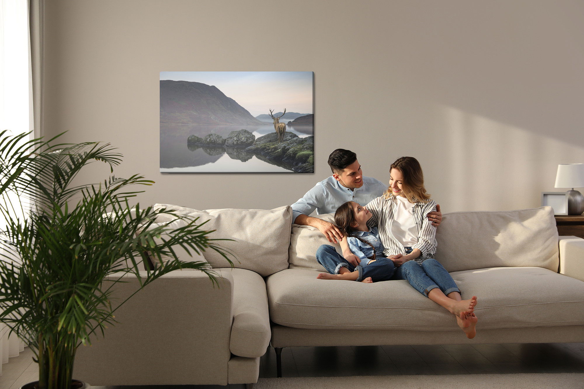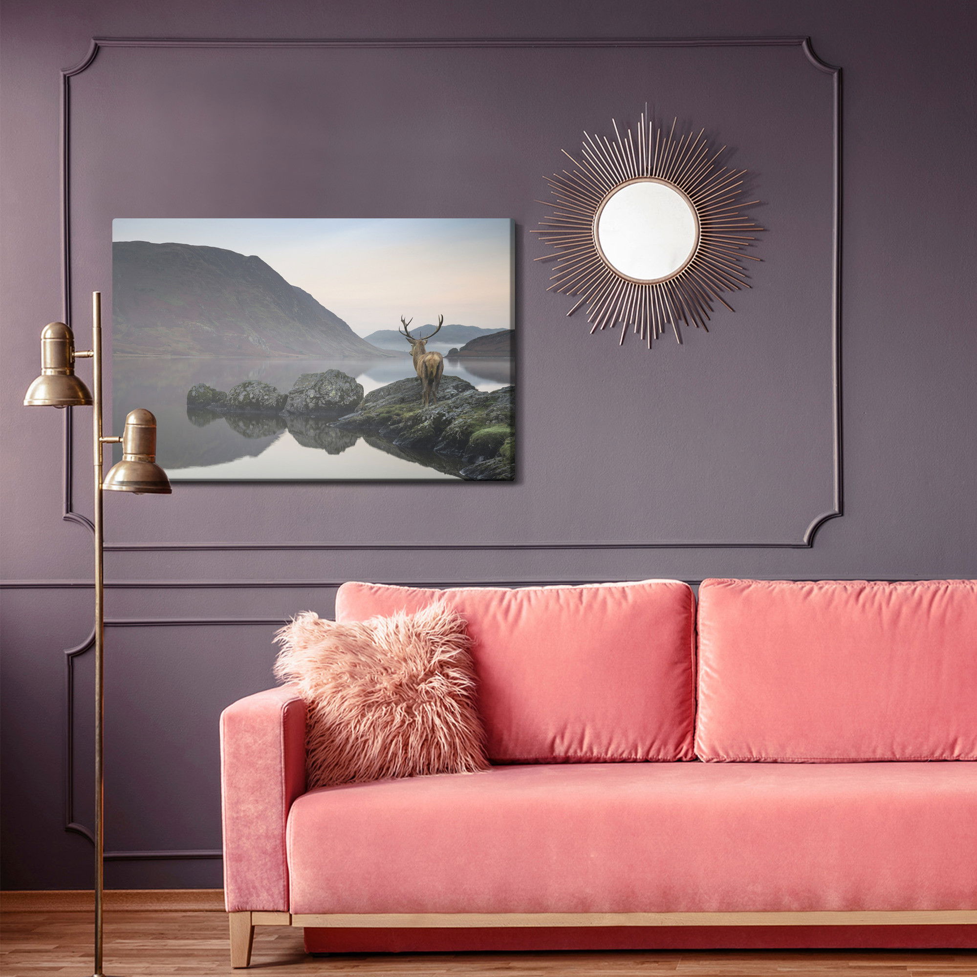 Varje tavla monteras på en massiv fururam. Format upp till 70×50 cm har en ram på 15 mm, medan format från 90×60 cm och uppåt har en ram på 20 mm. Den exakta dukspänningen gör att tavlan håller sin form över tid. Motivet Deer by the lake trycks runt hela ramen vilket ger ett stilrent galleriuttryck där tavlan är lika vacker från sidan som framifrån. Kombinationen av rak dukspänning, rena linjer och korrekt tryck ger en professionell finish.