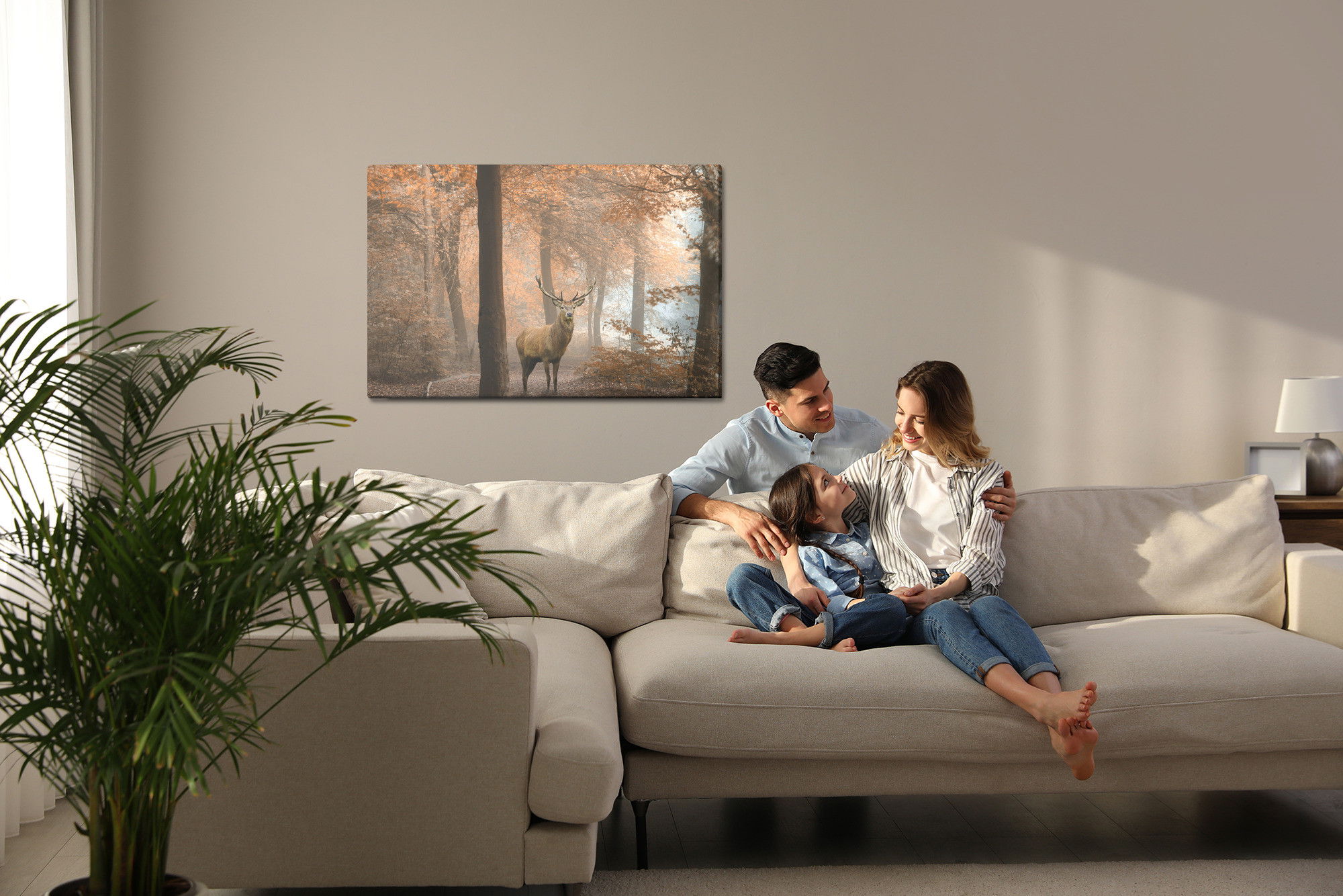 Motivet Deer in the autumn forest återges med hög färgprecision och detaljrikedom tack vare HP Latex-teknologi. Trycket sker med vattenbaserade, luktfria och GREENGUARD Gold-certifierade bläck som ger en upplösning på upp till 300 DPI. Färgerna är UV-beständiga och behåller sin styrka även i ljusa rum, vilket gör tavlan lämplig för både hem- och offentliga miljöer.