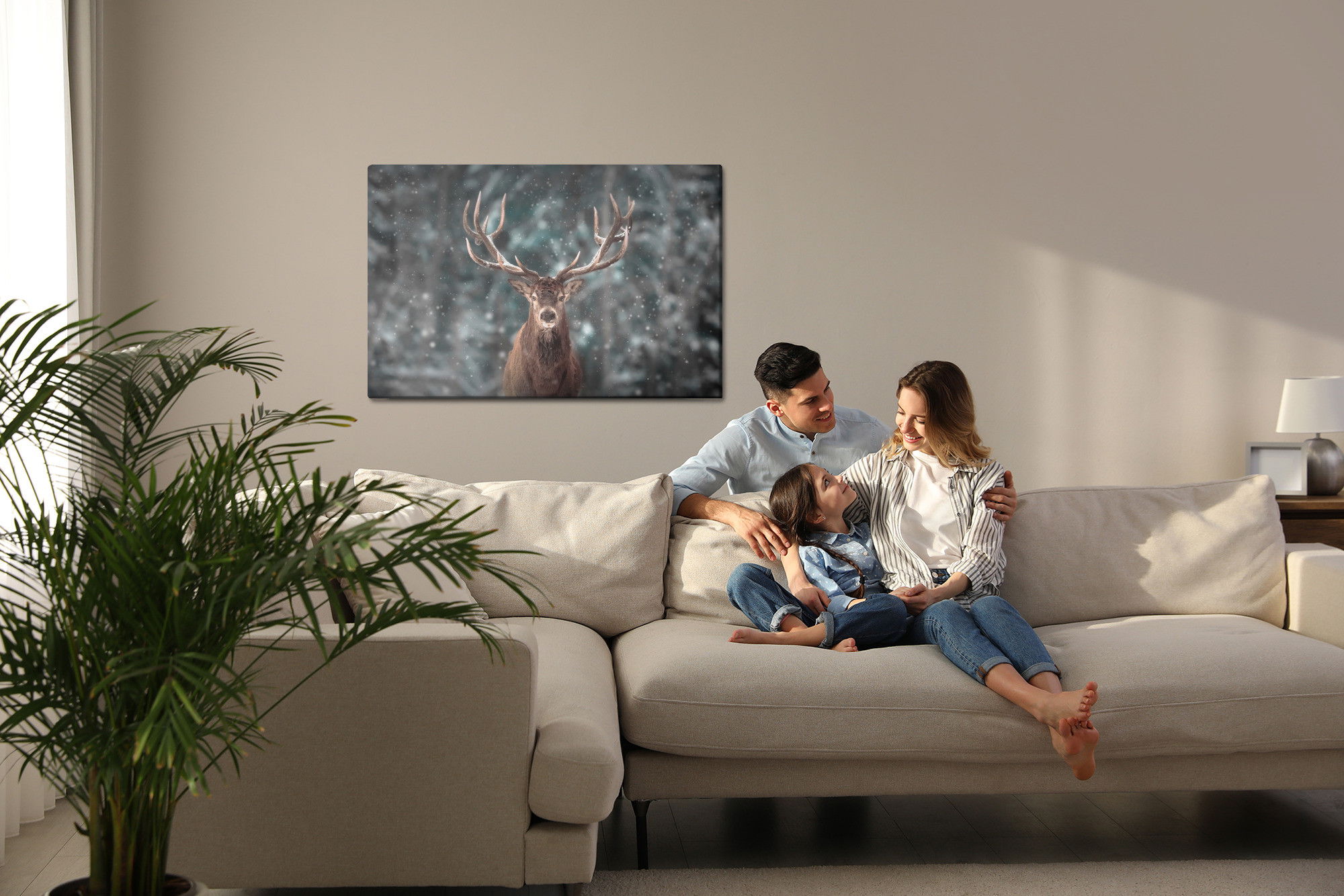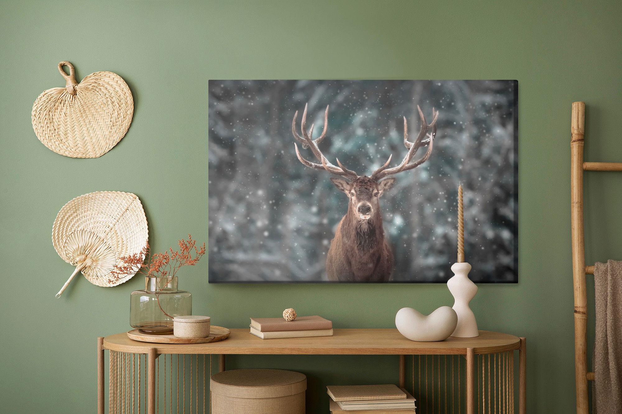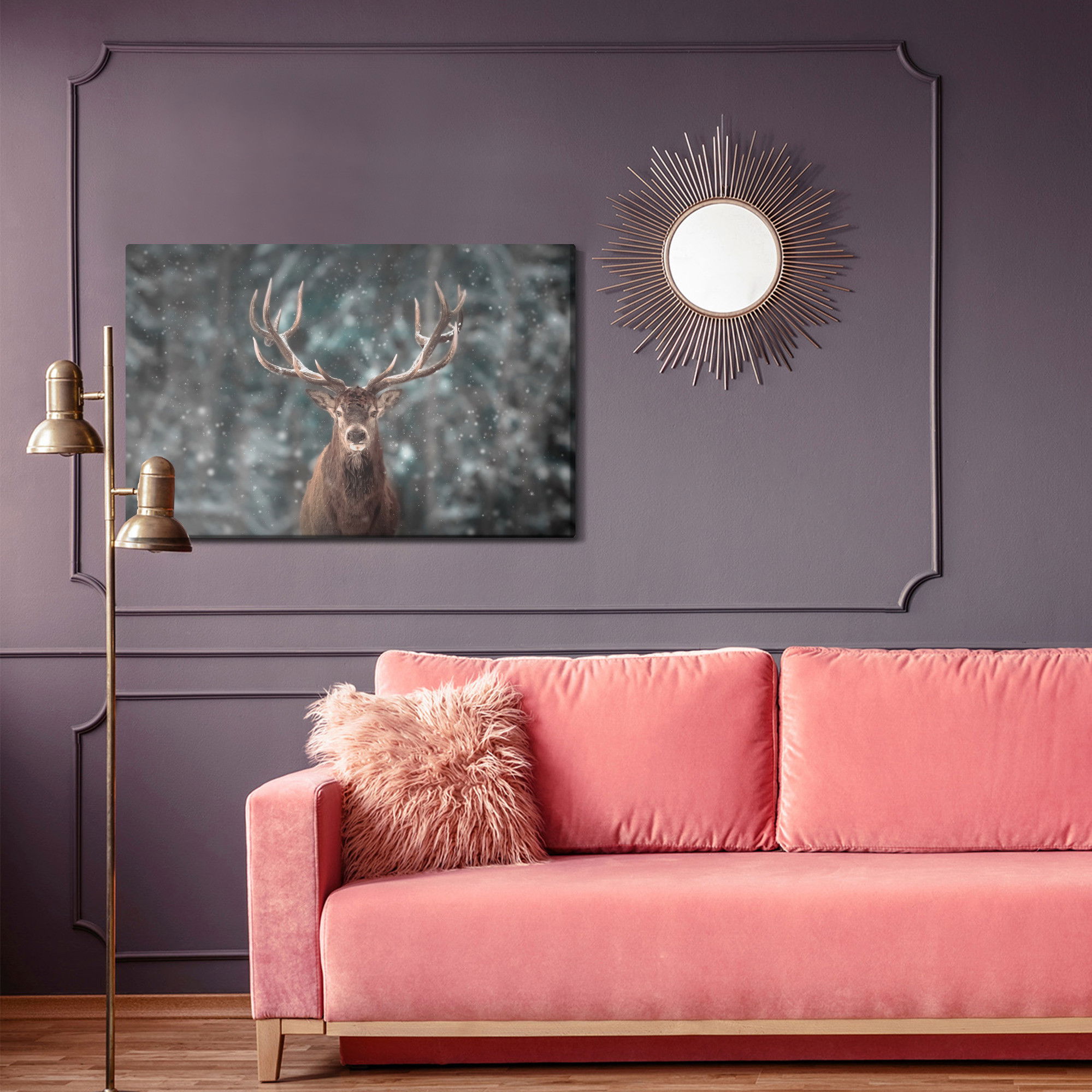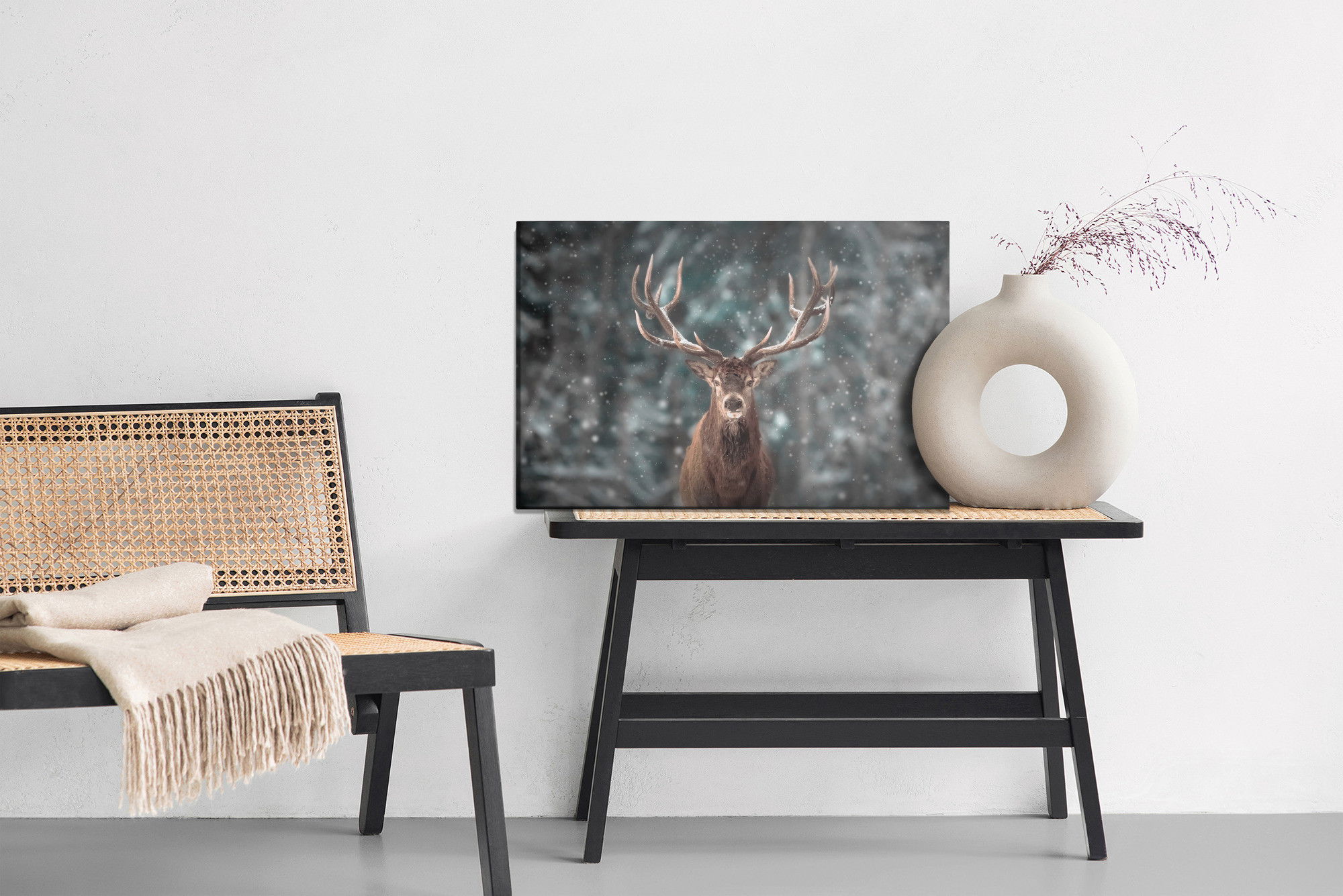 Varje tavla monteras på en massiv fururam. Format upp till 70×50 cm har en ram på 15 mm, medan format från 90×60 cm och uppåt har en ram på 20 mm. Den exakta dukspänningen gör att tavlan håller sin form över tid. Motivet Deer in the middle trycks runt hela ramen vilket ger ett stilrent galleriuttryck där tavlan är lika vacker från sidan som framifrån. Kombinationen av rak dukspänning, rena linjer och korrekt tryck ger en professionell finish.