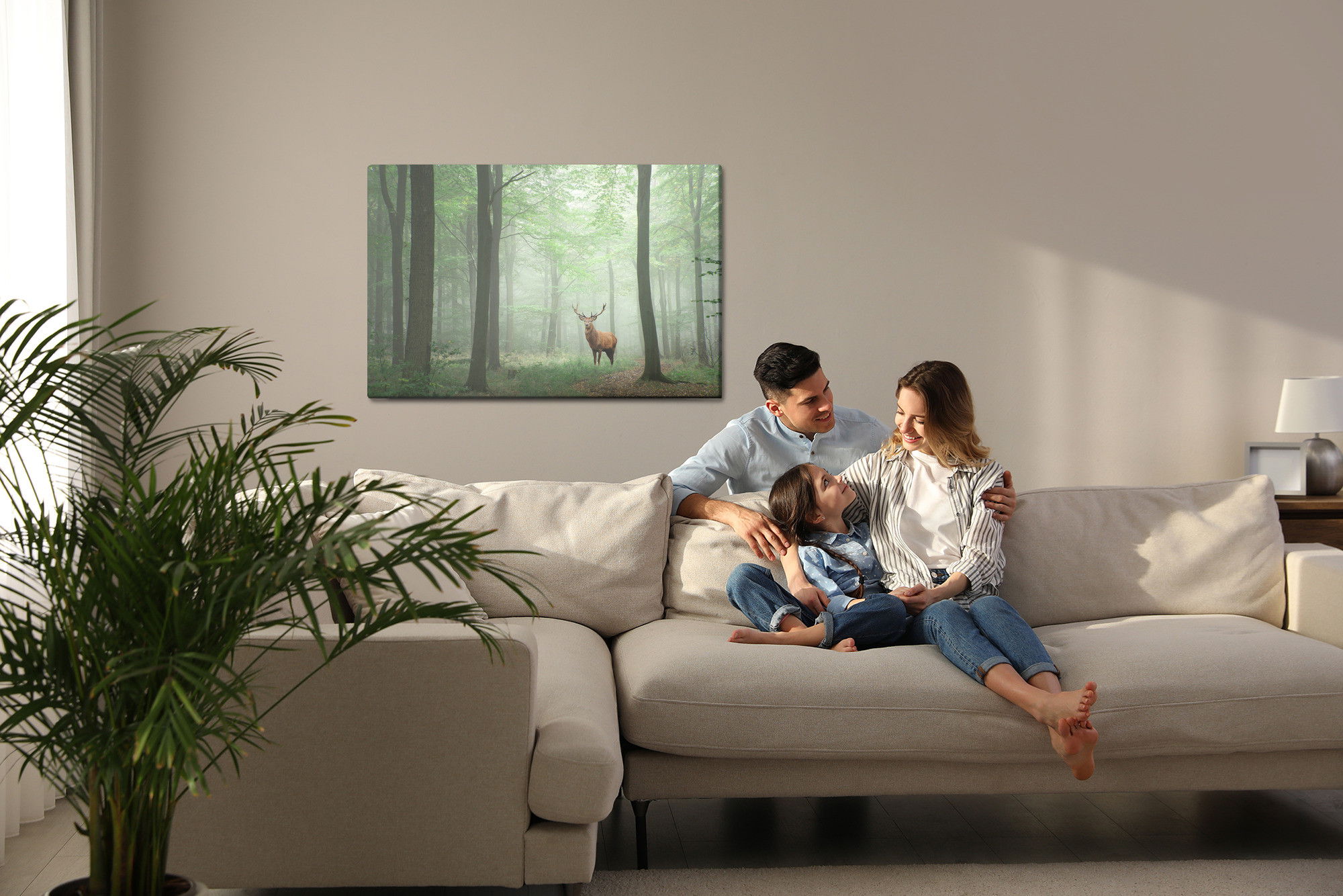 Varje tavla monteras på en massiv fururam. Format upp till 70×50 cm har en ram på 15 mm, medan format från 90×60 cm och uppåt har en ram på 20 mm. Den exakta dukspänningen gör att tavlan håller sin form över tid. Motivet Deer in the misty forest trycks runt hela ramen vilket ger ett stilrent galleriuttryck där tavlan är lika vacker från sidan som framifrån. Kombinationen av rak dukspänning, rena linjer och korrekt tryck ger en professionell finish.