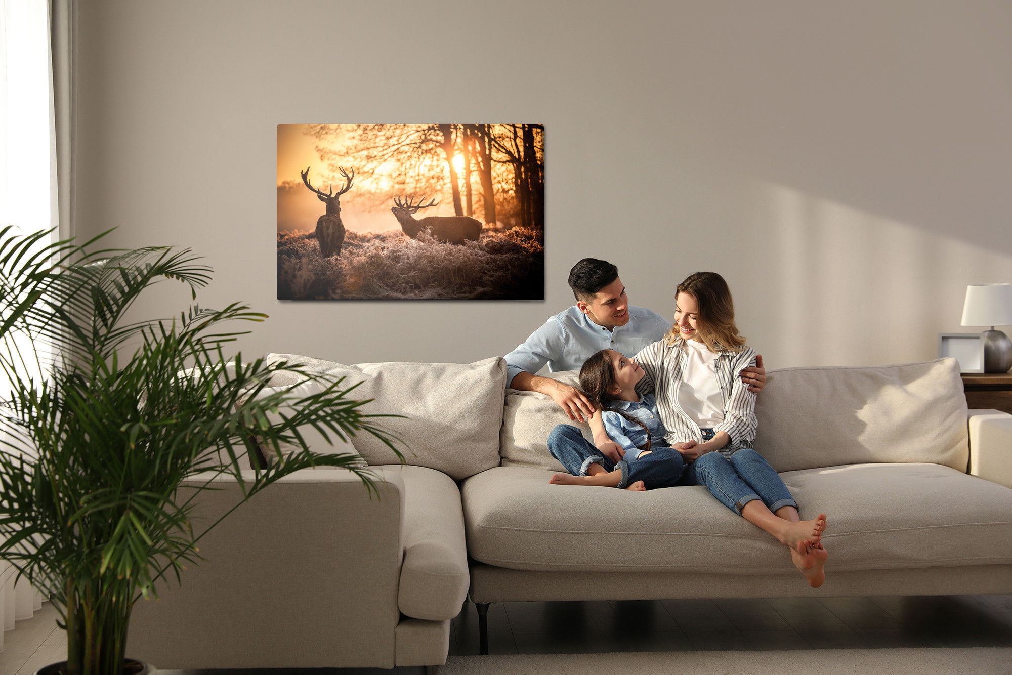 Varje tavla monteras på en massiv fururam. Format upp till 70×50 cm har en ram på 15 mm, medan format från 90×60 cm och uppåt har en ram på 20 mm. Den exakta dukspänningen gör att tavlan håller sin form över tid. Motivet Deer in the morning trycks runt hela ramen vilket ger ett stilrent galleriuttryck där tavlan är lika vacker från sidan som framifrån. Kombinationen av rak dukspänning, rena linjer och korrekt tryck ger en professionell finish.