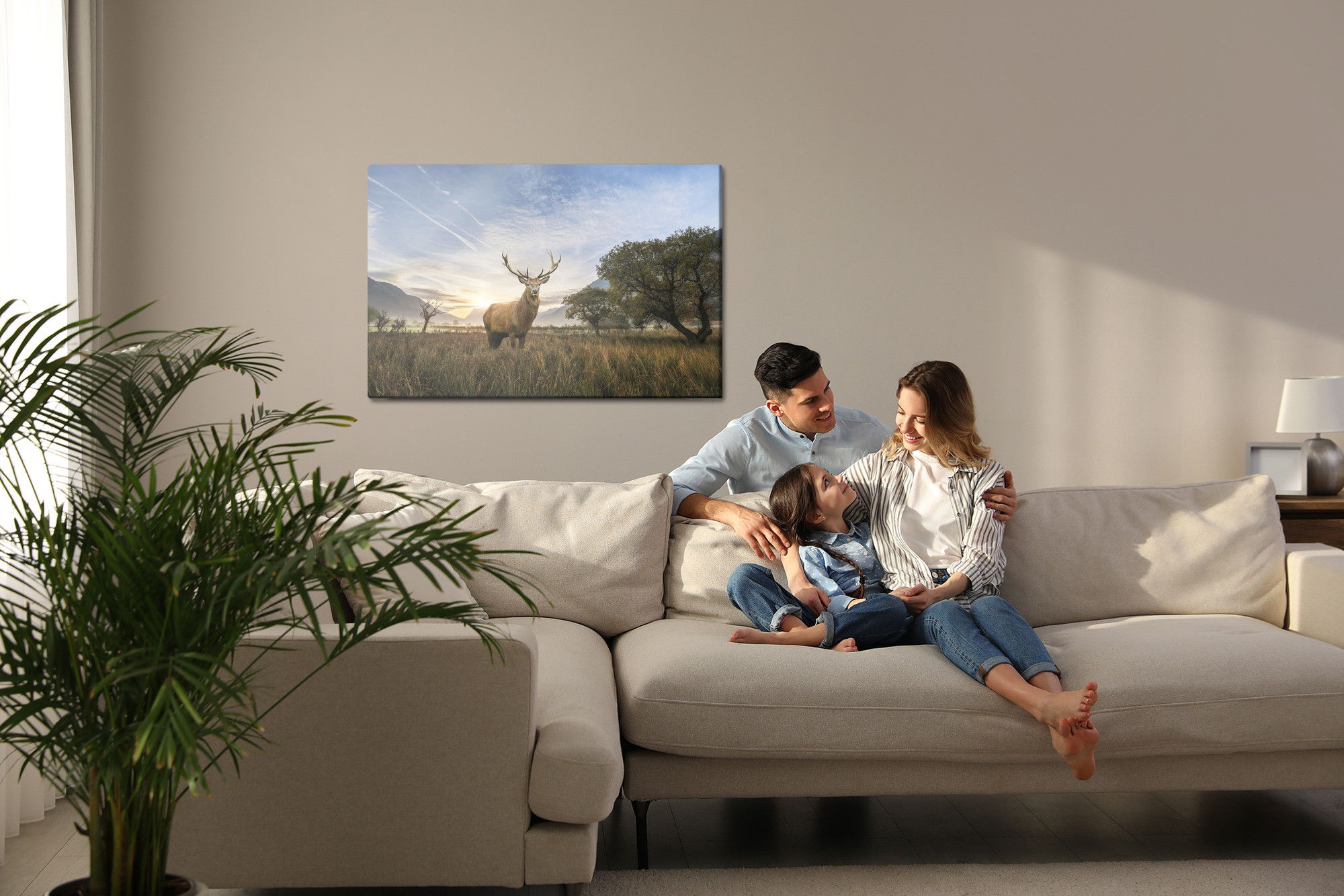 Varje tavla monteras på en massiv fururam. Format upp till 70×50 cm har en ram på 15 mm, medan format från 90×60 cm och uppåt har en ram på 20 mm. Den exakta dukspänningen gör att tavlan håller sin form över tid. Motivet Deer on the background trycks runt hela ramen vilket ger ett stilrent galleriuttryck där tavlan är lika vacker från sidan som framifrån. Kombinationen av rak dukspänning, rena linjer och korrekt tryck ger en professionell finish.