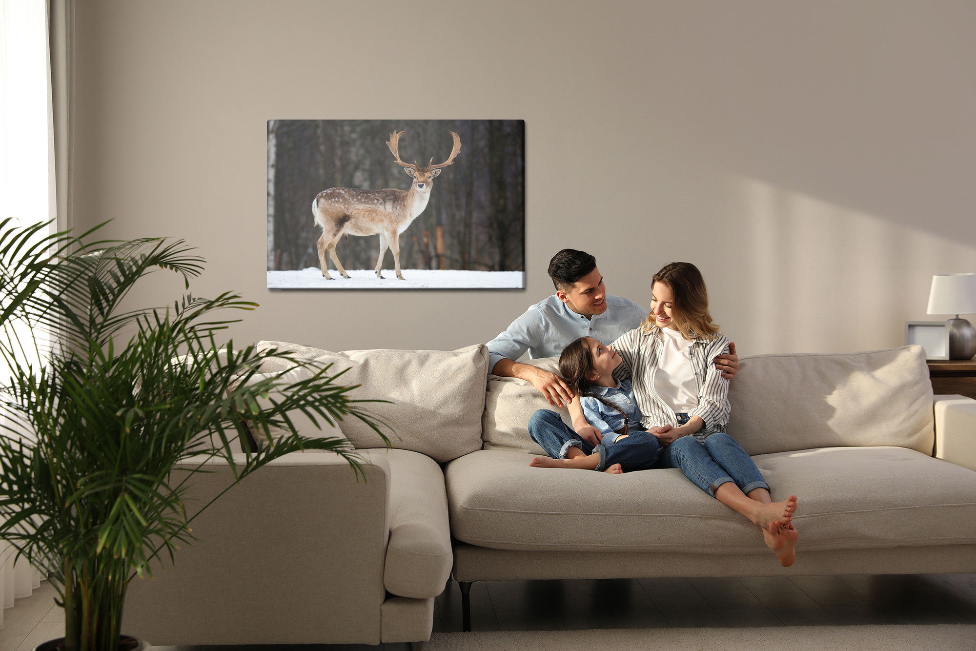 Motivet Deer on the background återges med hög färgprecision och detaljrikedom tack vare HP Latex-teknologi. Trycket sker med vattenbaserade, luktfria och GREENGUARD Gold-certifierade bläck som ger en upplösning på upp till 300 DPI. Färgerna är UV-beständiga och behåller sin styrka även i ljusa rum, vilket gör tavlan lämplig för både hem- och offentliga miljöer.