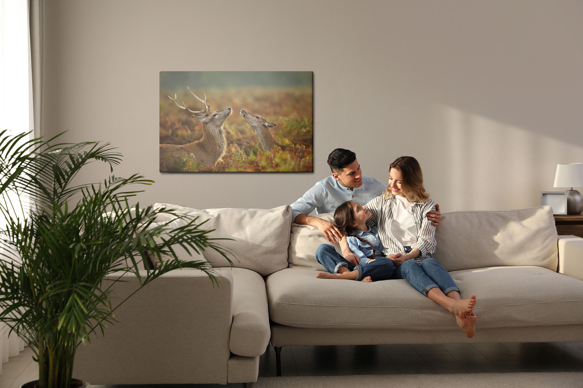 Varje tavla monteras på en massiv fururam. Format upp till 70×50 cm har en ram på 15 mm, medan format från 90×60 cm och uppåt har en ram på 20 mm. Den exakta dukspänningen gör att tavlan håller sin form över tid. Motivet Deer with a doe trycks runt hela ramen vilket ger ett stilrent galleriuttryck där tavlan är lika vacker från sidan som framifrån. Kombinationen av rak dukspänning, rena linjer och korrekt tryck ger en professionell finish.