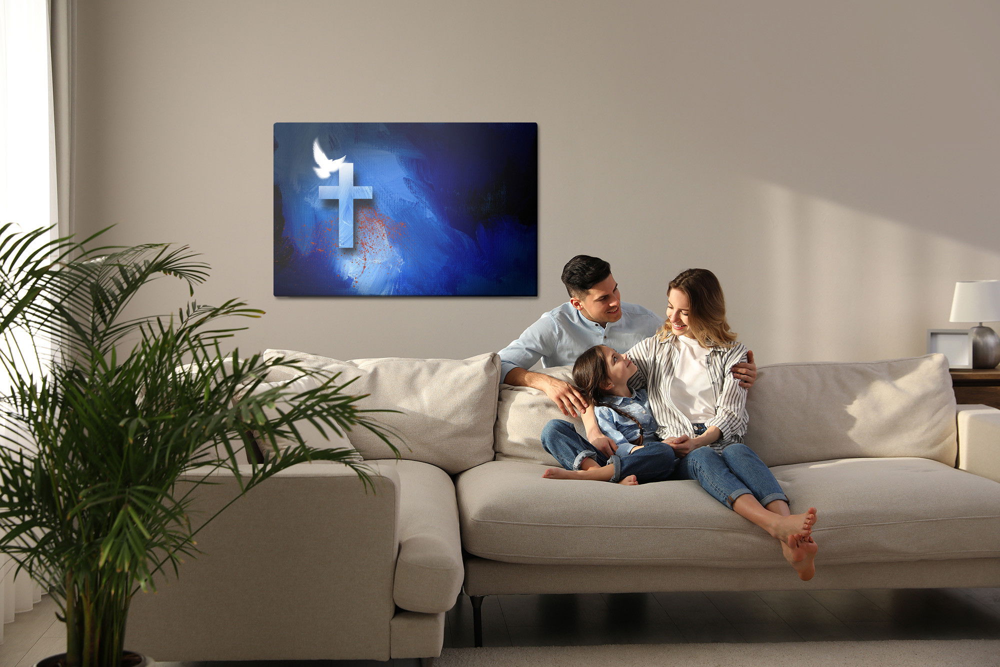 Varje tavla monteras på en massiv fururam. Format upp till 70×50 cm har en ram på 15 mm, medan format från 90×60 cm och uppåt har en ram på 20 mm. Den exakta dukspänningen gör att tavlan håller sin form över tid. Motivet Dove above the cross trycks runt hela ramen vilket ger ett stilrent galleriuttryck där tavlan är lika vacker från sidan som framifrån. Kombinationen av rak dukspänning, rena linjer och korrekt tryck ger en professionell finish.