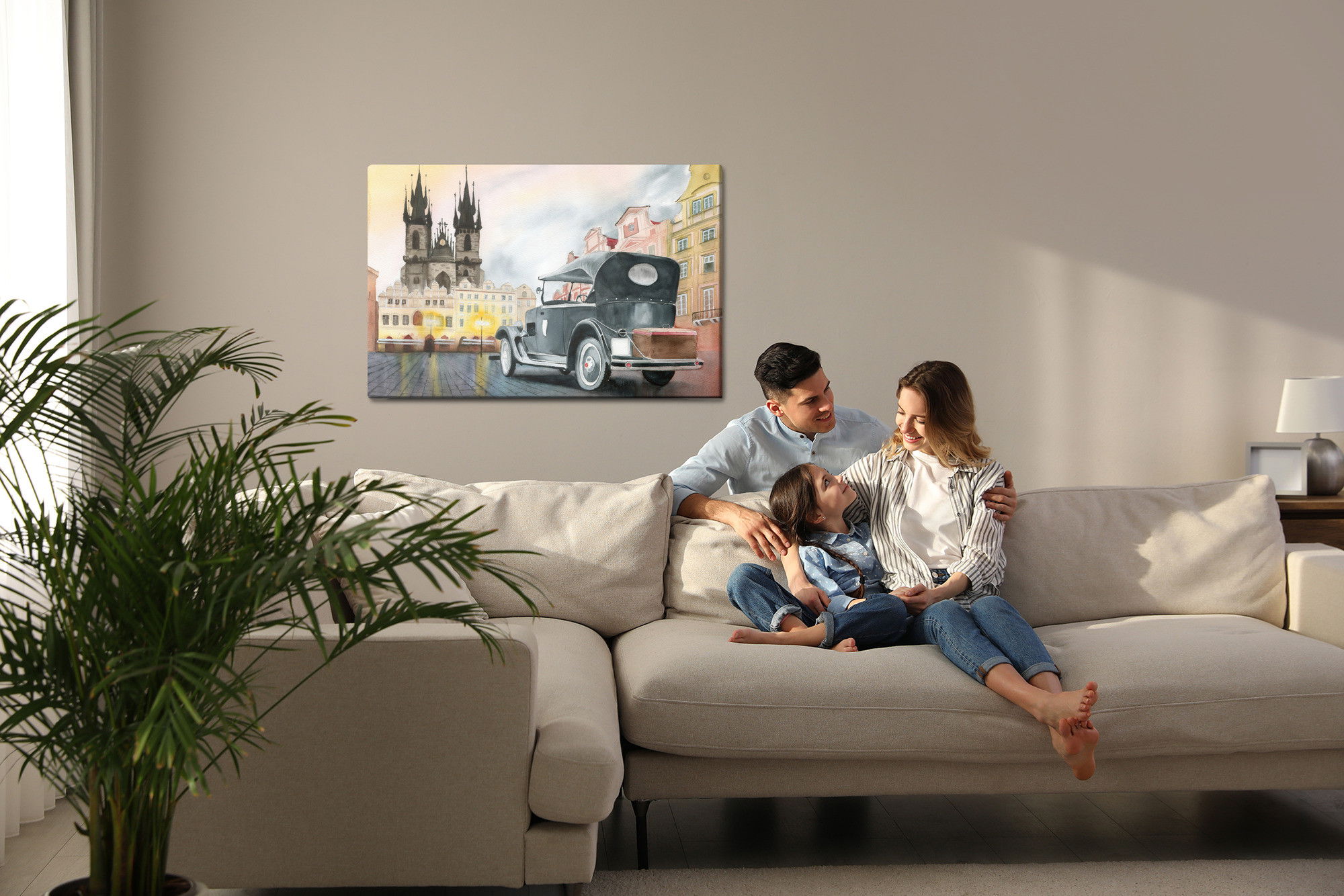 Motivet Downtown with old car återges med hög färgprecision och detaljrikedom tack vare HP Latex-teknologi. Trycket sker med vattenbaserade, luktfria och GREENGUARD Gold-certifierade bläck som ger en upplösning på upp till 300 DPI. Färgerna är UV-beständiga och behåller sin styrka även i ljusa rum, vilket gör tavlan lämplig för både hem- och offentliga miljöer.