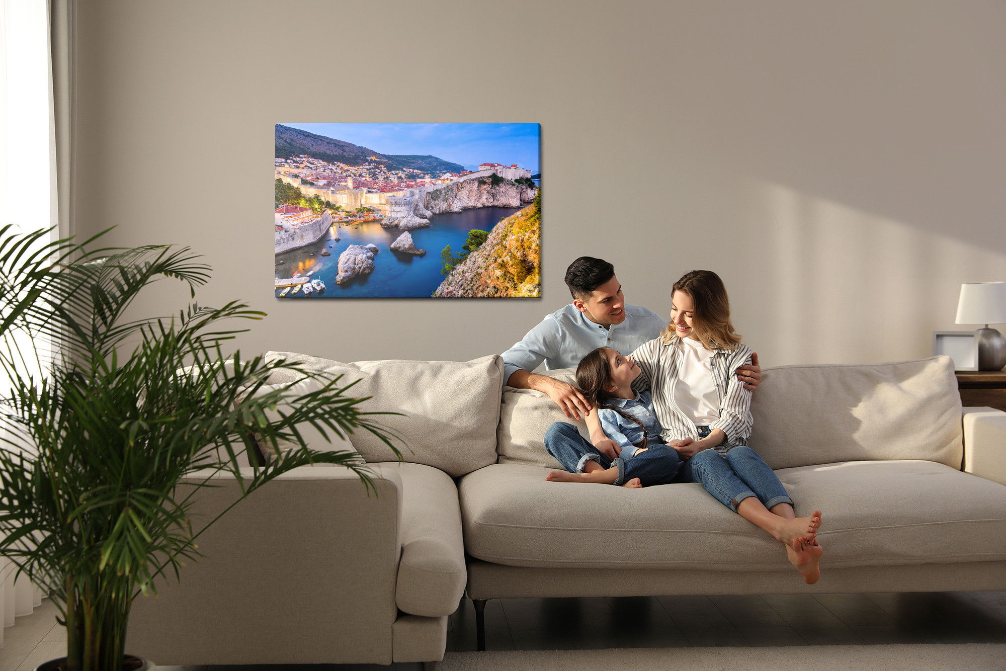 Varje tavla monteras på en massiv fururam. Format upp till 70×50 cm har en ram på 15 mm, medan format från 90×60 cm och uppåt har en ram på 20 mm. Den exakta dukspänningen gör att tavlan håller sin form över tid. Motivet Dubrovnik city, Croatia trycks runt hela ramen vilket ger ett stilrent galleriuttryck där tavlan är lika vacker från sidan som framifrån. Kombinationen av rak dukspänning, rena linjer och korrekt tryck ger en professionell finish.