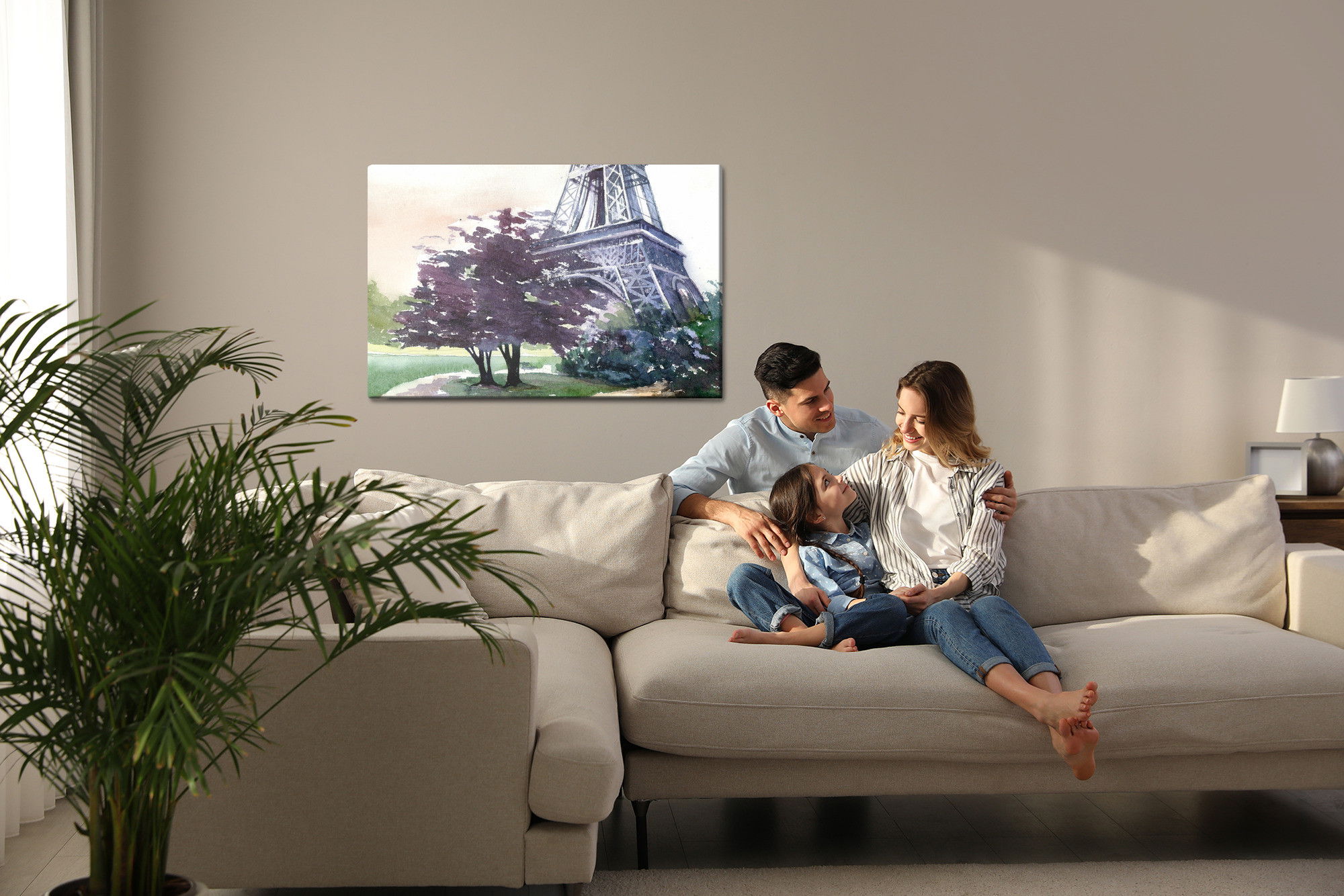 Varje tavla monteras på en massiv fururam. Format upp till 70×50 cm har en ram på 15 mm, medan format från 90×60 cm och uppåt har en ram på 20 mm. Den exakta dukspänningen gör att tavlan håller sin form över tid. Motivet Eiffel tower painted trycks runt hela ramen vilket ger ett stilrent galleriuttryck där tavlan är lika vacker från sidan som framifrån. Kombinationen av rak dukspänning, rena linjer och korrekt tryck ger en professionell finish.