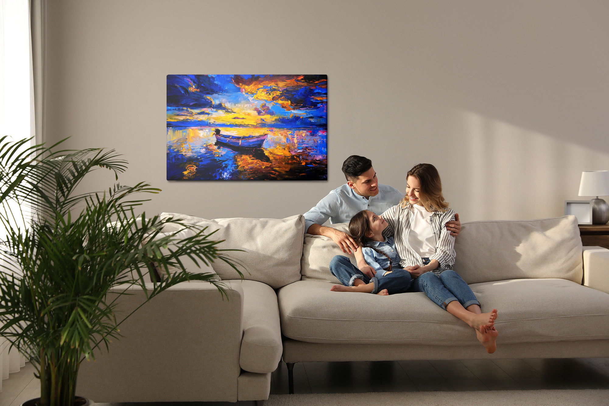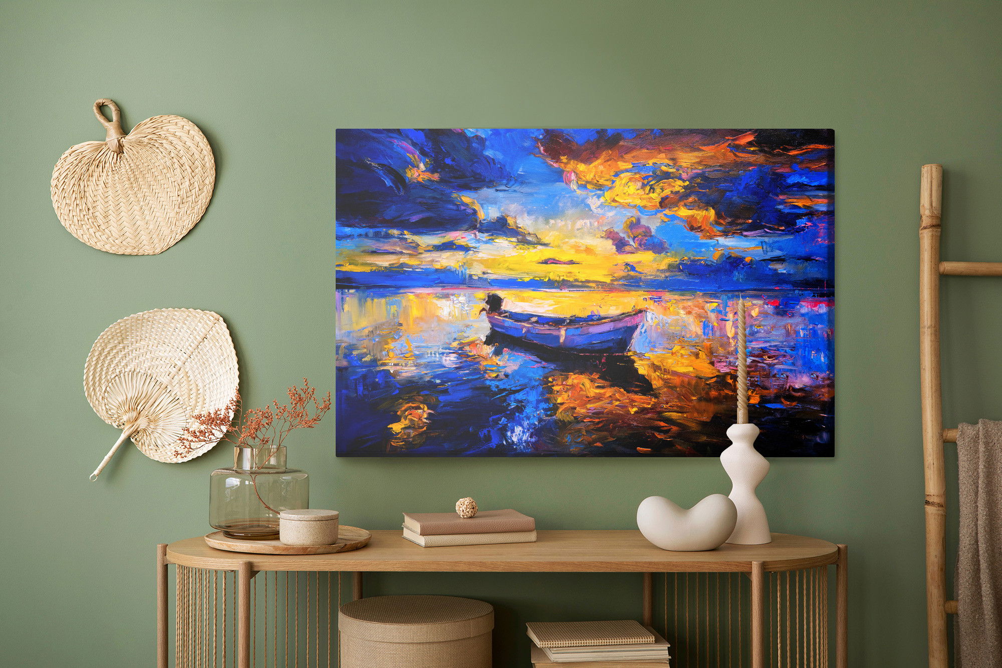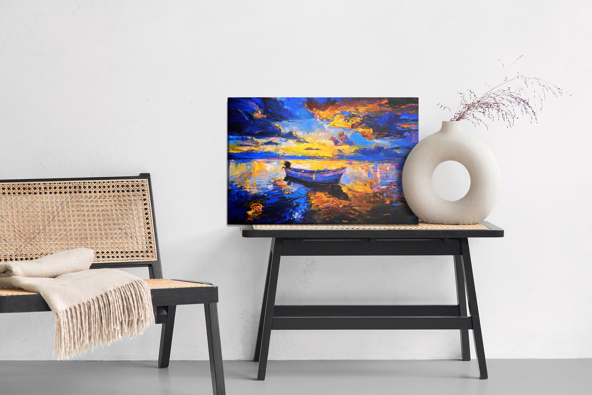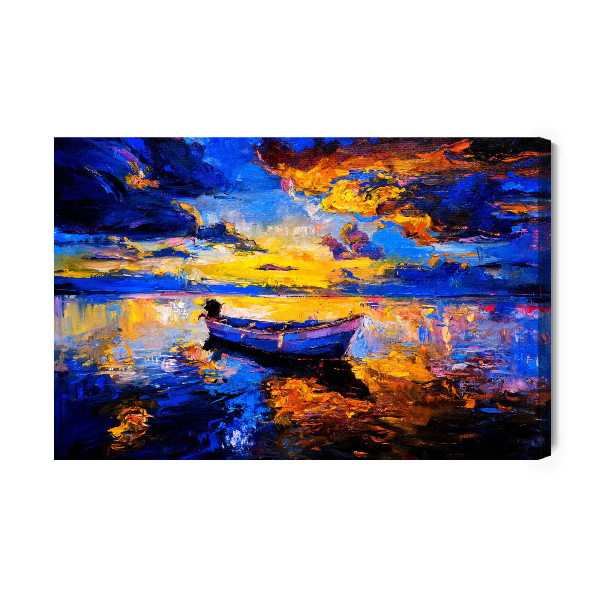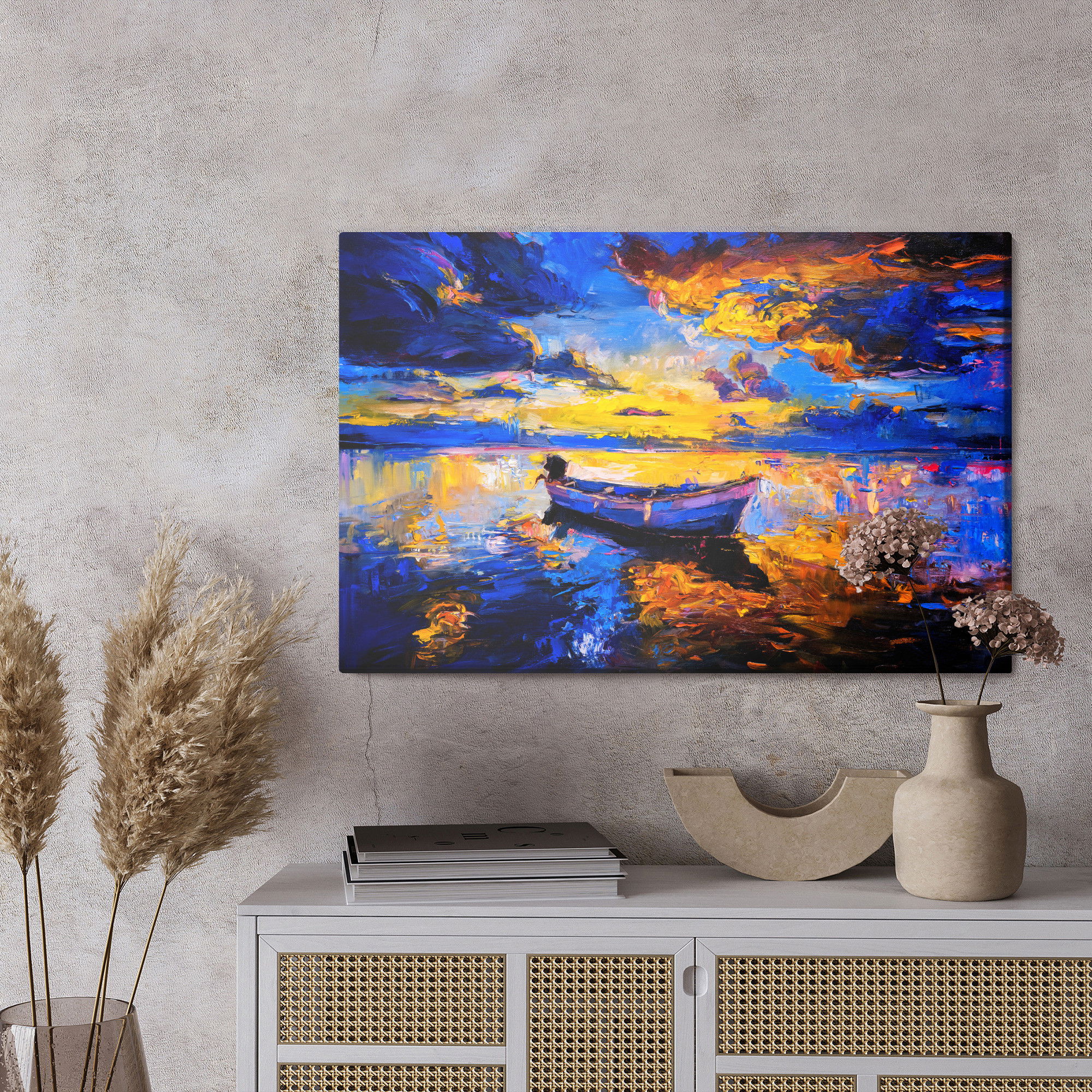 Varje tavla monteras på en massiv fururam. Format upp till 70×50 cm har en ram på 15 mm, medan format från 90×60 cm och uppåt har en ram på 20 mm. Den exakta dukspänningen gör att tavlan håller sin form över tid. Motivet Empty boat in the sea trycks runt hela ramen vilket ger ett stilrent galleriuttryck där tavlan är lika vacker från sidan som framifrån. Kombinationen av rak dukspänning, rena linjer och korrekt tryck ger en professionell finish.