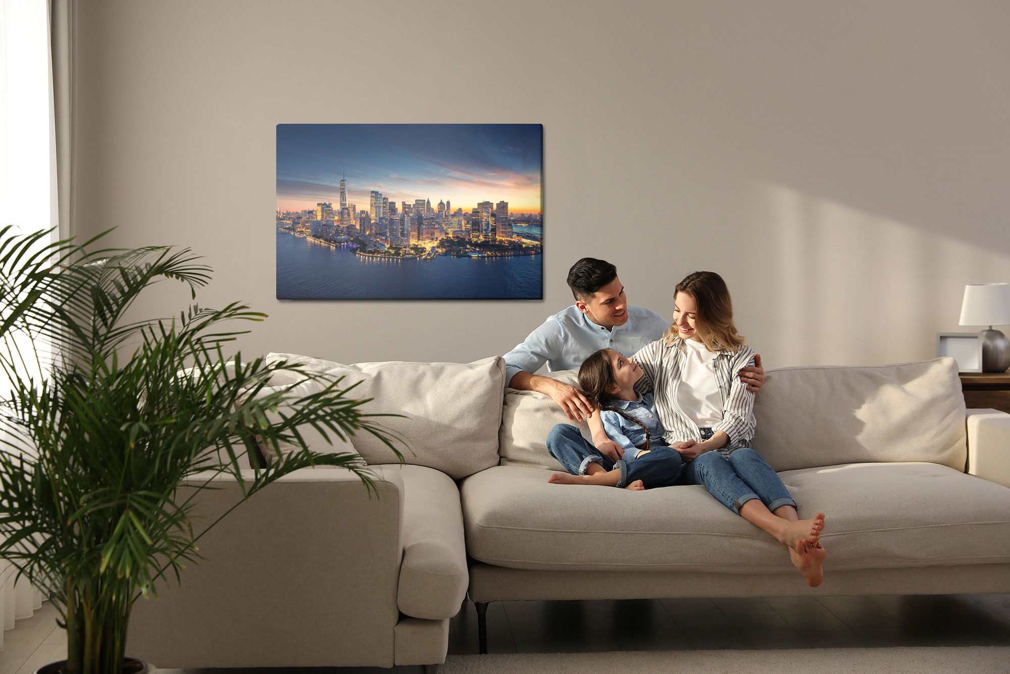 Varje tavla monteras på en massiv fururam. Format upp till 70×50 cm har en ram på 15 mm, medan format från 90×60 cm och uppåt har en ram på 20 mm. Den exakta dukspänningen gör att tavlan håller sin form över tid. Motivet Evening panorama of New York trycks runt hela ramen vilket ger ett stilrent galleriuttryck där tavlan är lika vacker från sidan som framifrån. Kombinationen av rak dukspänning, rena linjer och korrekt tryck ger en professionell finish.