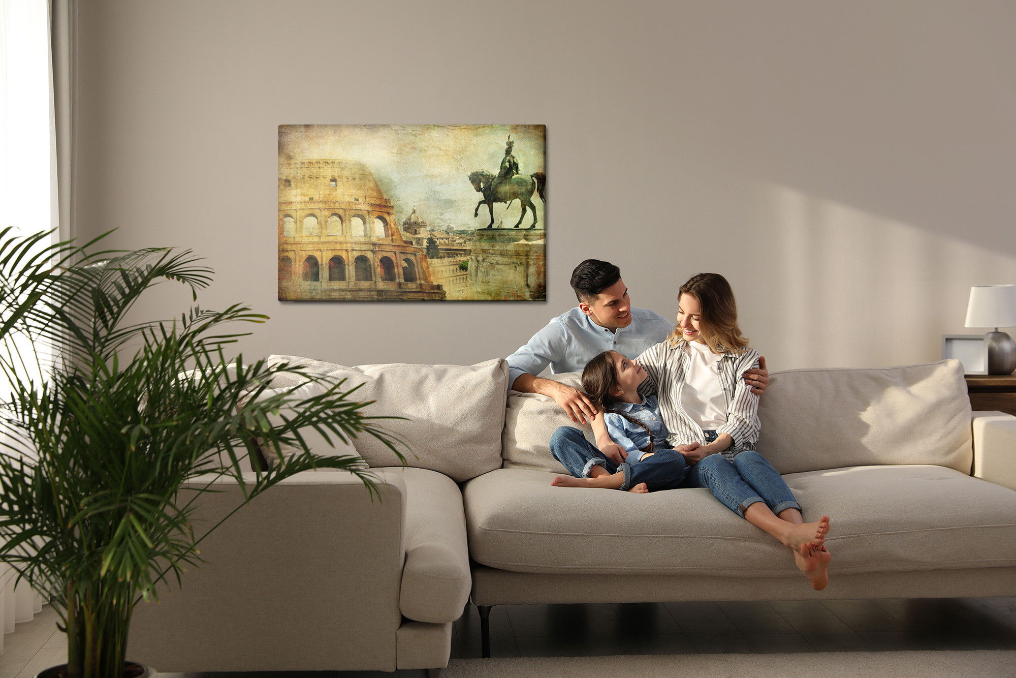 Motivet Famous places in Rome återges med hög färgprecision och detaljrikedom tack vare HP Latex-teknologi. Trycket sker med vattenbaserade, luktfria och GREENGUARD Gold-certifierade bläck som ger en upplösning på upp till 300 DPI. Färgerna är UV-beständiga och behåller sin styrka även i ljusa rum, vilket gör tavlan lämplig för både hem- och offentliga miljöer.