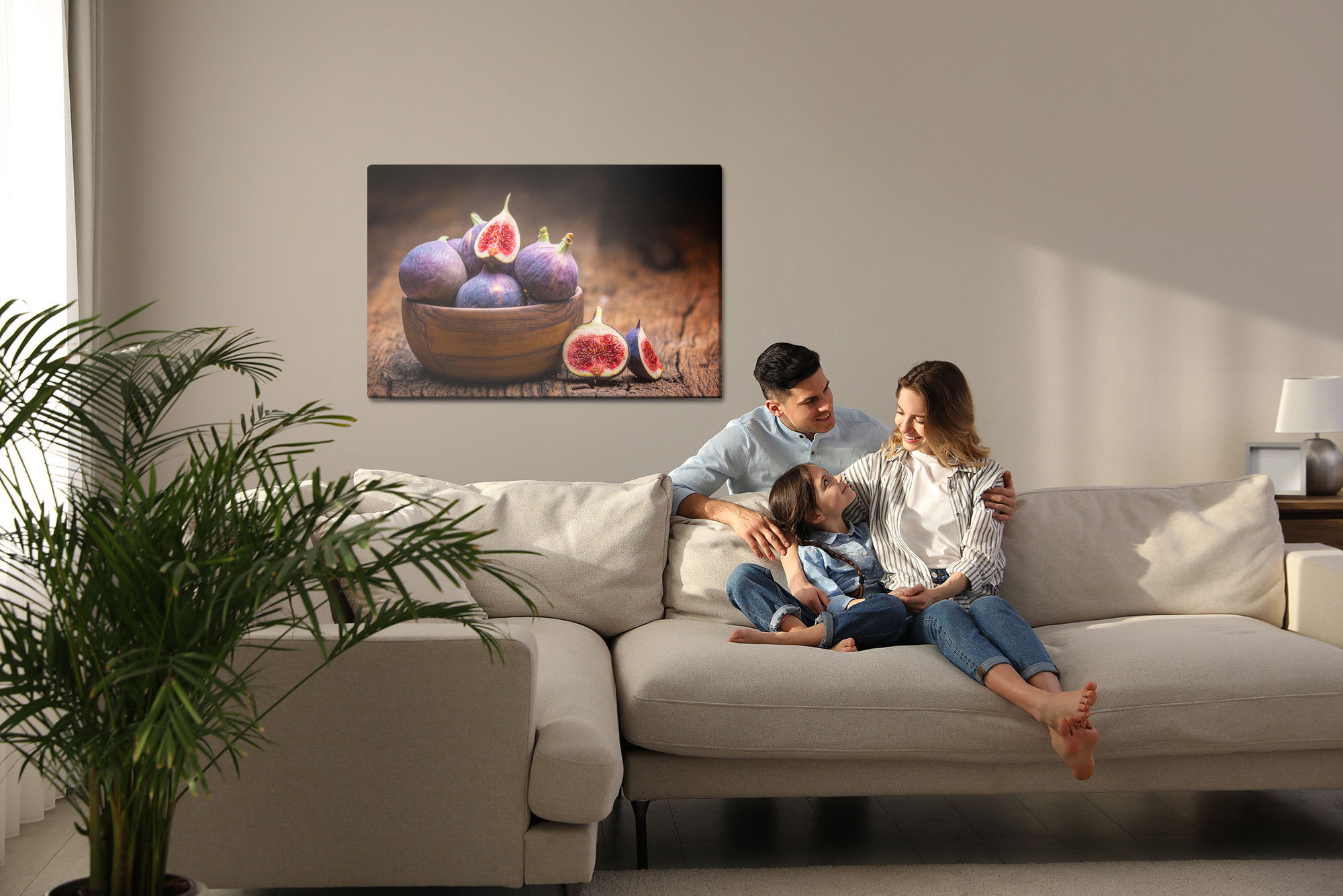 Varje tavla monteras på en massiv fururam. Format upp till 70×50 cm har en ram på 15 mm, medan format från 90×60 cm och uppåt har en ram på 20 mm. Den exakta dukspänningen gör att tavlan håller sin form över tid. Motivet Figs on wood trycks runt hela ramen vilket ger ett stilrent galleriuttryck där tavlan är lika vacker från sidan som framifrån. Kombinationen av rak dukspänning, rena linjer och korrekt tryck ger en professionell finish.