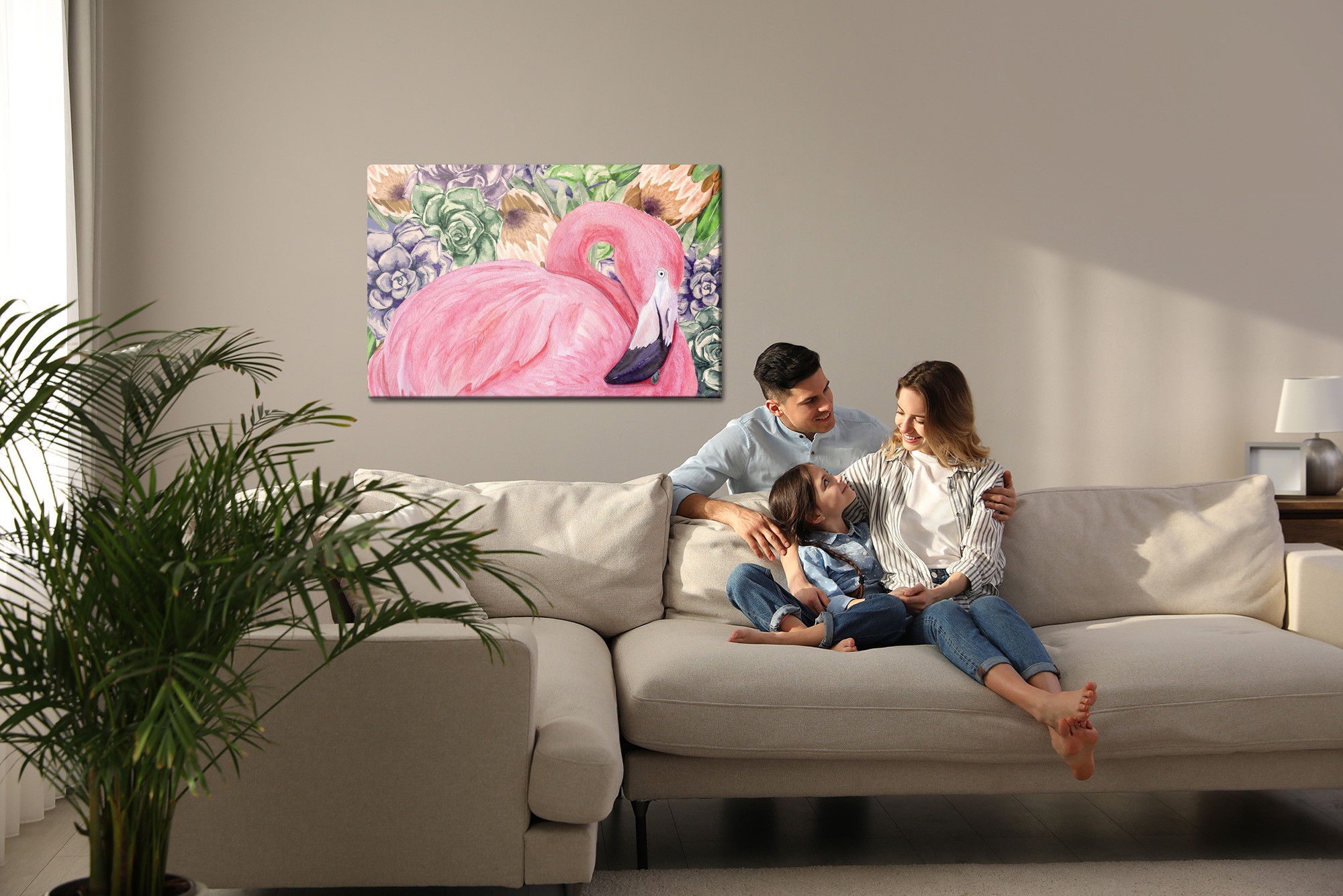 Varje tavla monteras på en massiv fururam. Format upp till 70×50 cm har en ram på 15 mm, medan format från 90×60 cm och uppåt har en ram på 20 mm. Den exakta dukspänningen gör att tavlan håller sin form över tid. Motivet Flamingo and flowers trycks runt hela ramen vilket ger ett stilrent galleriuttryck där tavlan är lika vacker från sidan som framifrån. Kombinationen av rak dukspänning, rena linjer och korrekt tryck ger en professionell finish.