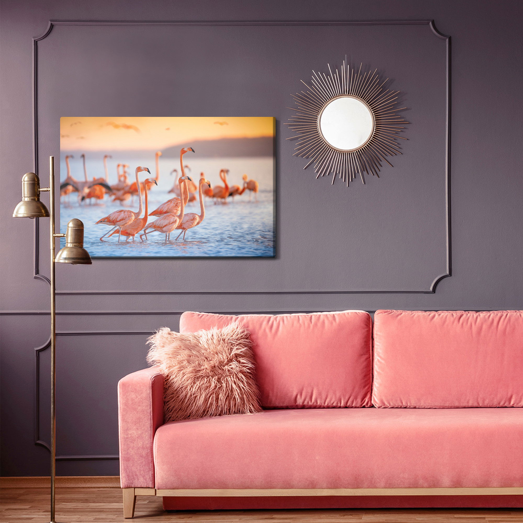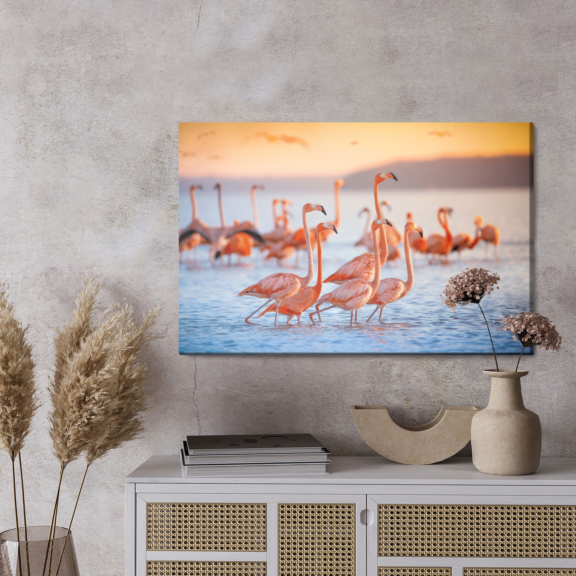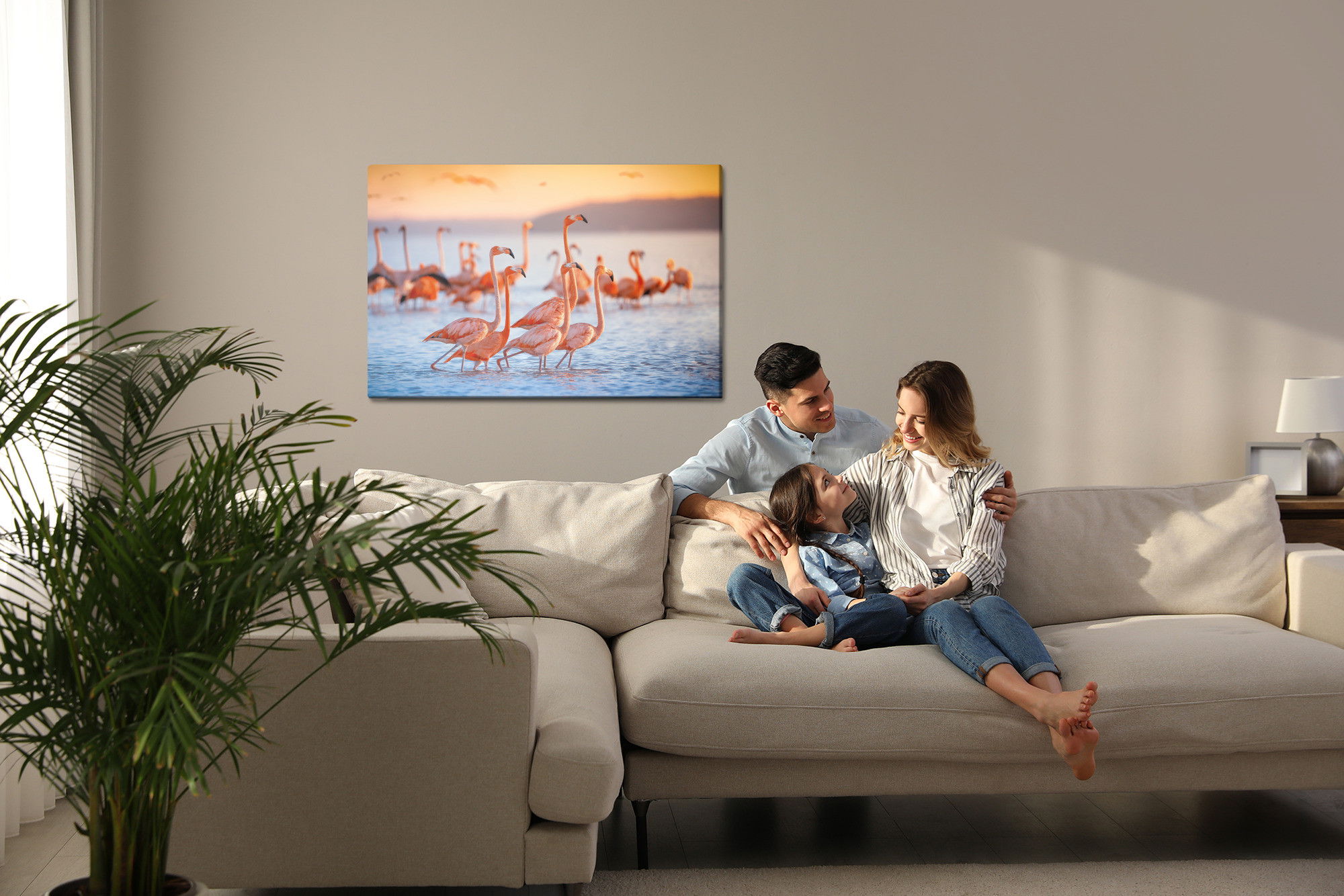 Motivet Flamingos birds återges med hög färgprecision och detaljrikedom tack vare HP Latex-teknologi. Trycket sker med vattenbaserade, luktfria och GREENGUARD Gold-certifierade bläck som ger en upplösning på upp till 300 DPI. Färgerna är UV-beständiga och behåller sin styrka även i ljusa rum, vilket gör tavlan lämplig för både hem- och offentliga miljöer.