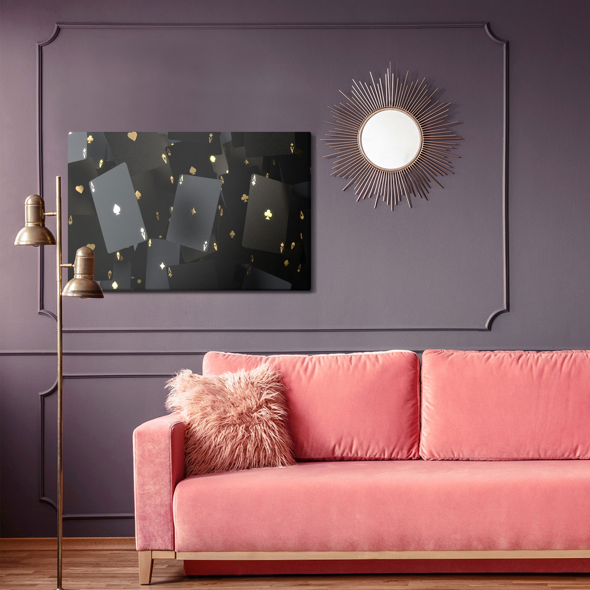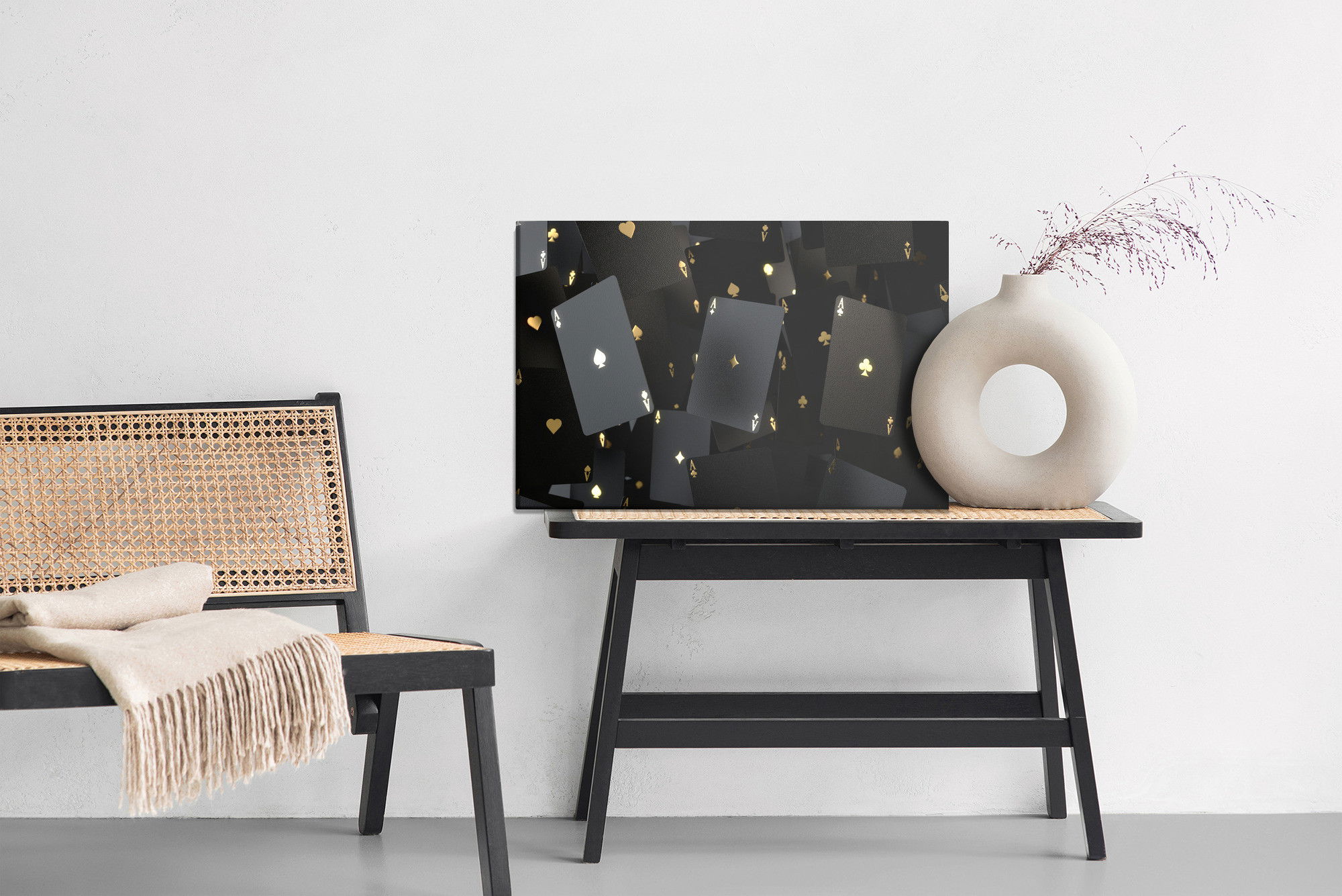 Motivet Floating black cards återges med hög färgprecision och detaljrikedom tack vare HP Latex-teknologi. Trycket sker med vattenbaserade, luktfria och GREENGUARD Gold-certifierade bläck som ger en upplösning på upp till 300 DPI. Färgerna är UV-beständiga och behåller sin styrka även i ljusa rum, vilket gör tavlan lämplig för både hem- och offentliga miljöer.