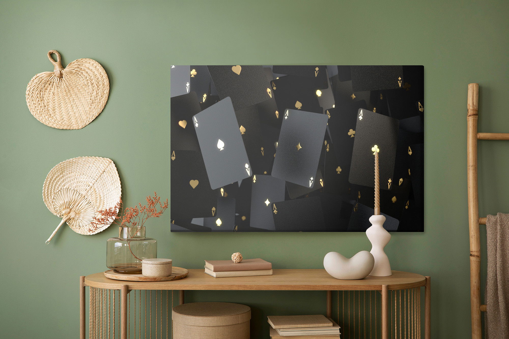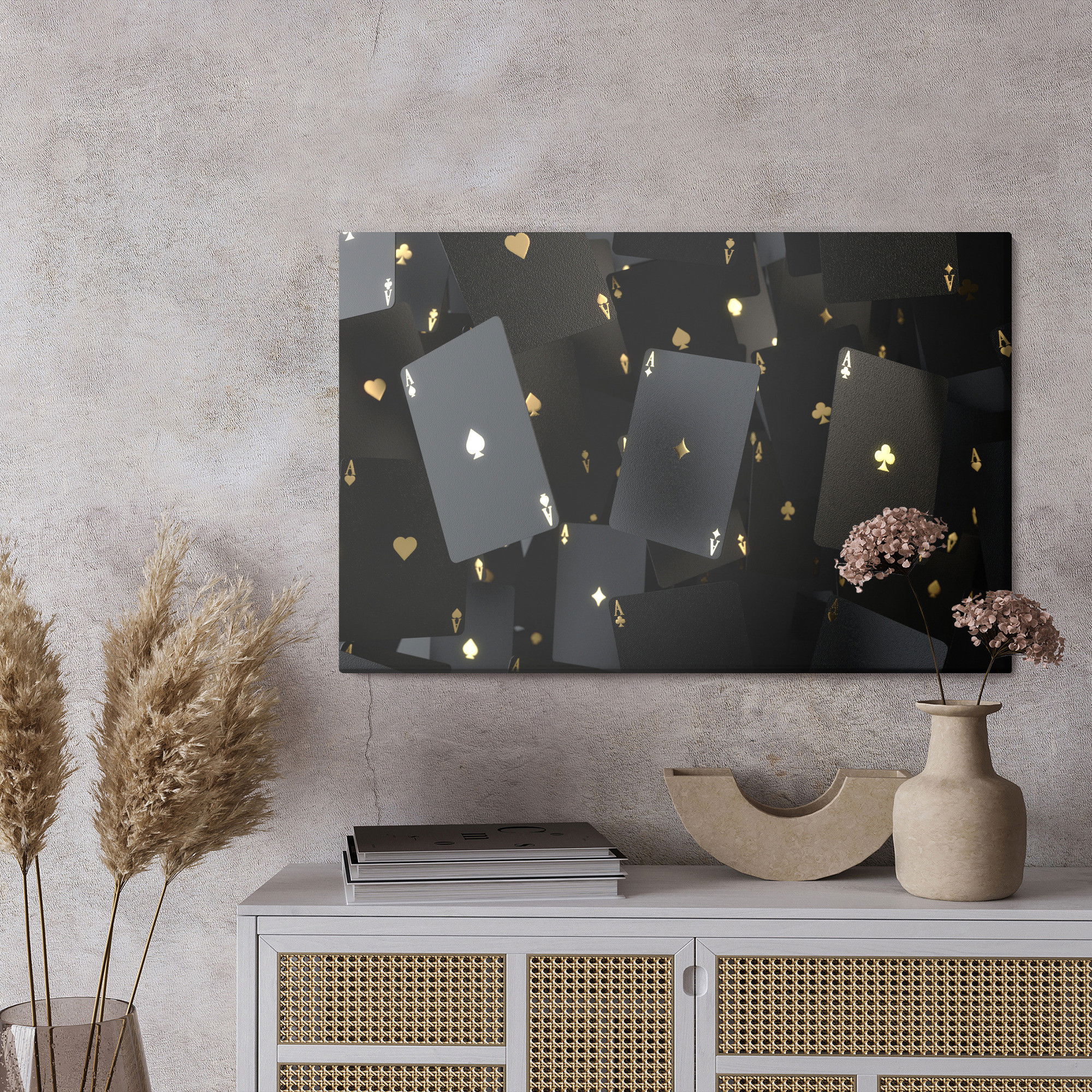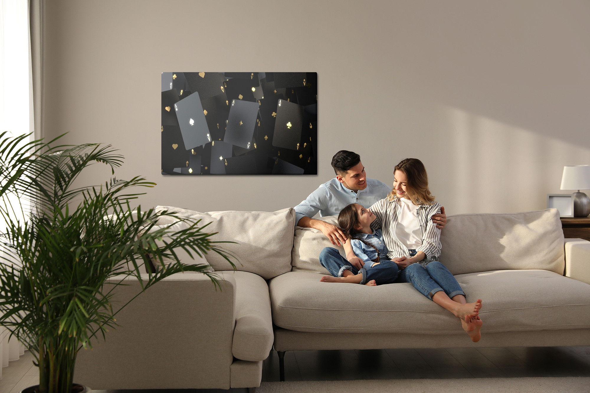 Varje tavla monteras på en massiv fururam. Format upp till 70×50 cm har en ram på 15 mm, medan format från 90×60 cm och uppåt har en ram på 20 mm. Den exakta dukspänningen gör att tavlan håller sin form över tid. Motivet Floating black cards trycks runt hela ramen vilket ger ett stilrent galleriuttryck där tavlan är lika vacker från sidan som framifrån. Kombinationen av rak dukspänning, rena linjer och korrekt tryck ger en professionell finish.