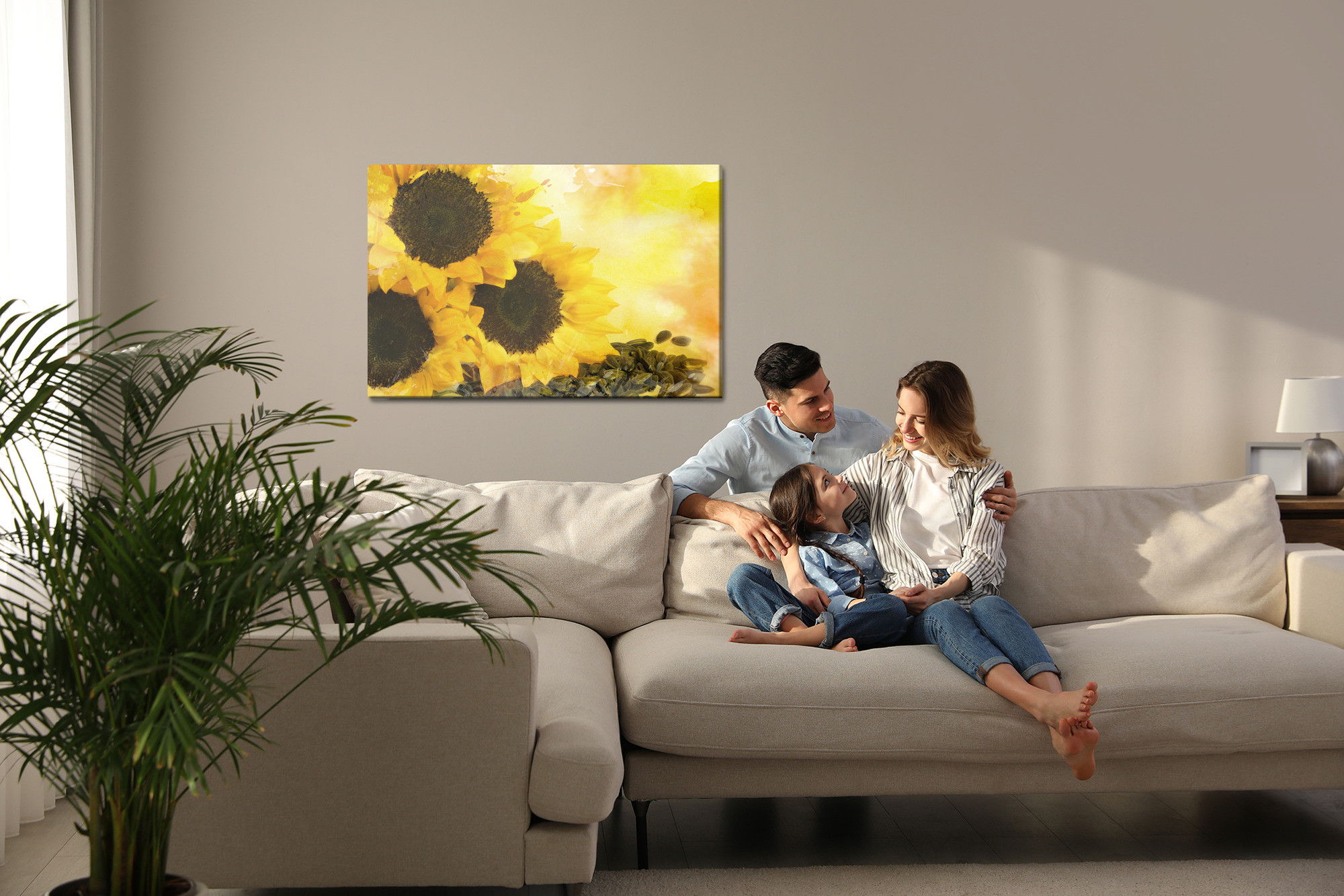 Varje tavla monteras på en massiv fururam. Format upp till 70×50 cm har en ram på 15 mm, medan format från 90×60 cm och uppåt har en ram på 20 mm. Den exakta dukspänningen gör att tavlan håller sin form över tid. Motivet Flowers and sunflower seeds trycks runt hela ramen vilket ger ett stilrent galleriuttryck där tavlan är lika vacker från sidan som framifrån. Kombinationen av rak dukspänning, rena linjer och korrekt tryck ger en professionell finish.