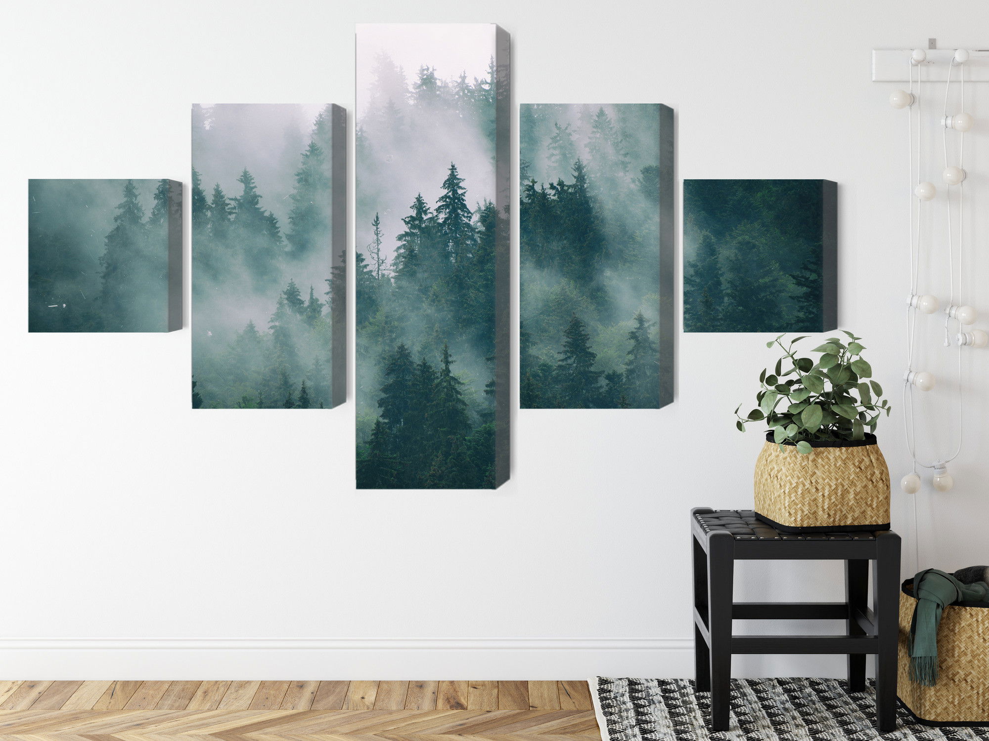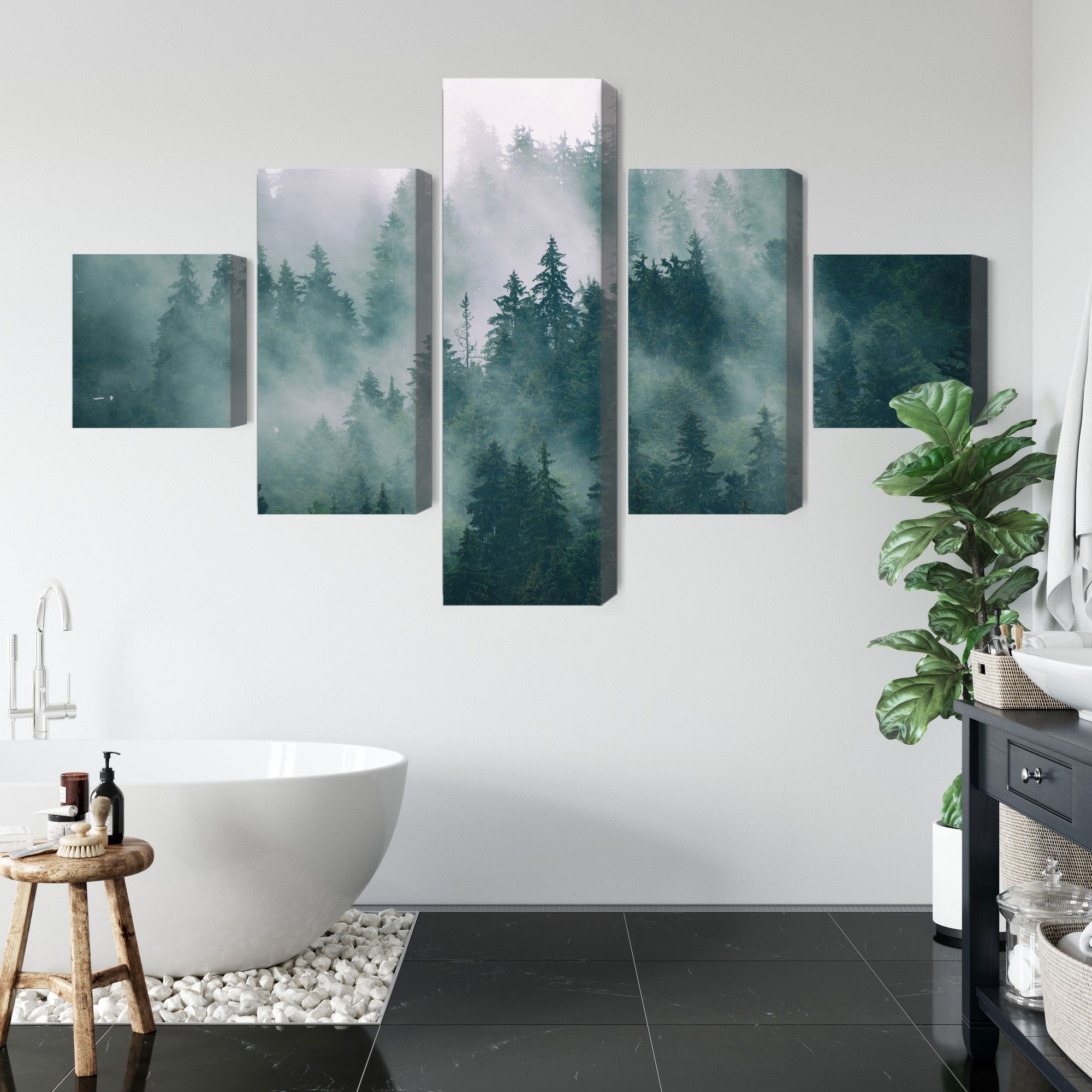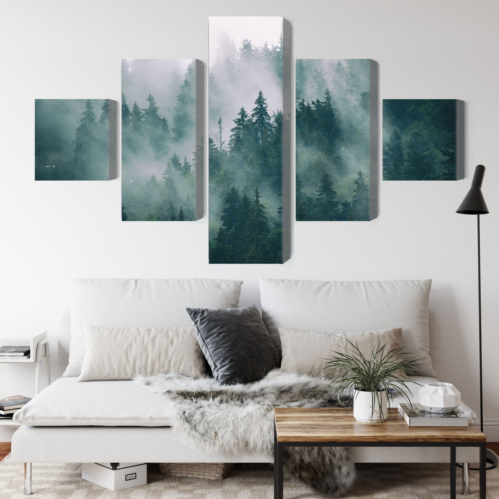 Varje tavla monteras på en massiv fururam. Format upp till 70×50 cm har en ram på 15 mm, medan format från 90×60 cm och uppåt har en ram på 20 mm. Den exakta dukspänningen gör att tavlan håller sin form över tid. Motivet Fog in the green forest trycks runt hela ramen vilket ger ett stilrent galleriuttryck där tavlan är lika vacker från sidan som framifrån. Kombinationen av rak dukspänning, rena linjer och korrekt tryck ger en professionell finish.