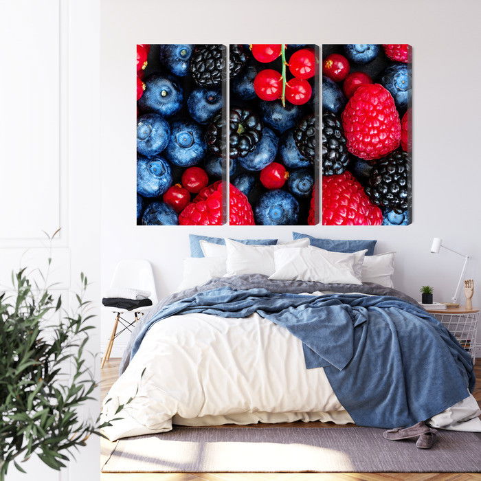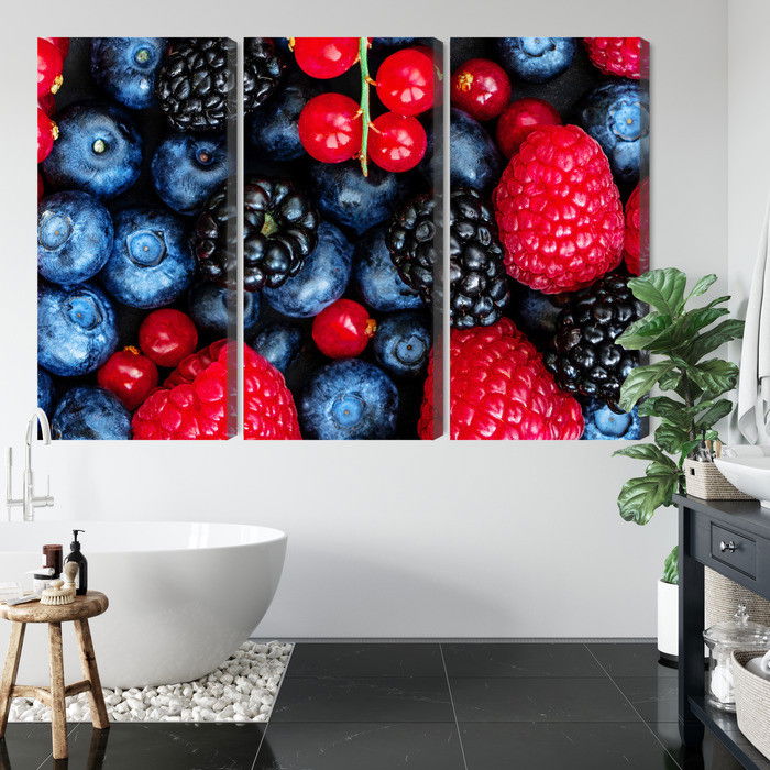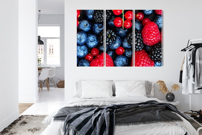Motivet Forest fruits on a macro återges med hög färgprecision och detaljrikedom tack vare HP Latex-teknologi. Trycket sker med vattenbaserade, luktfria och GREENGUARD Gold-certifierade bläck som ger en upplösning på upp till 300 DPI. Färgerna är UV-beständiga och behåller sin styrka även i ljusa rum, vilket gör tavlan lämplig för både hem- och offentliga miljöer.