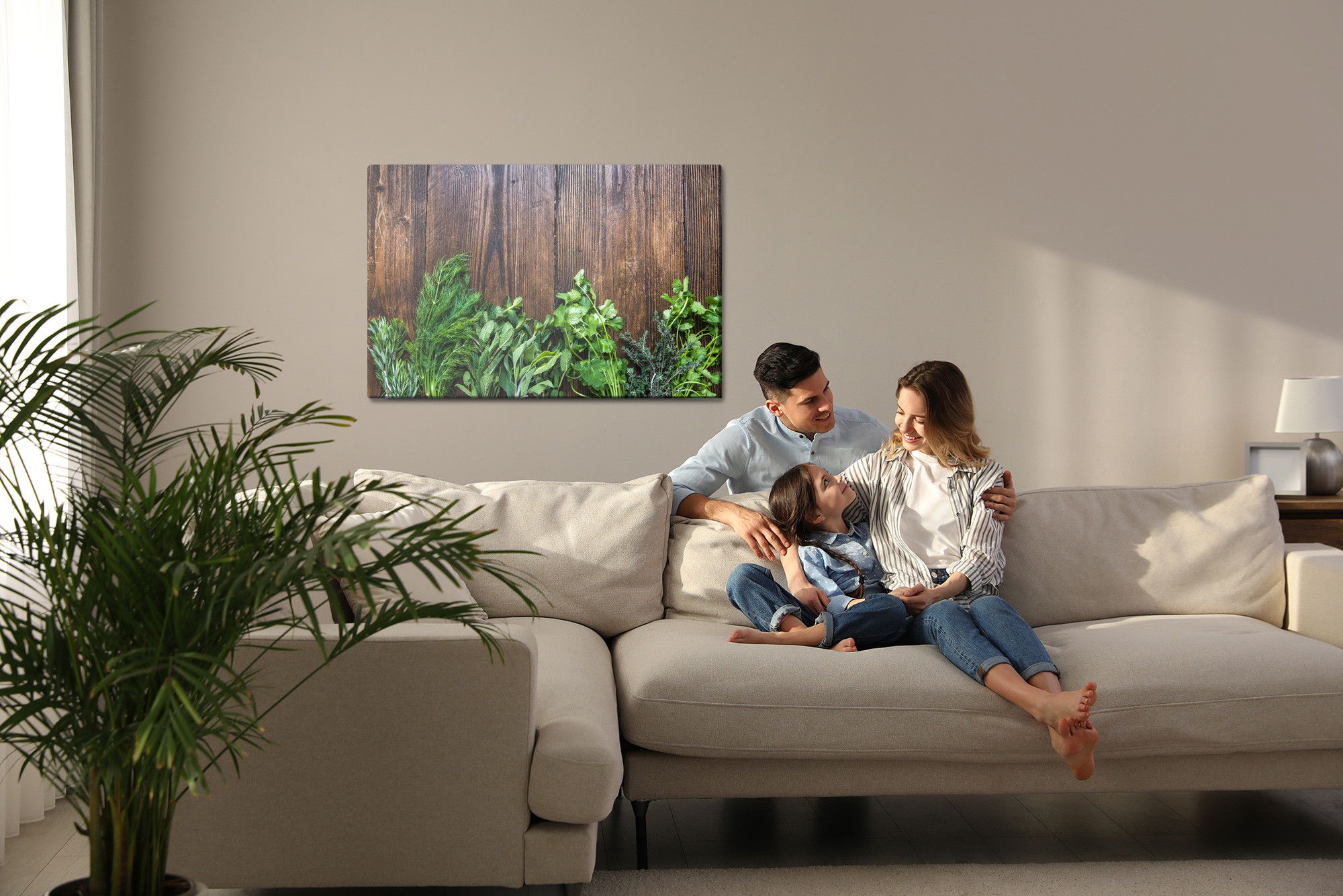 Varje tavla monteras på en massiv fururam. Format upp till 70×50 cm har en ram på 15 mm, medan format från 90×60 cm och uppåt har en ram på 20 mm. Den exakta dukspänningen gör att tavlan håller sin form över tid. Motivet Fresh herbs on wood trycks runt hela ramen vilket ger ett stilrent galleriuttryck där tavlan är lika vacker från sidan som framifrån. Kombinationen av rak dukspänning, rena linjer och korrekt tryck ger en professionell finish.